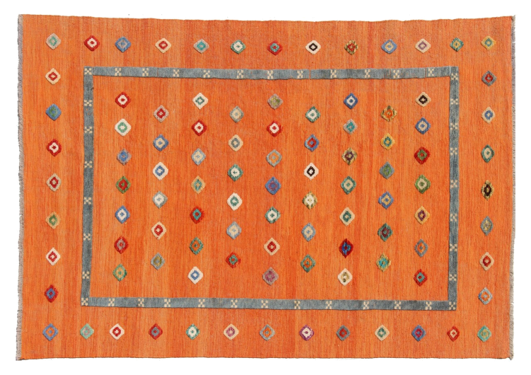 Esta alfombra fue hecha a mano en un telar como un tejido plano. Tejido plano es el término utilizado para describir las alfombras que no tienen pelo. Como el nombre promete, estas alfombras están tejidas y no anudadas. Esto resulta en una alfombra plana con una superficie estructurada. Los tejidos planos no son tan suaves y normalmente más delgados que las alfombras anudadas. Al mismo tiempo, su fabricación es mucho menos compleja y por lo general se pueden disponer por ambos lados (frontal y posterior). Sus patrones suelen ser geométricos, lo cual está determinado por el tejido.