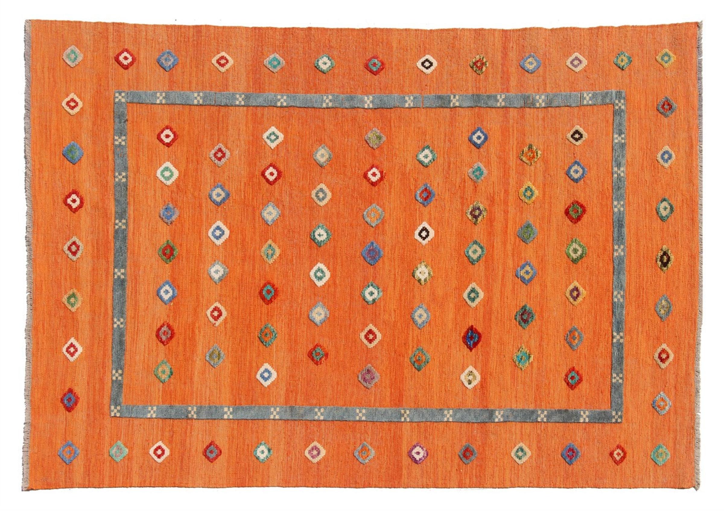 Estas alfombras kilim muestran una diferencia decisiva con las alfombras anudadas a mano - son tejidas a mano. Por lo tanto, no tienen un montón alto de lana y son a menudo más planos y más ásperos que las alfombras de lana anudada. Su fabricación es menos elaborada y por eso suelen ser mucho más baratas. Como ventaja, las alfombras de kilim son también mucho más ligeras y pueden ser colocadas por delante y por detrás. Los kilims tejidos a mano provienen originalmente de la antigua Persia y ahora también se fabrican a menudo en el Afganistán. Tienen patrones bastante simples y directos, que se deben a su técnica de tejido.