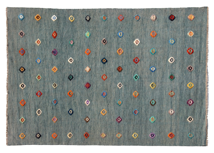 Esta alfombra fue hecha a mano en un telar como un tejido plano. Tejido plano es el término utilizado para describir las alfombras que no tienen pelo. Como el nombre promete, estas alfombras están tejidas y no anudadas. Esto resulta en una alfombra plana con una superficie estructurada. Los tejidos planos no son tan suaves y normalmente más delgados que las alfombras anudadas. Al mismo tiempo, su fabricación es mucho menos compleja y por lo general se pueden disponer por ambos lados (frontal y posterior). Sus patrones suelen ser geométricos, lo cual está determinado por el tejido.