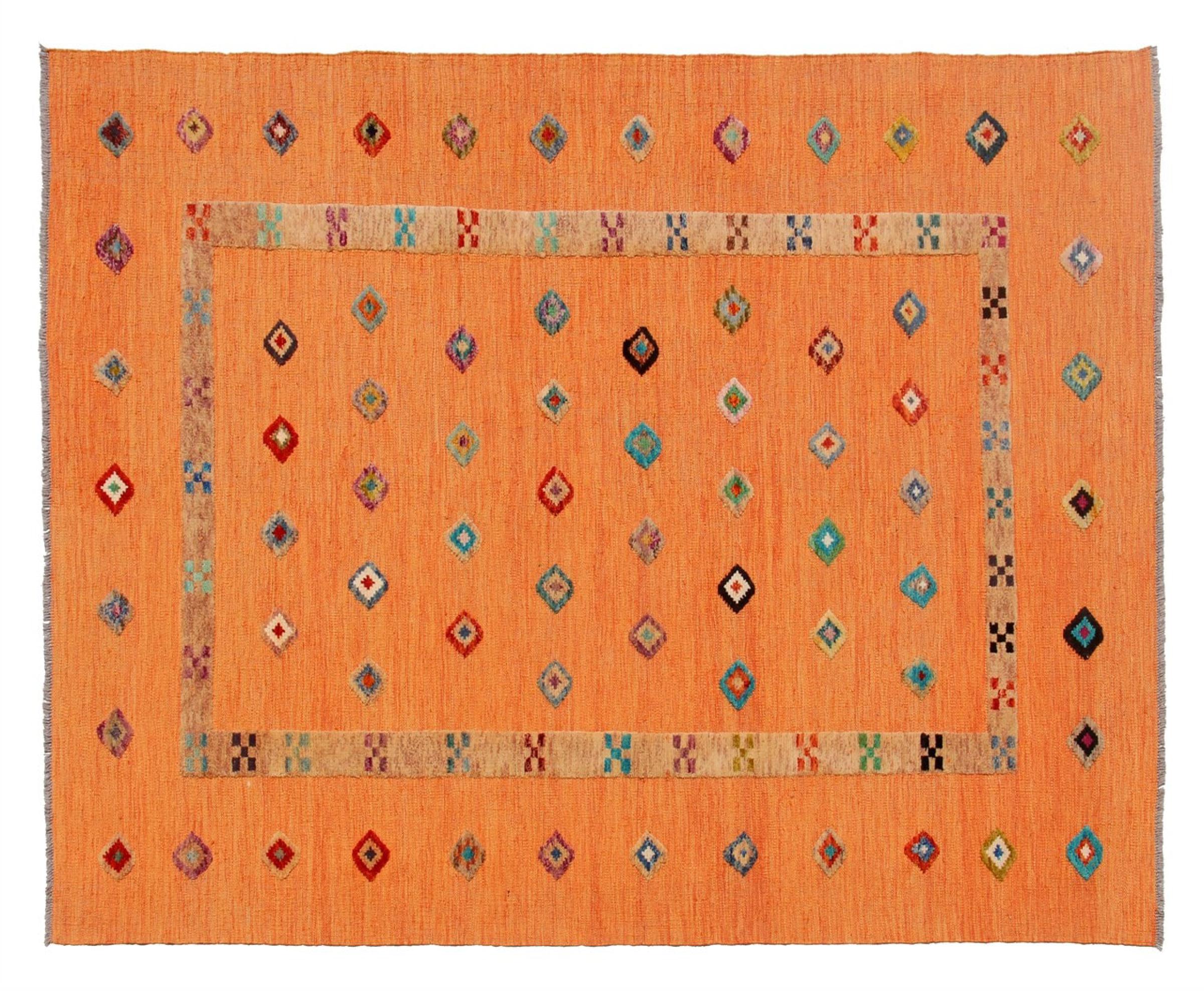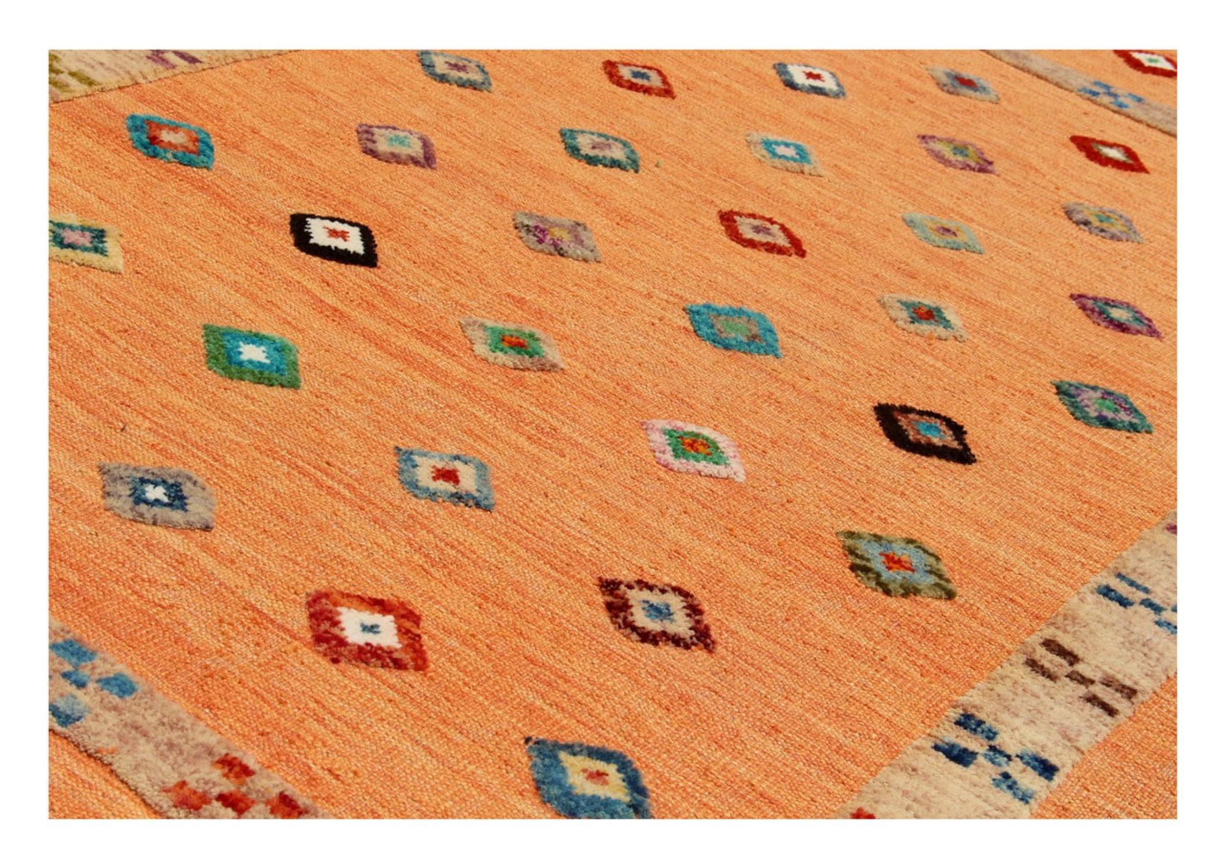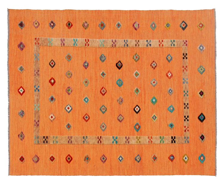 Esta alfombra fue hecha a mano en un telar como un tejido plano. Tejido plano es el término utilizado para describir las alfombras que no tienen pelo. Como el nombre promete, estas alfombras están tejidas y no anudadas. Esto resulta en una alfombra plana con una superficie estructurada. Los tejidos planos no son tan suaves y normalmente más delgados que las alfombras anudadas. Al mismo tiempo, su fabricación es mucho menos compleja y por lo general se pueden disponer por ambos lados (frontal y posterior). Sus patrones suelen ser geométricos, lo cual está determinado por el tejido.