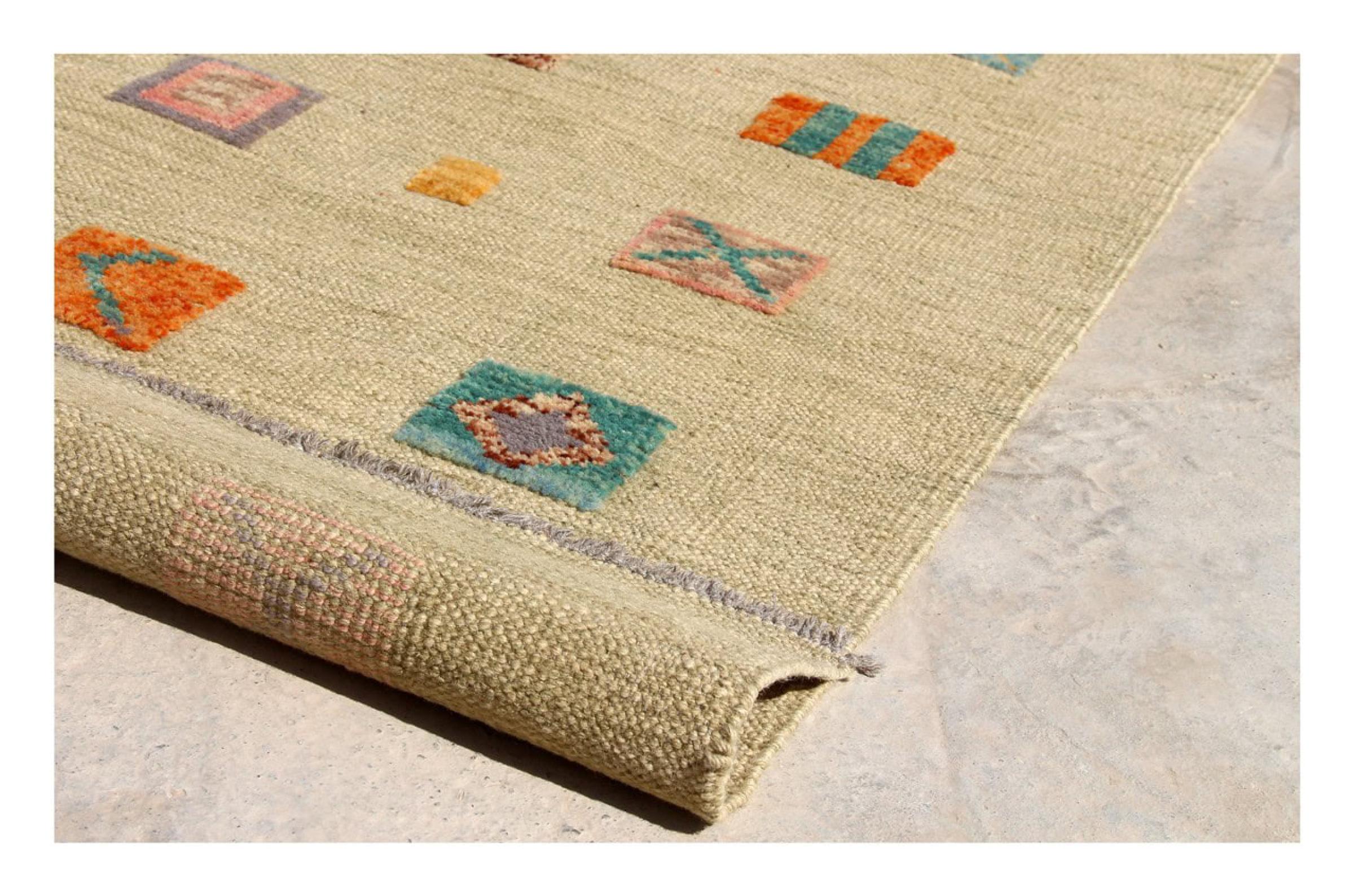 Estas alfombras kilim muestran una diferencia decisiva con las alfombras anudadas a mano - son tejidas a mano. Por lo tanto, no tienen un montón alto de lana y son a menudo más planos y más ásperos que las alfombras de lana anudada. Su fabricación es menos elaborada y por eso suelen ser mucho más baratas. Como ventaja, las alfombras de kilim son también mucho más ligeras y pueden ser colocadas por delante y por detrás. Los kilims tejidos a mano provienen originalmente de la antigua Persia y ahora también se fabrican a menudo en el Afganistán. Tienen patrones bastante simples y directos, que se deben a su técnica de tejido.