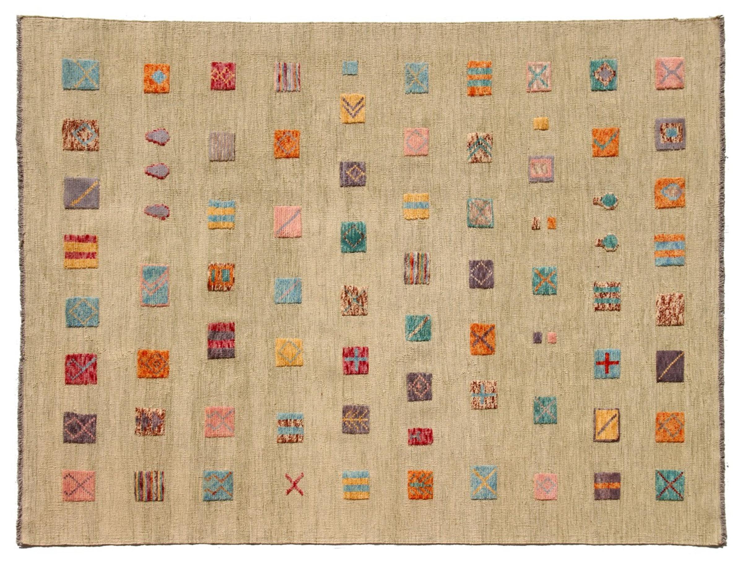 Esta alfombra fue hecha a mano en un telar como un tejido plano. Tejido plano es el término utilizado para describir las alfombras que no tienen pelo. Como el nombre promete, estas alfombras están tejidas y no anudadas. Esto resulta en una alfombra plana con una superficie estructurada. Los tejidos planos no son tan suaves y normalmente más delgados que las alfombras anudadas. Al mismo tiempo, su fabricación es mucho menos compleja y por lo general se pueden disponer por ambos lados (frontal y posterior). Sus patrones suelen ser geométricos, lo cual está determinado por el tejido.