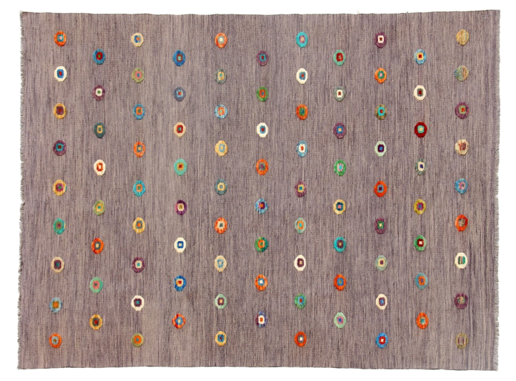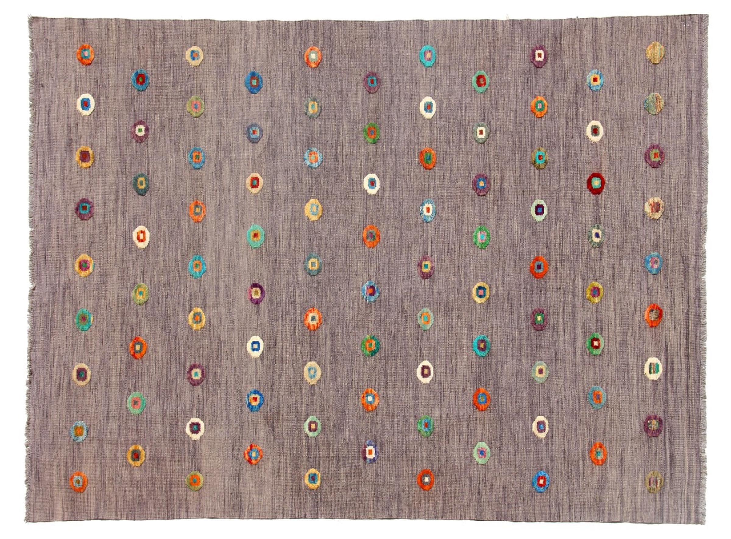 Esta alfombra fue hecha a mano en un telar como un tejido plano. Tejido plano es el término utilizado para describir las alfombras que no tienen pelo. Como el nombre promete, estas alfombras están tejidas y no anudadas. Esto resulta en una alfombra plana con una superficie estructurada. Los tejidos planos no son tan suaves y normalmente más delgados que las alfombras anudadas. Al mismo tiempo, su fabricación es mucho menos compleja y por lo general se pueden disponer por ambos lados (frontal y posterior). Sus patrones suelen ser geométricos, lo cual está determinado por el tejido.