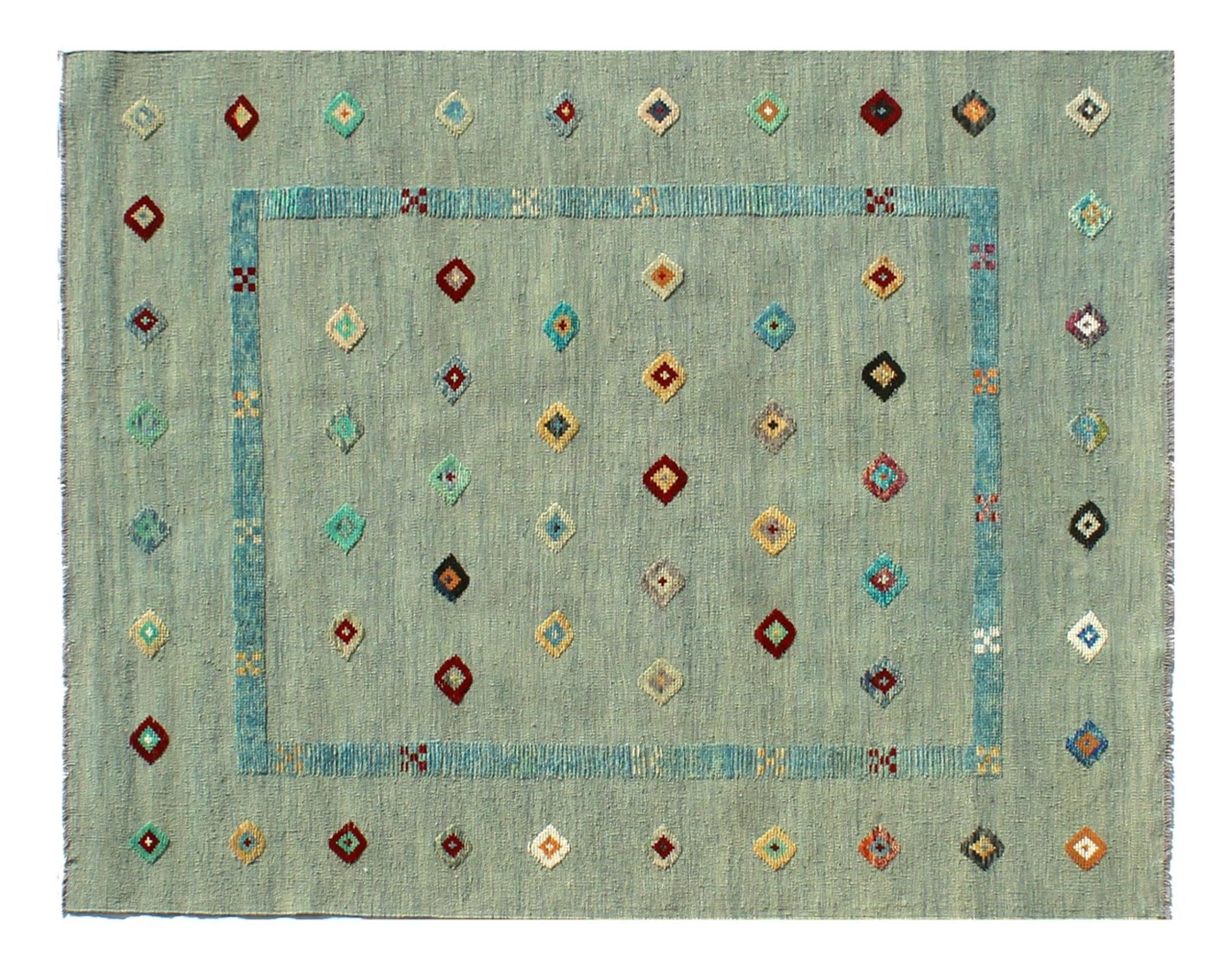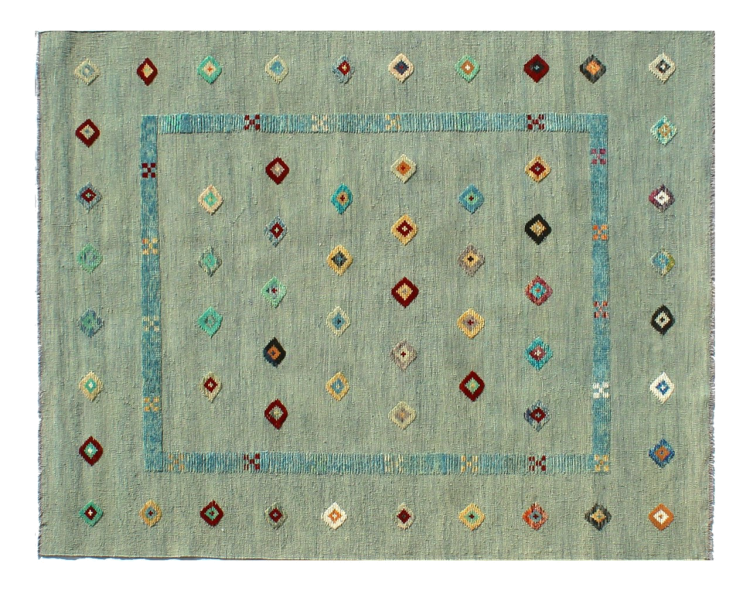 Esta alfombra fue hecha a mano en un telar como un tejido plano. Tejido plano es el término utilizado para describir las alfombras que no tienen pelo. Como el nombre promete, estas alfombras están tejidas y no anudadas. Esto resulta en una alfombra plana con una superficie estructurada. Los tejidos planos no son tan suaves y normalmente más delgados que las alfombras anudadas. Al mismo tiempo, su fabricación es mucho menos compleja y por lo general se pueden disponer por ambos lados (frontal y posterior). Sus patrones suelen ser geométricos, lo cual está determinado por el tejido.