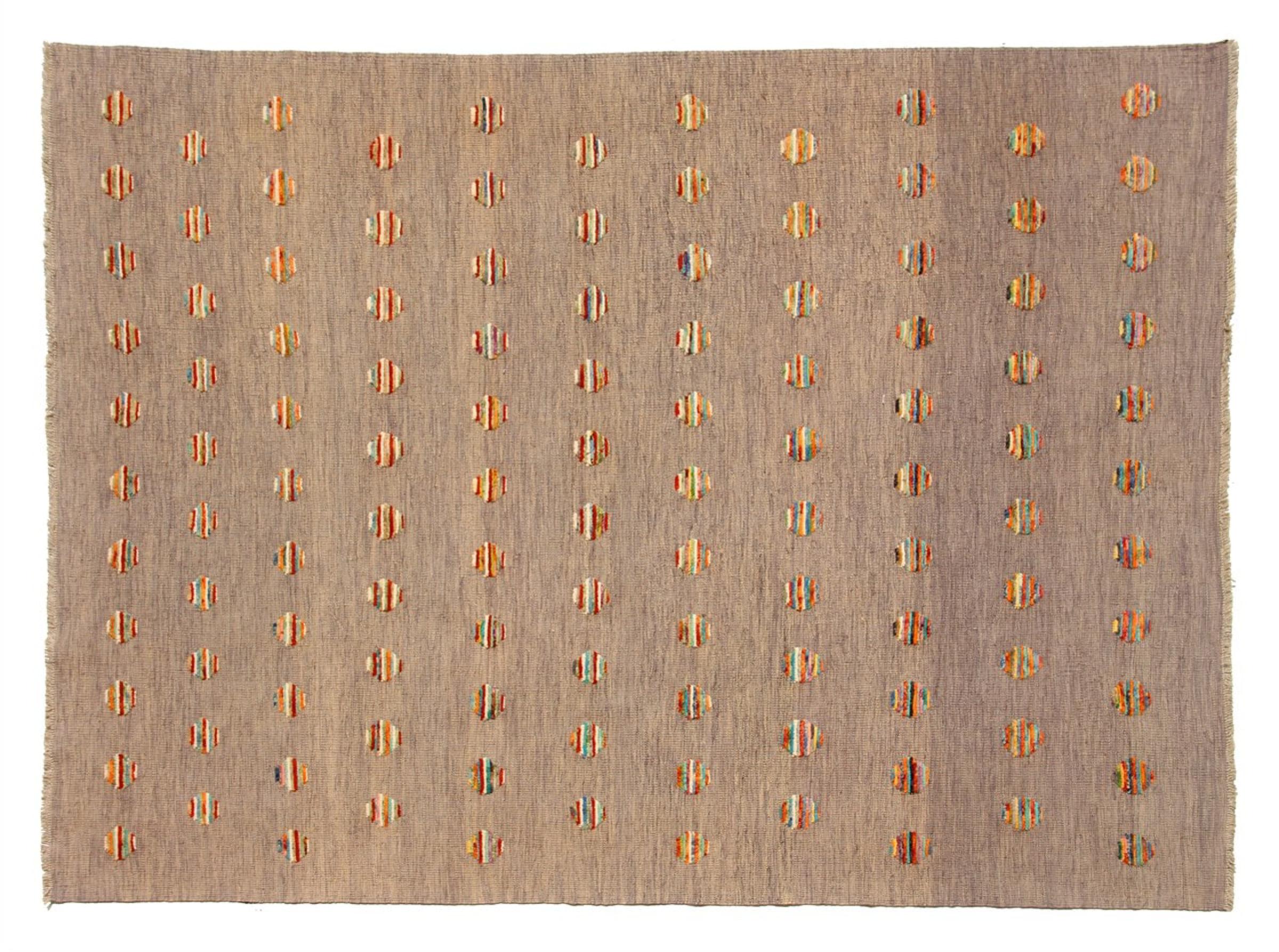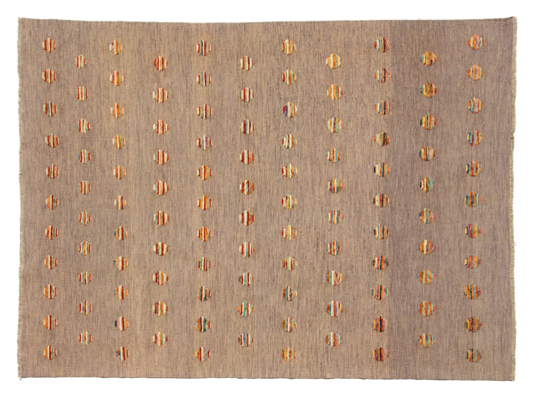 Esta alfombra fue hecha a mano en un telar como un tejido plano. Tejido plano es el término utilizado para describir las alfombras que no tienen pelo. Como el nombre promete, estas alfombras están tejidas y no anudadas. Esto resulta en una alfombra plana con una superficie estructurada. Los tejidos planos no son tan suaves y normalmente más delgados que las alfombras anudadas. Al mismo tiempo, su fabricación es mucho menos compleja y por lo general se pueden disponer por ambos lados (frontal y posterior). Sus patrones suelen ser geométricos, lo cual está determinado por el tejido.