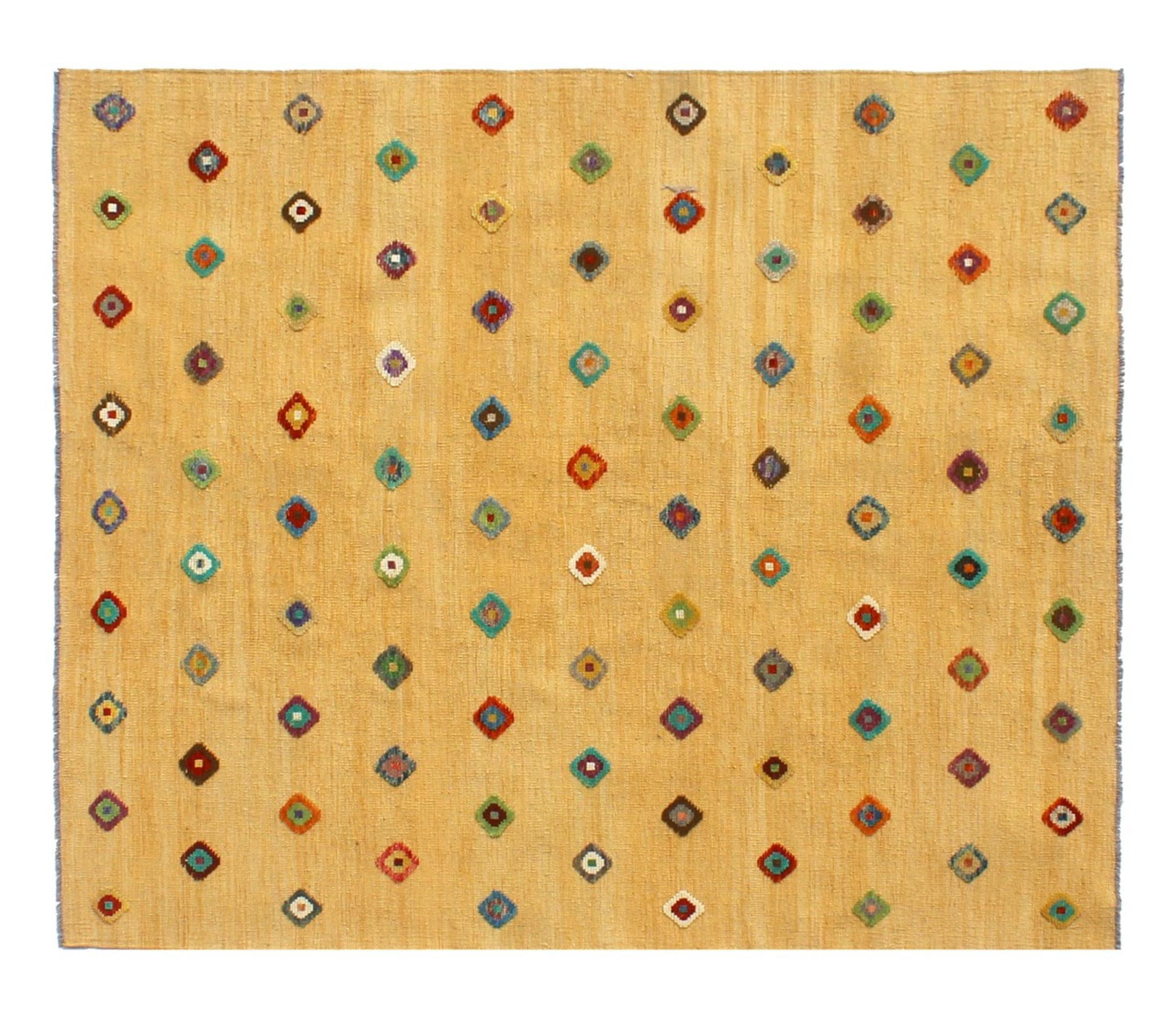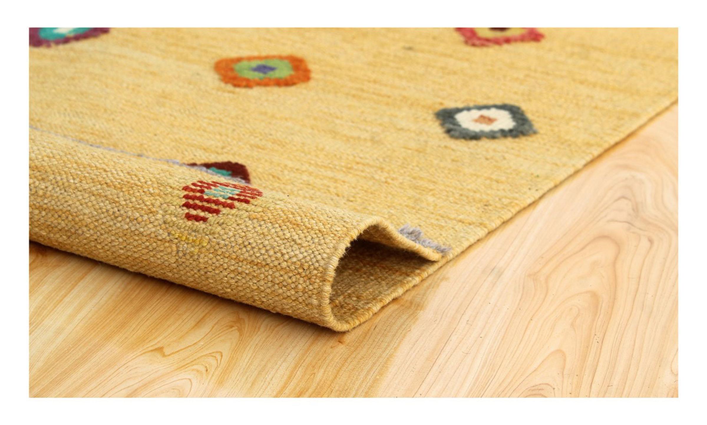 Esta alfombra fue hecha a mano en un telar como un tejido plano. Tejido plano es el término utilizado para describir las alfombras que no tienen pelo. Como el nombre promete, estas alfombras están tejidas y no anudadas. Esto resulta en una alfombra plana con una superficie estructurada. Los tejidos planos no son tan suaves y normalmente más delgados que las alfombras anudadas. Al mismo tiempo, su fabricación es mucho menos compleja y por lo general se pueden disponer por ambos lados (frontal y posterior). Sus patrones suelen ser geométricos, lo cual está determinado por el tejido.