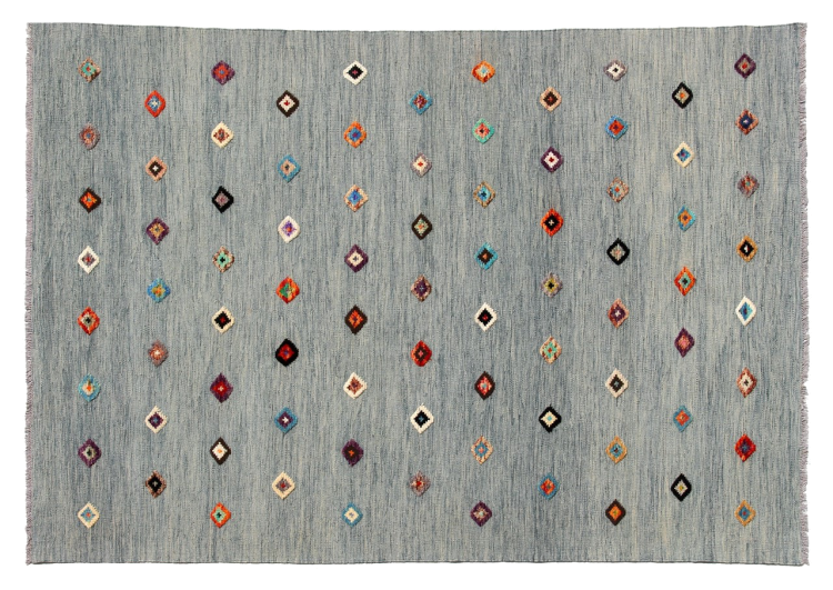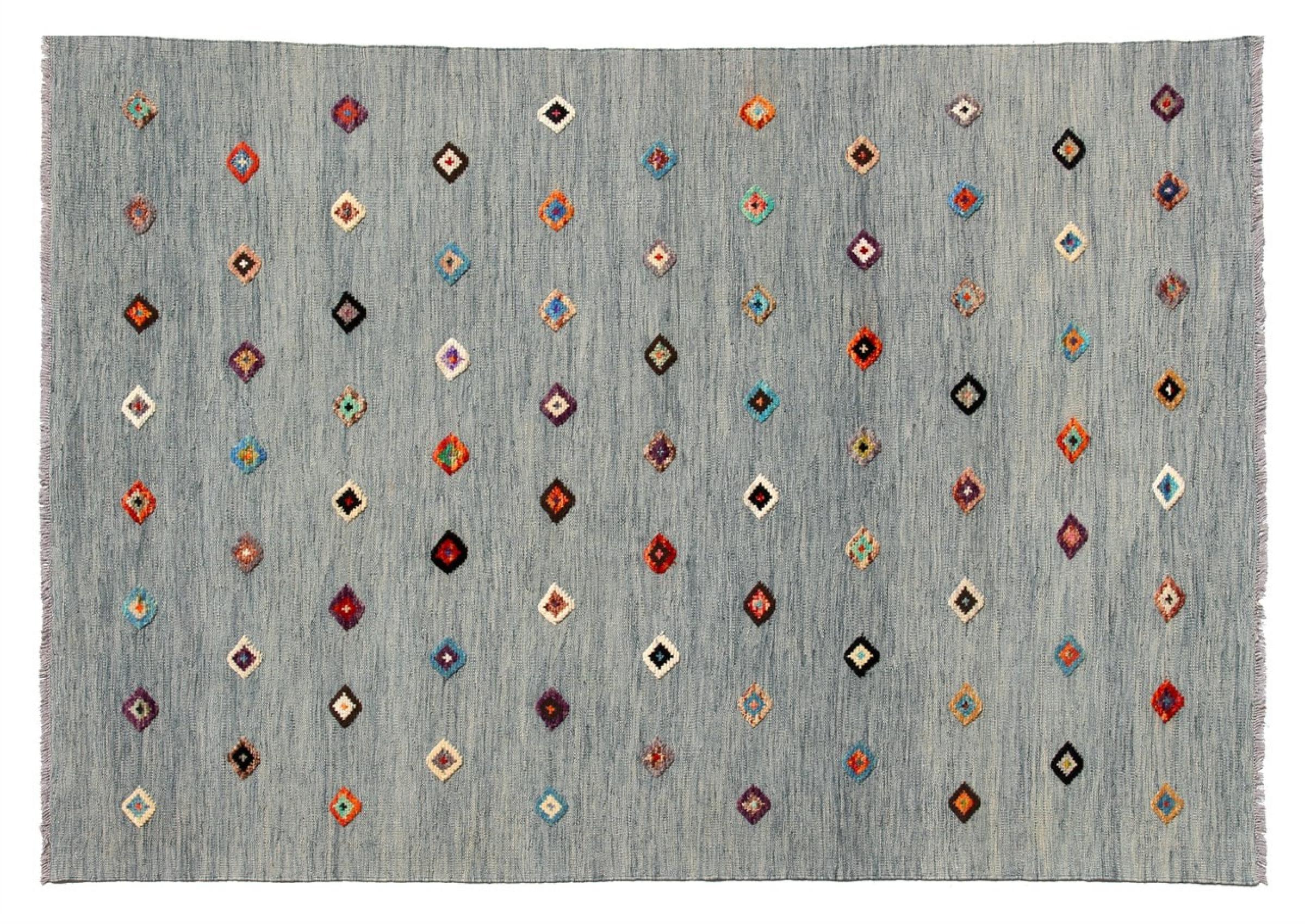 Esta alfombra fue hecha a mano en un telar como un tejido plano. Tejido plano es el término utilizado para describir las alfombras que no tienen pelo. Como el nombre promete, estas alfombras están tejidas y no anudadas. Esto resulta en una alfombra plana con una superficie estructurada. Los tejidos planos no son tan suaves y normalmente más delgados que las alfombras anudadas. Al mismo tiempo, su fabricación es mucho menos compleja y por lo general se pueden disponer por ambos lados (frontal y posterior). Sus patrones suelen ser geométricos, lo cual está determinado por el tejido.