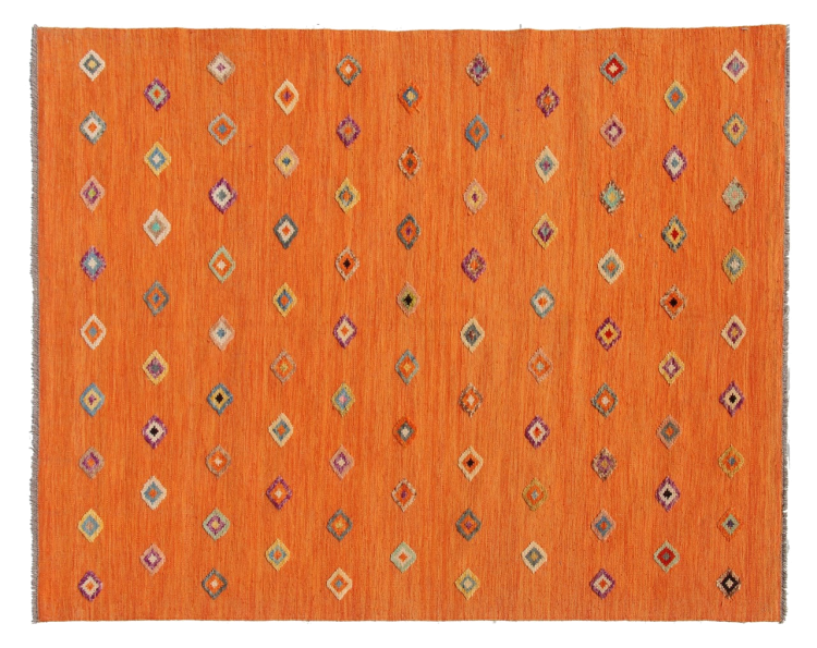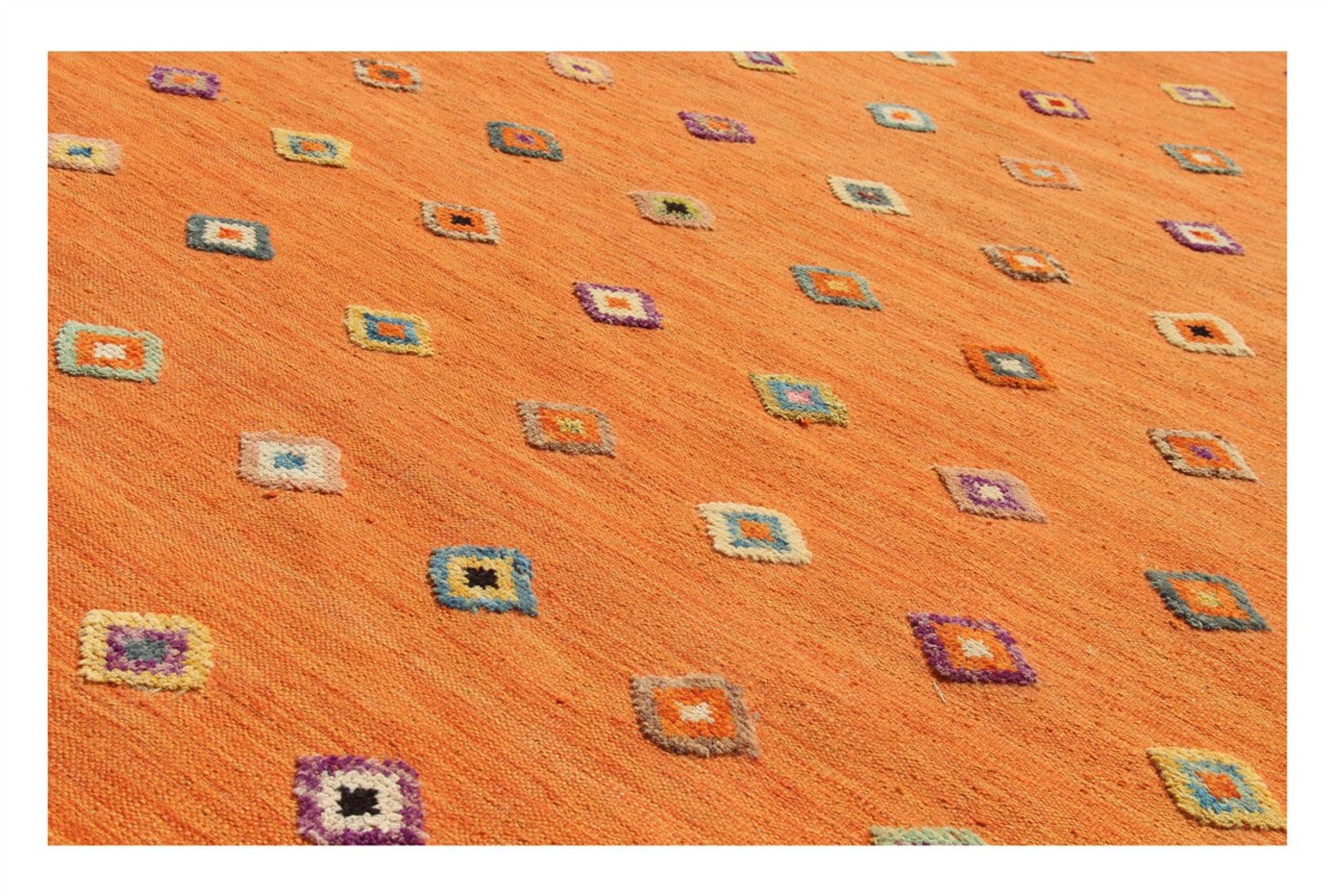 Esta alfombra fue hecha a mano en un telar como un tejido plano. Tejido plano es el término utilizado para describir las alfombras que no tienen pelo. Como el nombre promete, estas alfombras están tejidas y no anudadas. Esto resulta en una alfombra plana con una superficie estructurada. Los tejidos planos no son tan suaves y normalmente más delgados que las alfombras anudadas. Al mismo tiempo, su fabricación es mucho menos compleja y por lo general se pueden disponer por ambos lados (frontal y posterior). Sus patrones suelen ser geométricos, lo cual está determinado por el tejido.