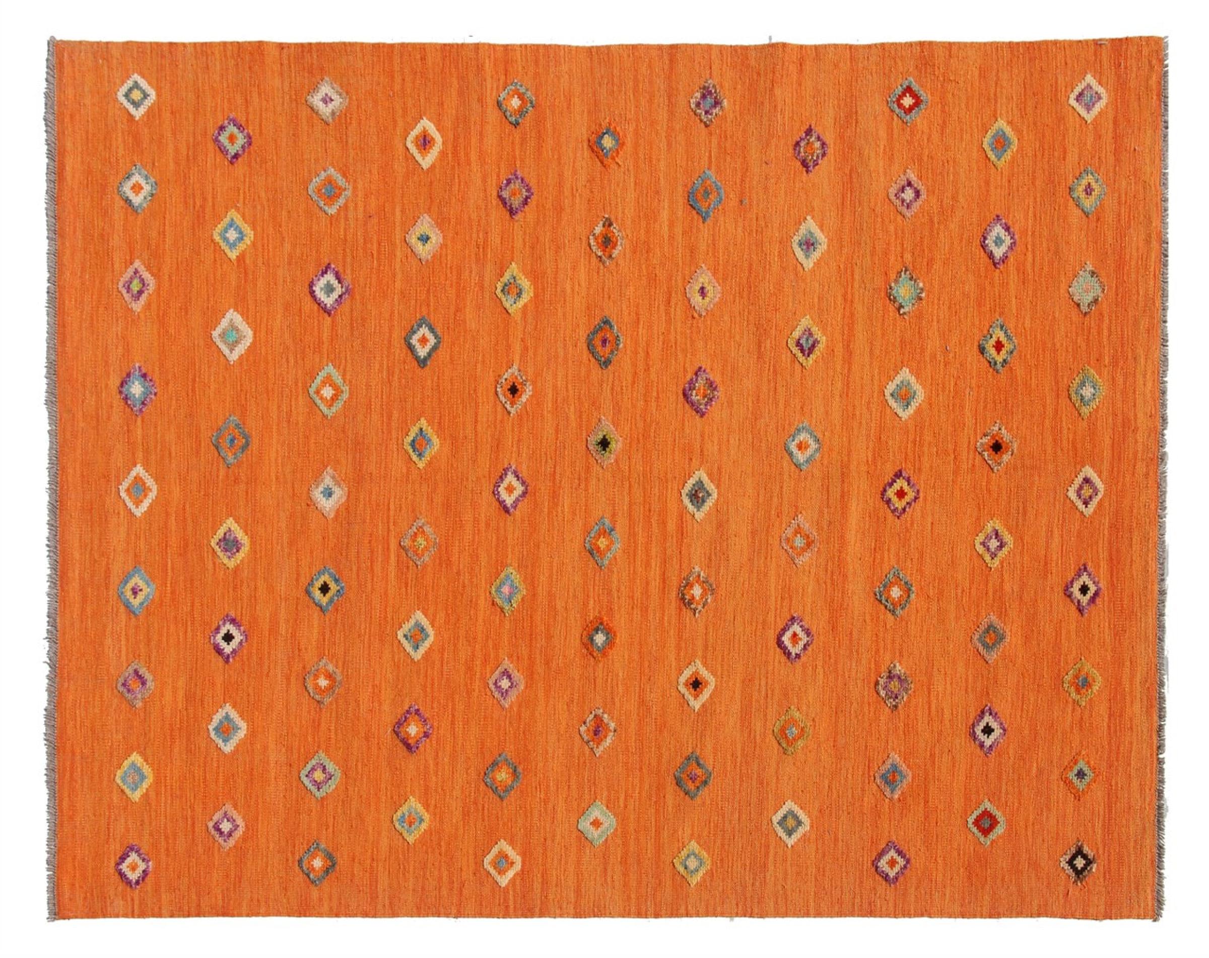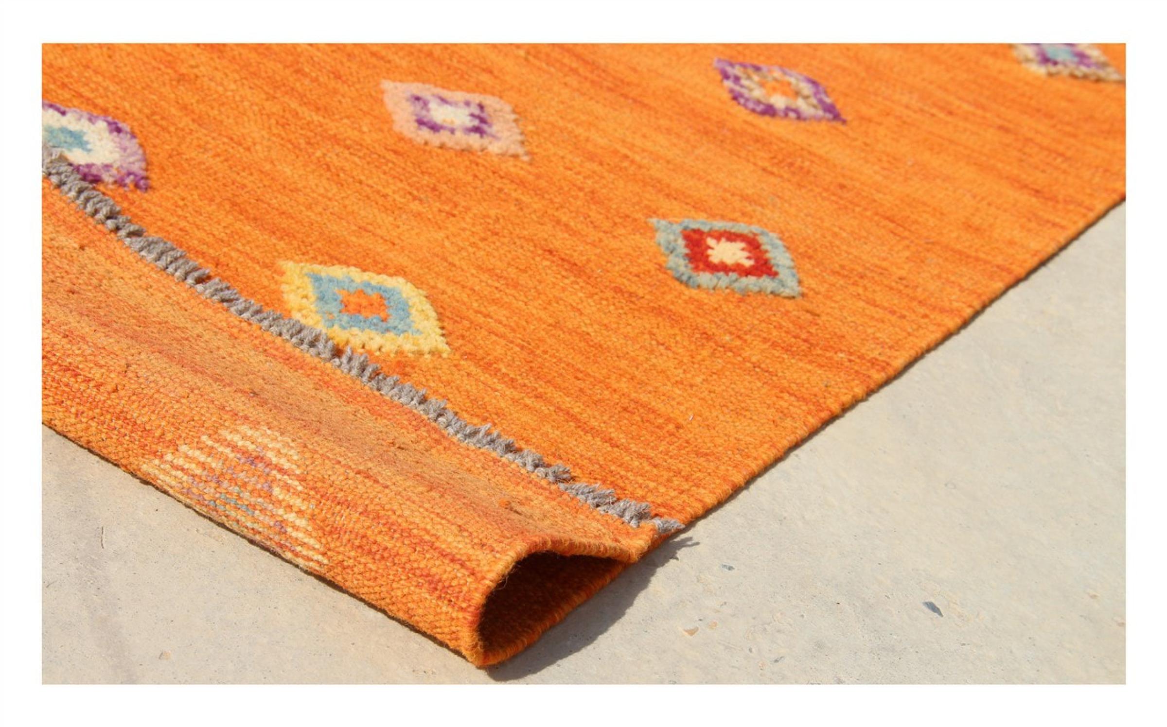 Estas alfombras kilim muestran una diferencia decisiva con las alfombras anudadas a mano - son tejidas a mano. Por lo tanto, no tienen un montón alto de lana y son a menudo más planos y más ásperos que las alfombras de lana anudada. Su fabricación es menos elaborada y por eso suelen ser mucho más baratas. Como ventaja, las alfombras de kilim son también mucho más ligeras y pueden ser colocadas por delante y por detrás. Los kilims tejidos a mano provienen originalmente de la antigua Persia y ahora también se fabrican a menudo en el Afganistán. Tienen patrones bastante simples y directos, que se deben a su técnica de tejido.