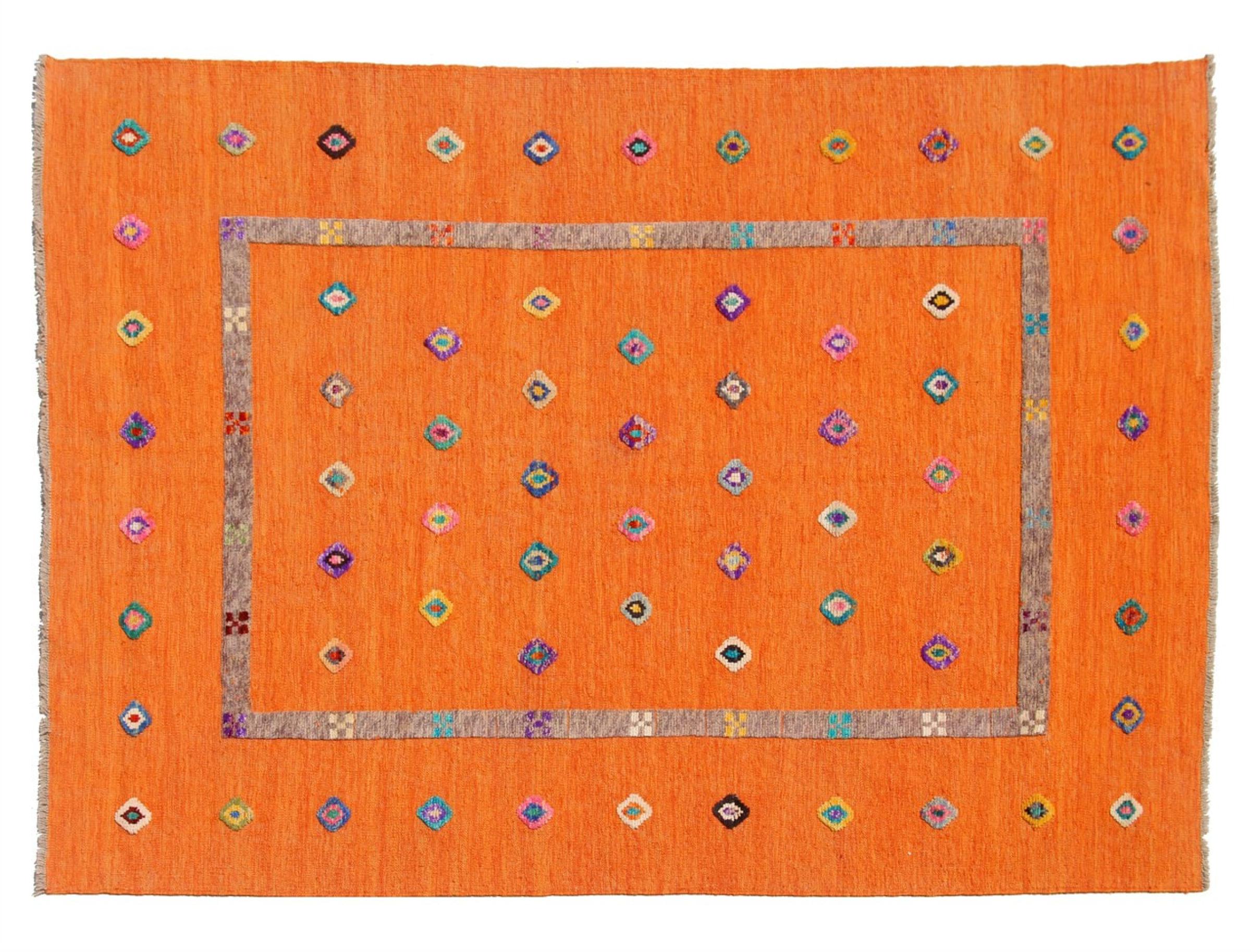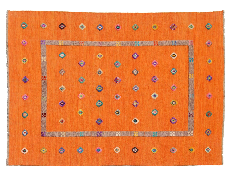 Esta alfombra fue hecha a mano en un telar como un tejido plano. Tejido plano es el término utilizado para describir las alfombras que no tienen pelo. Como el nombre promete, estas alfombras están tejidas y no anudadas. Esto resulta en una alfombra plana con una superficie estructurada. Los tejidos planos no son tan suaves y normalmente más delgados que las alfombras anudadas. Al mismo tiempo, su fabricación es mucho menos compleja y por lo general se pueden disponer por ambos lados (frontal y posterior). Sus patrones suelen ser geométricos, lo cual está determinado por el tejido.