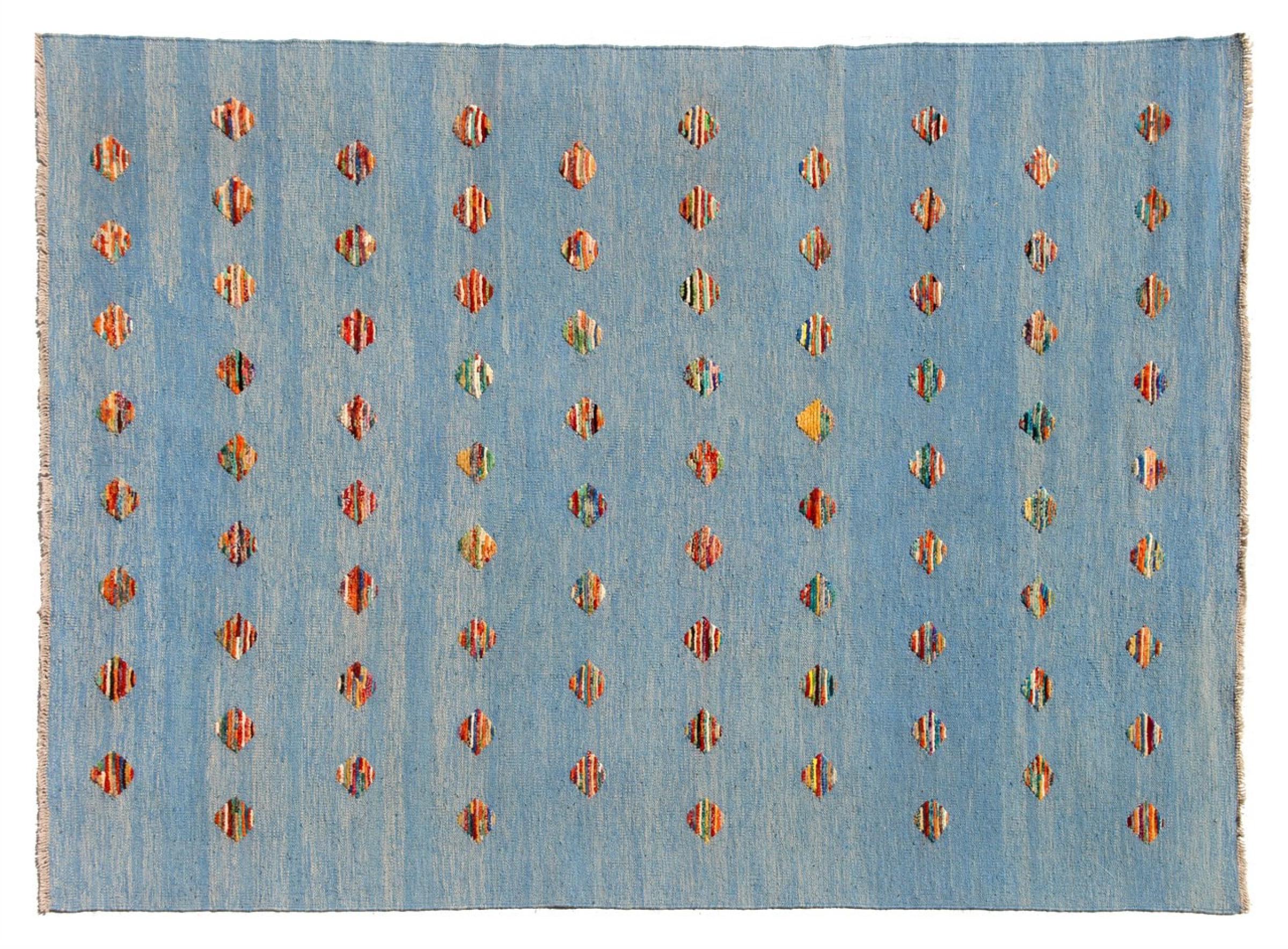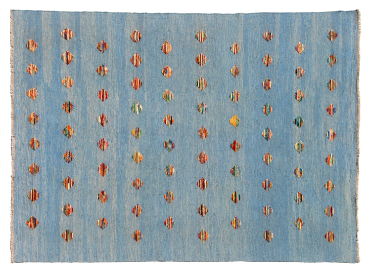 Esta alfombra fue hecha a mano en un telar como un tejido plano. Tejido plano es el término utilizado para describir las alfombras que no tienen pelo. Como el nombre promete, estas alfombras están tejidas y no anudadas. Esto resulta en una alfombra plana con una superficie estructurada. Los tejidos planos no son tan suaves y normalmente más delgados que las alfombras anudadas. Al mismo tiempo, su fabricación es mucho menos compleja y por lo general se pueden disponer por ambos lados (frontal y posterior). Sus patrones suelen ser geométricos, lo cual está determinado por el tejido.