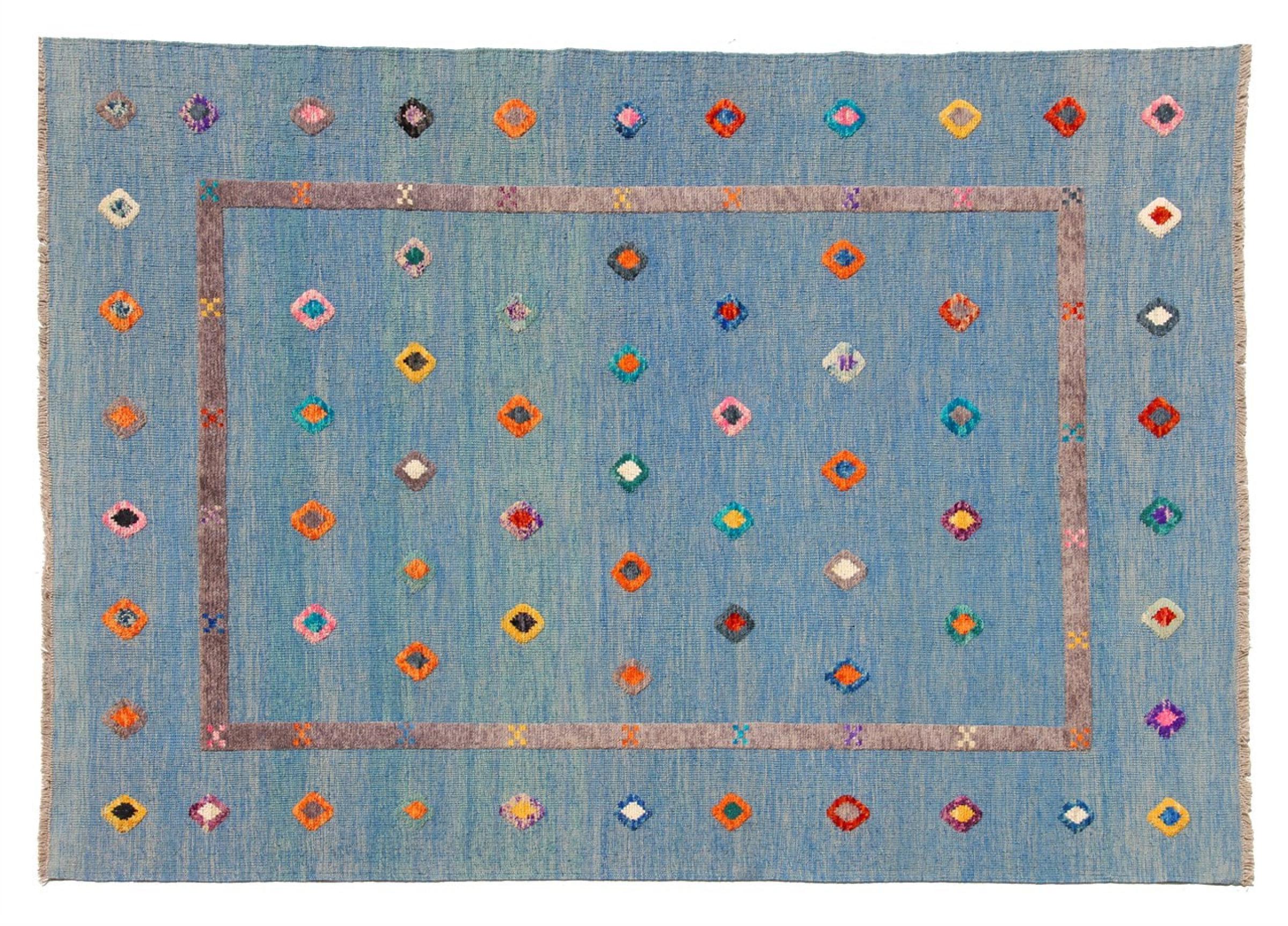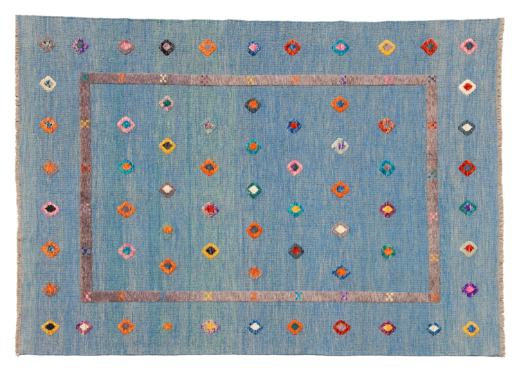 Esta alfombra fue hecha a mano en un telar como un tejido plano. Tejido plano es el término utilizado para describir las alfombras que no tienen pelo. Como el nombre promete, estas alfombras están tejidas y no anudadas. Esto resulta en una alfombra plana con una superficie estructurada. Los tejidos planos no son tan suaves y normalmente más delgados que las alfombras anudadas. Al mismo tiempo, su fabricación es mucho menos compleja y por lo general se pueden disponer por ambos lados (frontal y posterior). Sus patrones suelen ser geométricos, lo cual está determinado por el tejido.