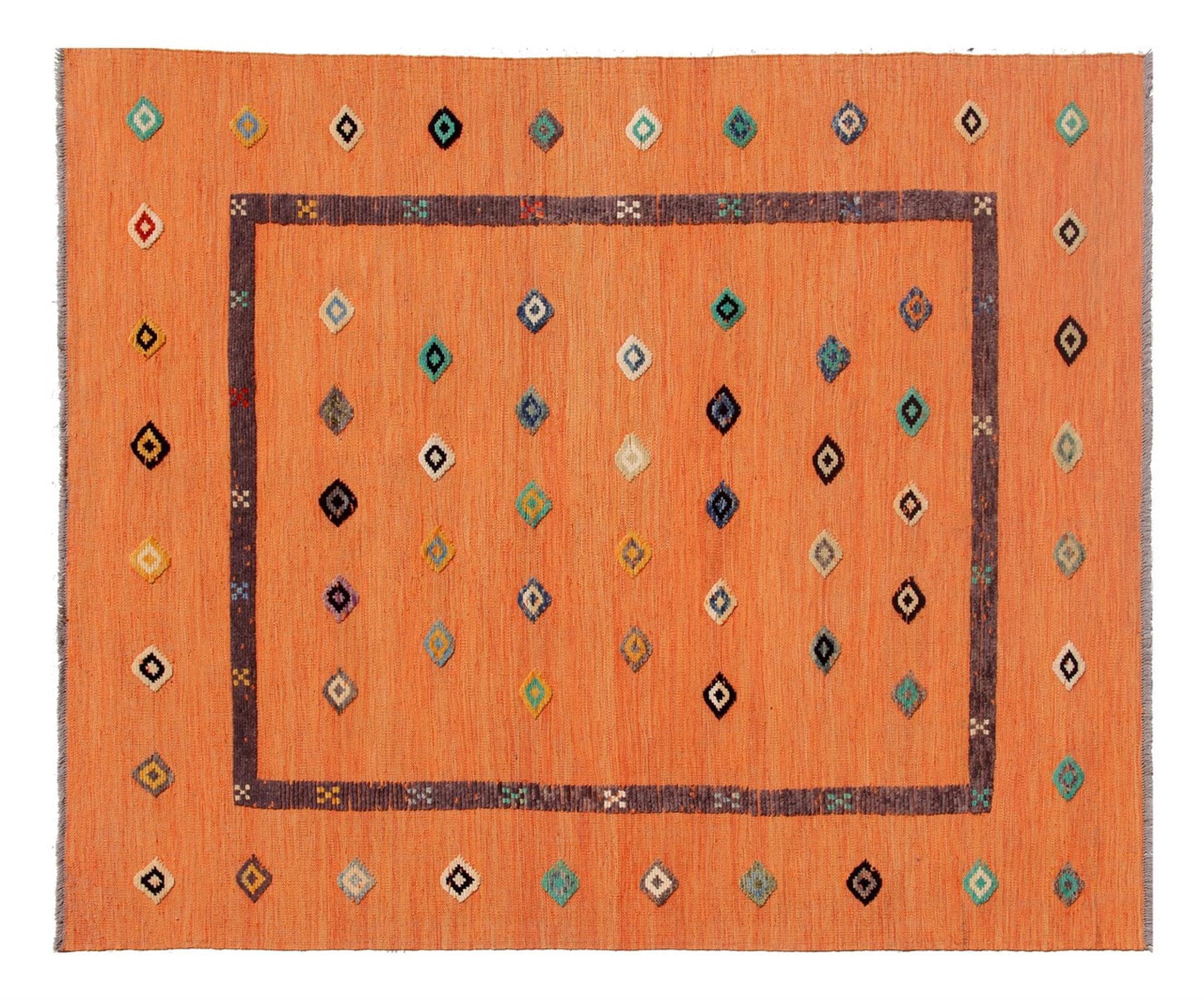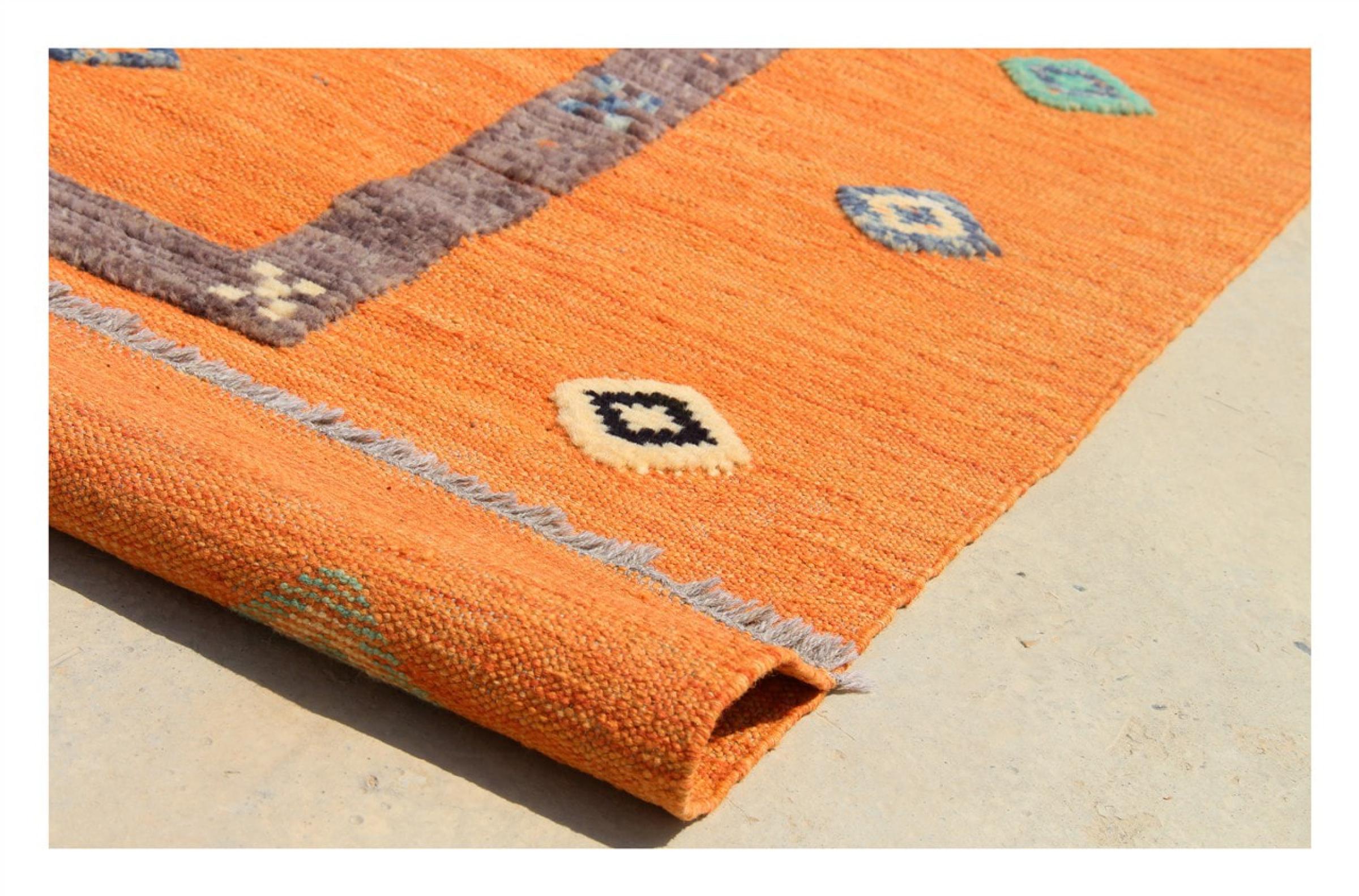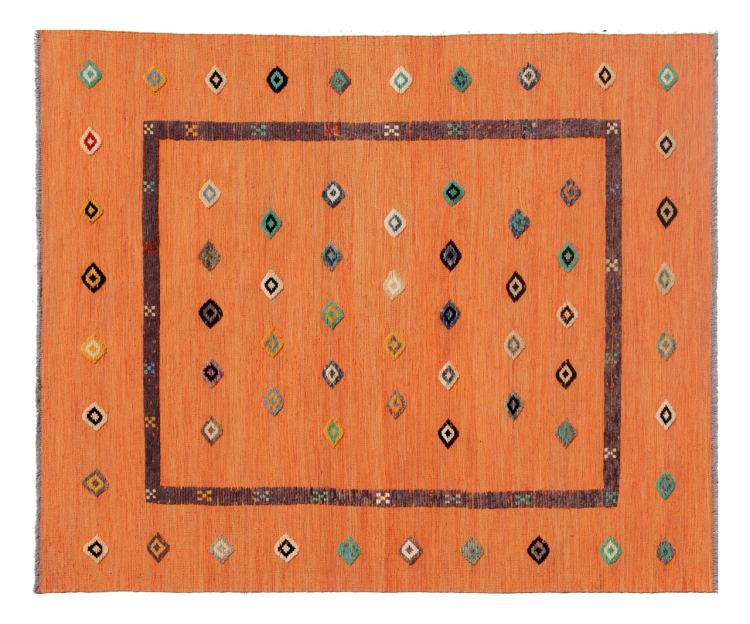 Esta alfombra fue hecha a mano en un telar como un tejido plano. Tejido plano es el término utilizado para describir las alfombras que no tienen pelo. Como el nombre promete, estas alfombras están tejidas y no anudadas. Esto resulta en una alfombra plana con una superficie estructurada. Los tejidos planos no son tan suaves y normalmente más delgados que las alfombras anudadas. Al mismo tiempo, su fabricación es mucho menos compleja y por lo general se pueden disponer por ambos lados (frontal y posterior). Sus patrones suelen ser geométricos, lo cual está determinado por el tejido.