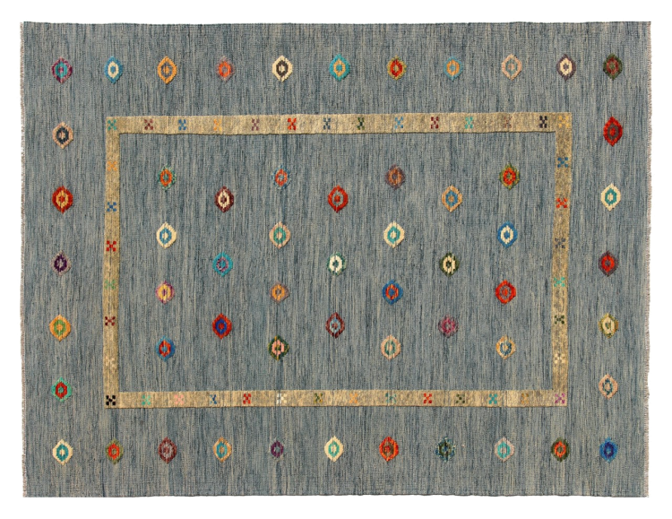 Esta alfombra fue hecha a mano en un telar como un tejido plano. Tejido plano es el término utilizado para describir las alfombras que no tienen pelo. Como el nombre promete, estas alfombras están tejidas y no anudadas. Esto resulta en una alfombra plana con una superficie estructurada. Los tejidos planos no son tan suaves y normalmente más delgados que las alfombras anudadas. Al mismo tiempo, su fabricación es mucho menos compleja y por lo general se pueden disponer por ambos lados (frontal y posterior). Sus patrones suelen ser geométricos, lo cual está determinado por el tejido.