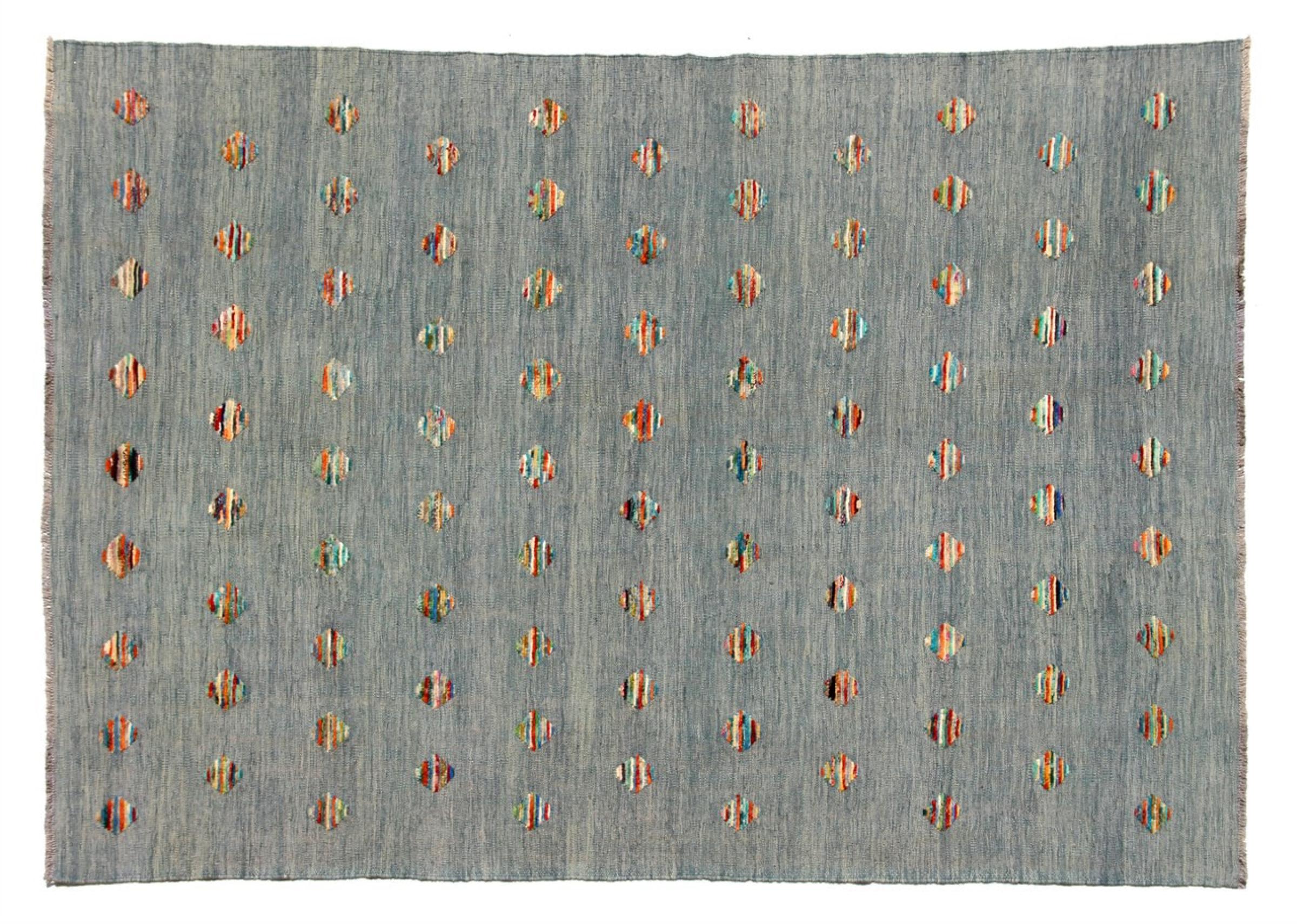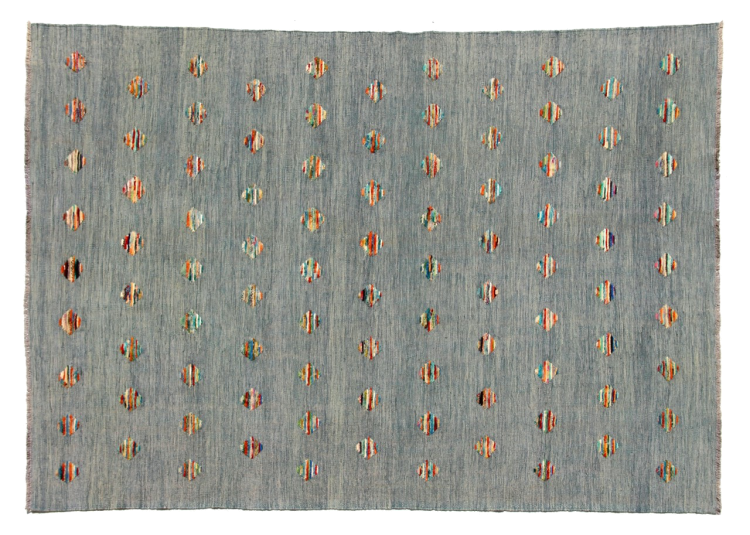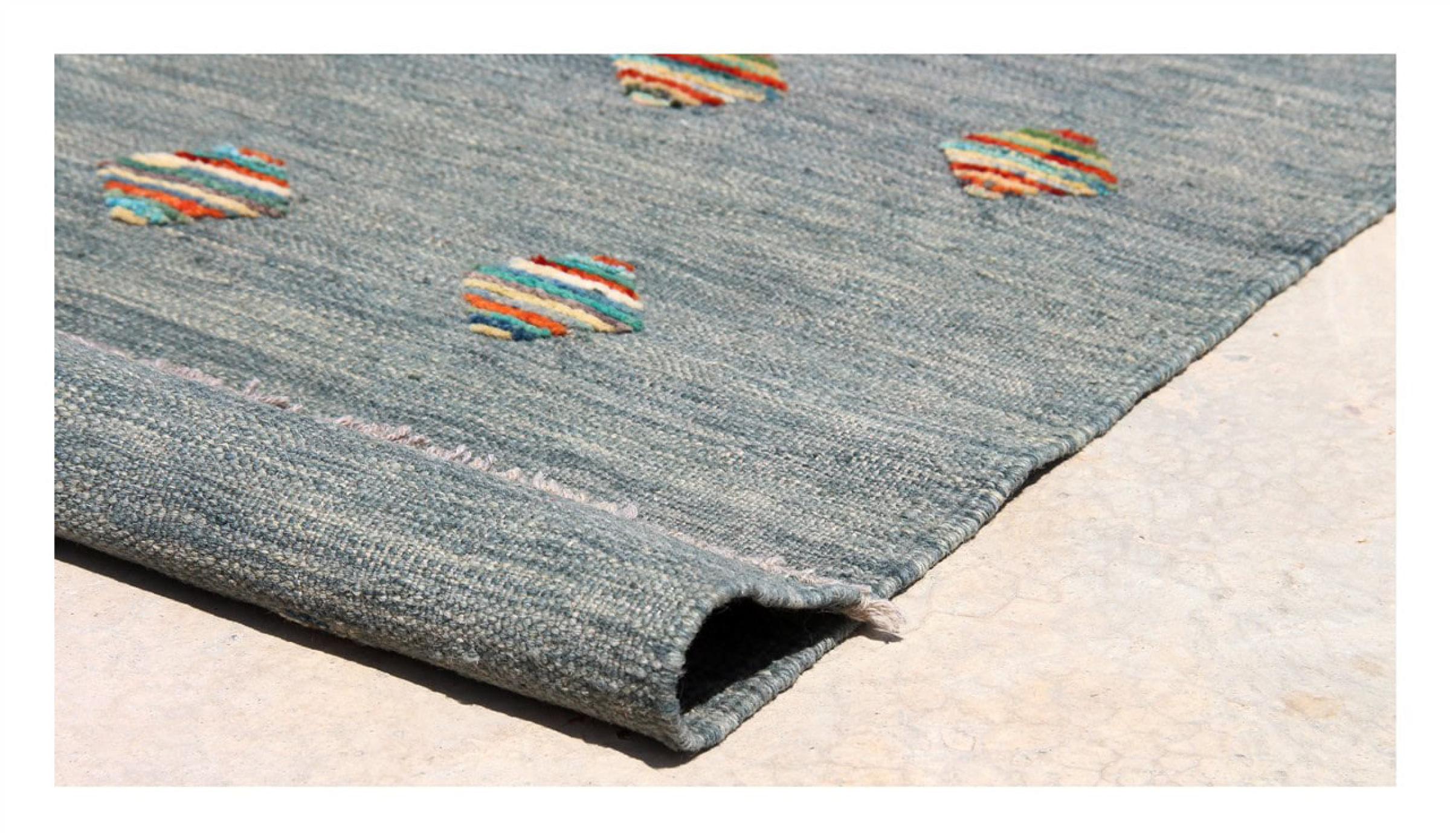 Esta alfombra fue hecha a mano en un telar como un tejido plano. Tejido plano es el término utilizado para describir las alfombras que no tienen pelo. Como el nombre promete, estas alfombras están tejidas y no anudadas. Esto resulta en una alfombra plana con una superficie estructurada. Los tejidos planos no son tan suaves y normalmente más delgados que las alfombras anudadas. Al mismo tiempo, su fabricación es mucho menos compleja y por lo general se pueden disponer por ambos lados (frontal y posterior). Sus patrones suelen ser geométricos, lo cual está determinado por el tejido.