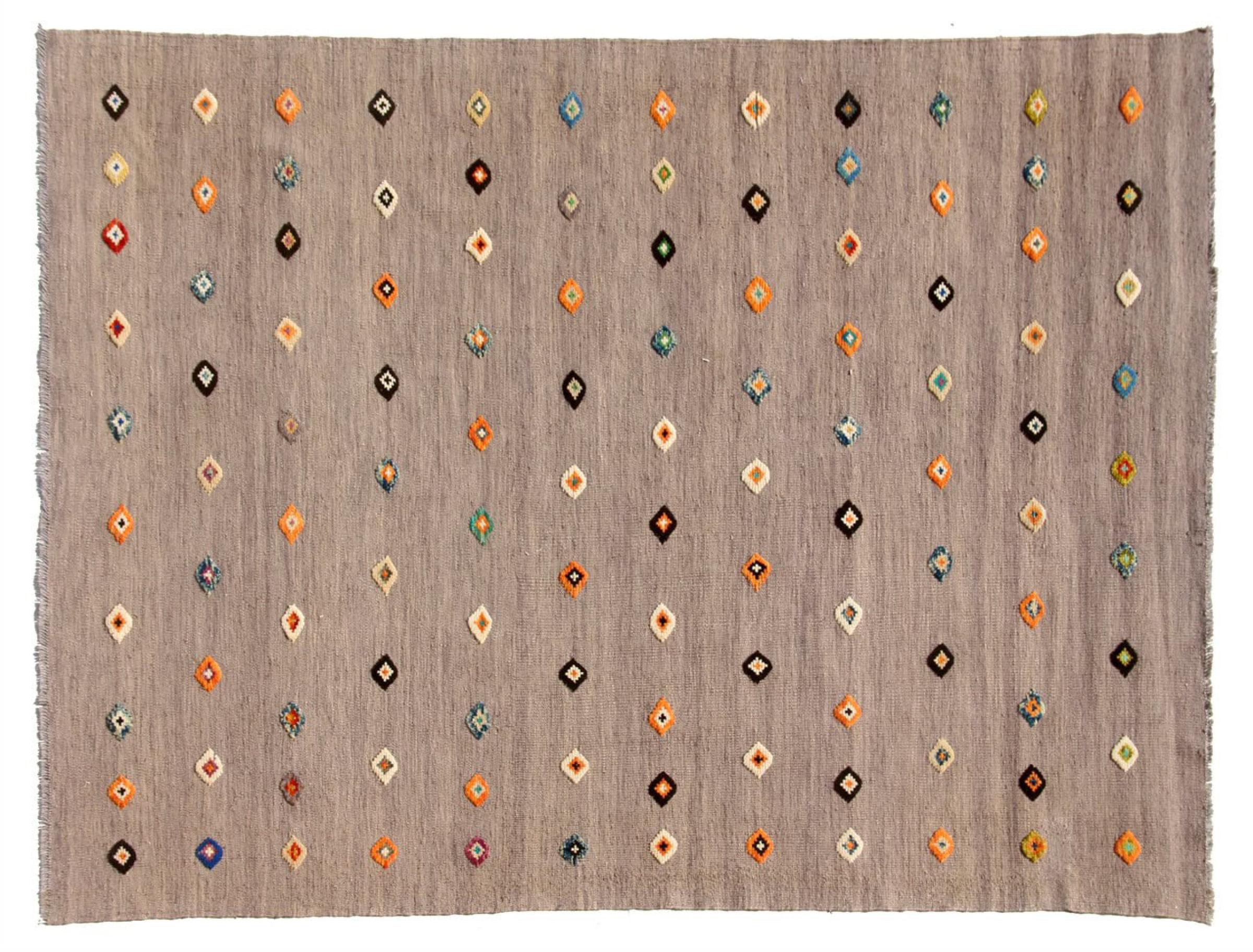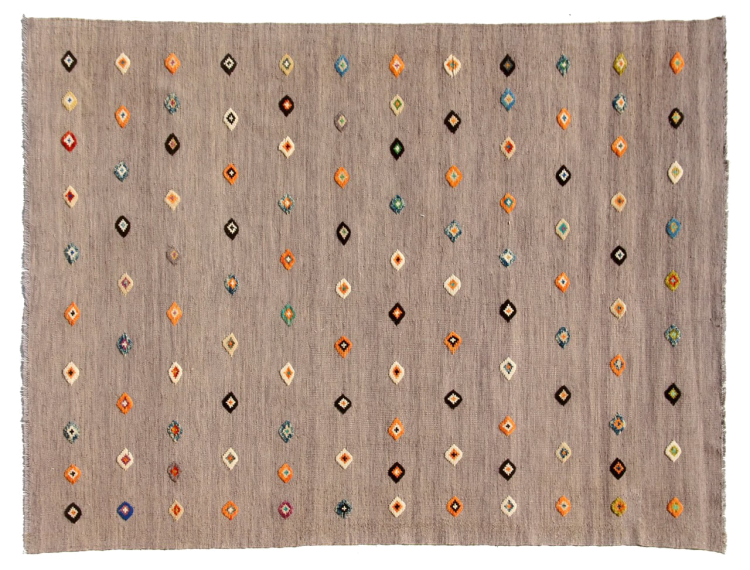 Esta alfombra fue hecha a mano en un telar como un tejido plano. Tejido plano es el término utilizado para describir las alfombras que no tienen pelo. Como el nombre promete, estas alfombras están tejidas y no anudadas. Esto resulta en una alfombra plana con una superficie estructurada. Los tejidos planos no son tan suaves y normalmente más delgados que las alfombras anudadas. Al mismo tiempo, su fabricación es mucho menos compleja y por lo general se pueden disponer por ambos lados (frontal y posterior). Sus patrones suelen ser geométricos, lo cual está determinado por el tejido.