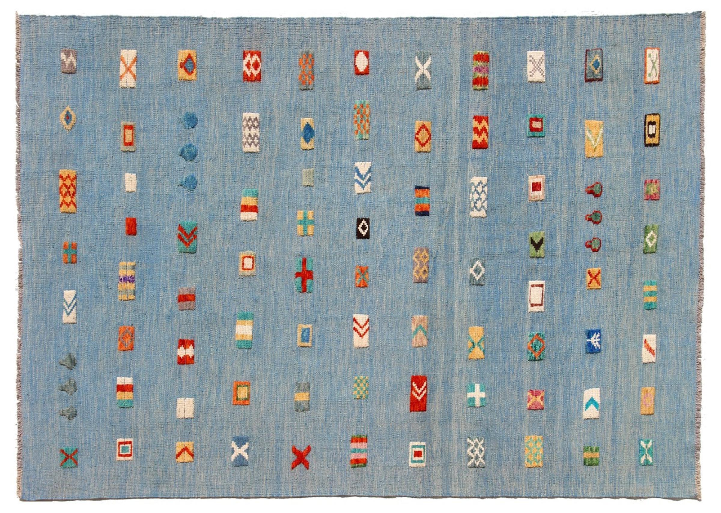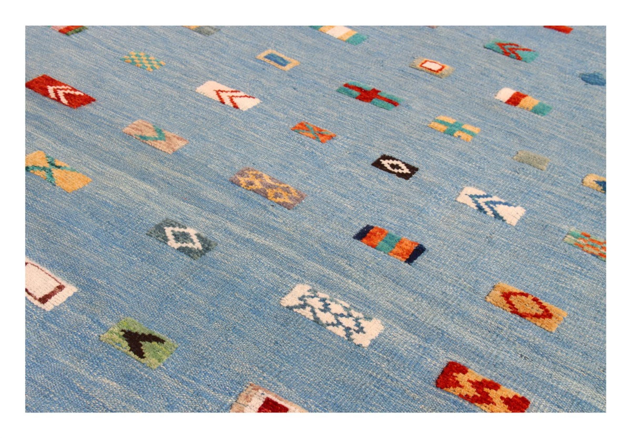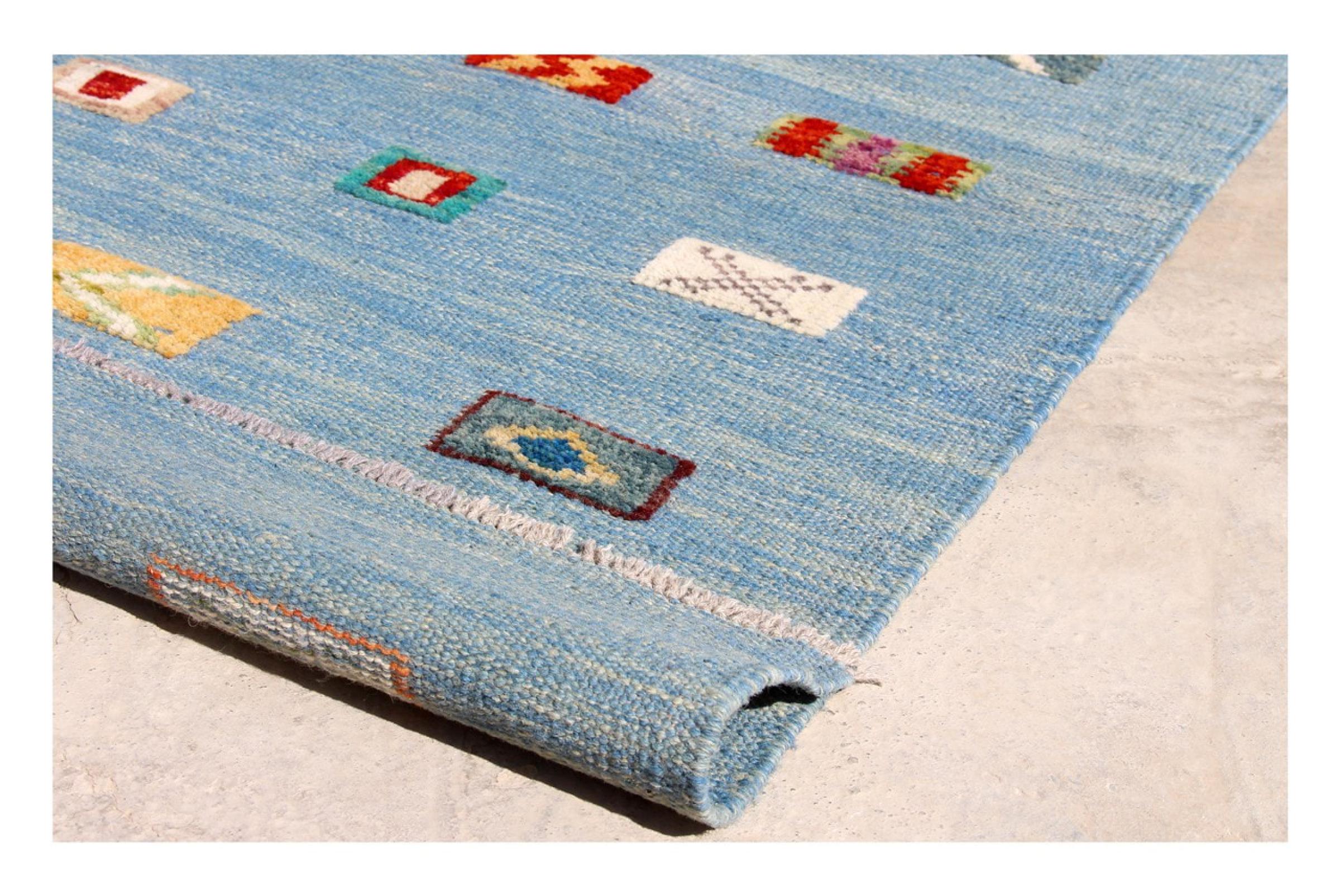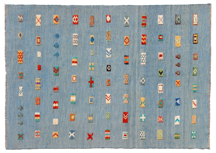 Esta alfombra fue hecha a mano en un telar como un tejido plano. Tejido plano es el término utilizado para describir las alfombras que no tienen pelo. Como el nombre promete, estas alfombras están tejidas y no anudadas. Esto resulta en una alfombra plana con una superficie estructurada. Los tejidos planos no son tan suaves y normalmente más delgados que las alfombras anudadas. Al mismo tiempo, su fabricación es mucho menos compleja y por lo general se pueden disponer por ambos lados (frontal y posterior). Sus patrones suelen ser geométricos, lo cual está determinado por el tejido.