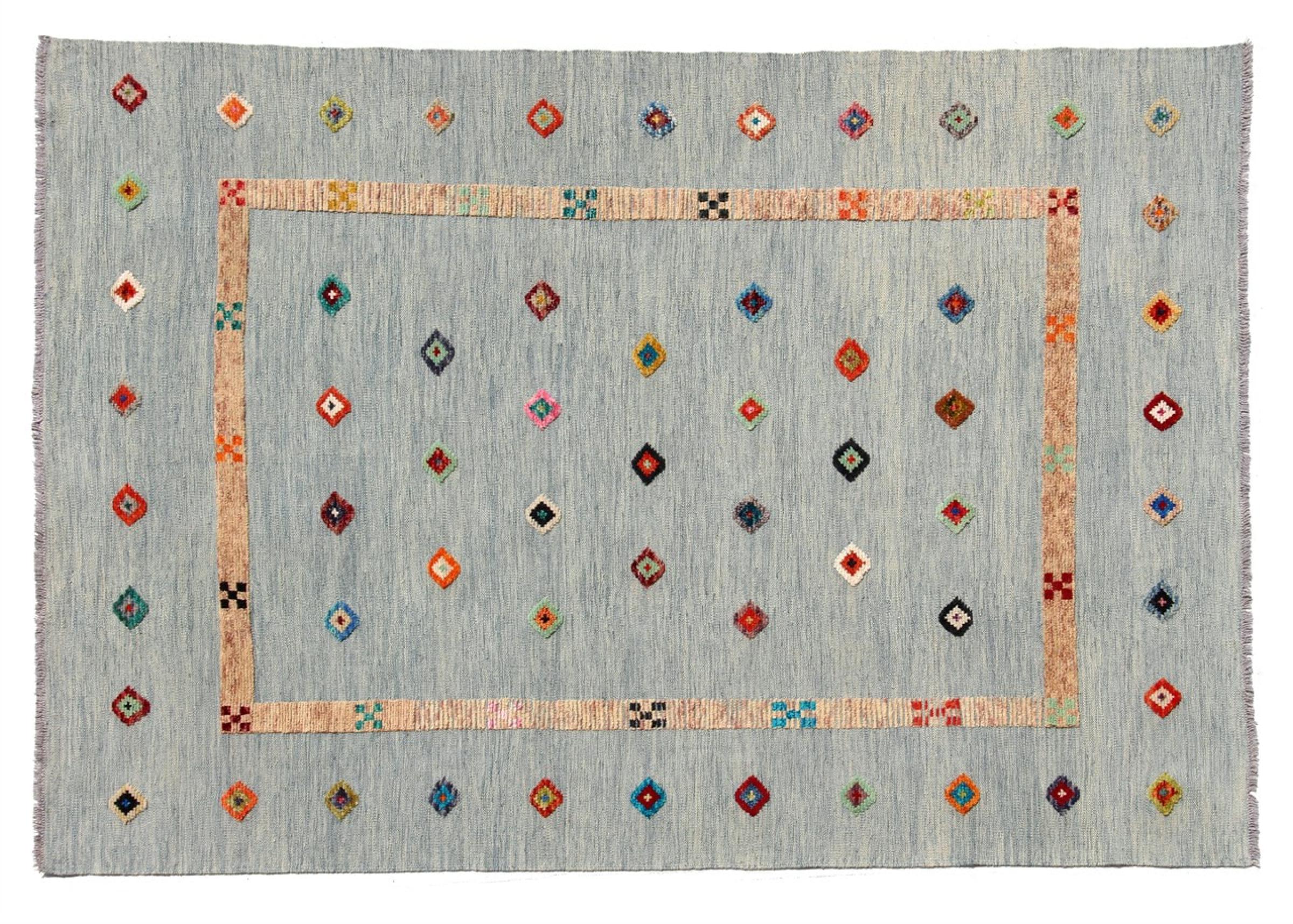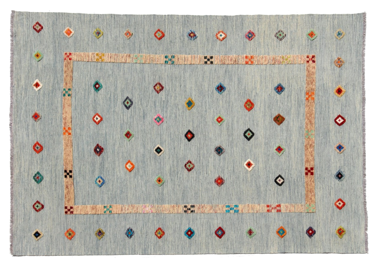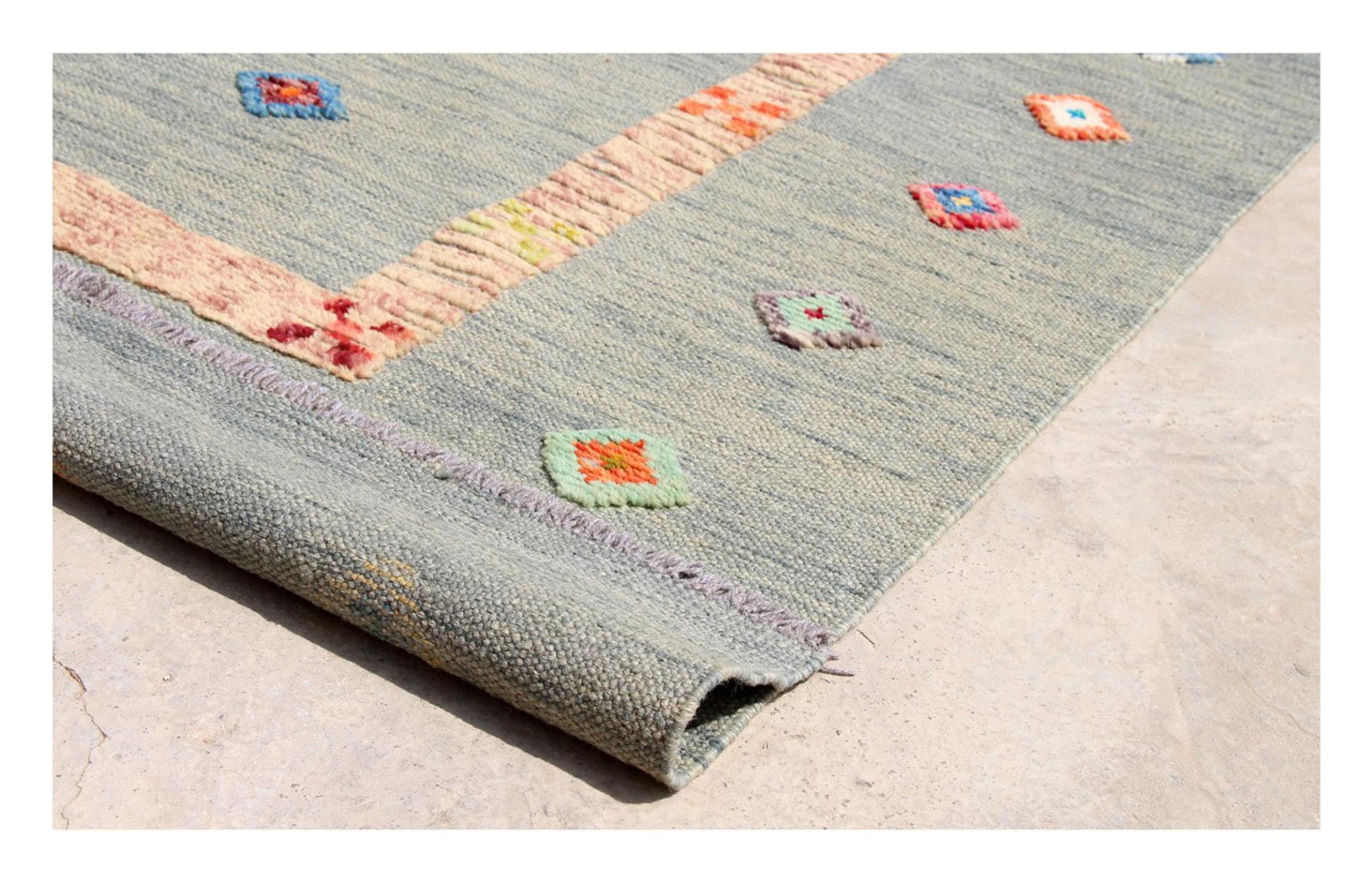 Esta alfombra fue hecha a mano en un telar como un tejido plano. Tejido plano es el término utilizado para describir las alfombras que no tienen pelo. Como el nombre promete, estas alfombras están tejidas y no anudadas. Esto resulta en una alfombra plana con una superficie estructurada. Los tejidos planos no son tan suaves y normalmente más delgados que las alfombras anudadas. Al mismo tiempo, su fabricación es mucho menos compleja y por lo general se pueden disponer por ambos lados (frontal y posterior). Sus patrones suelen ser geométricos, lo cual está determinado por el tejido.
