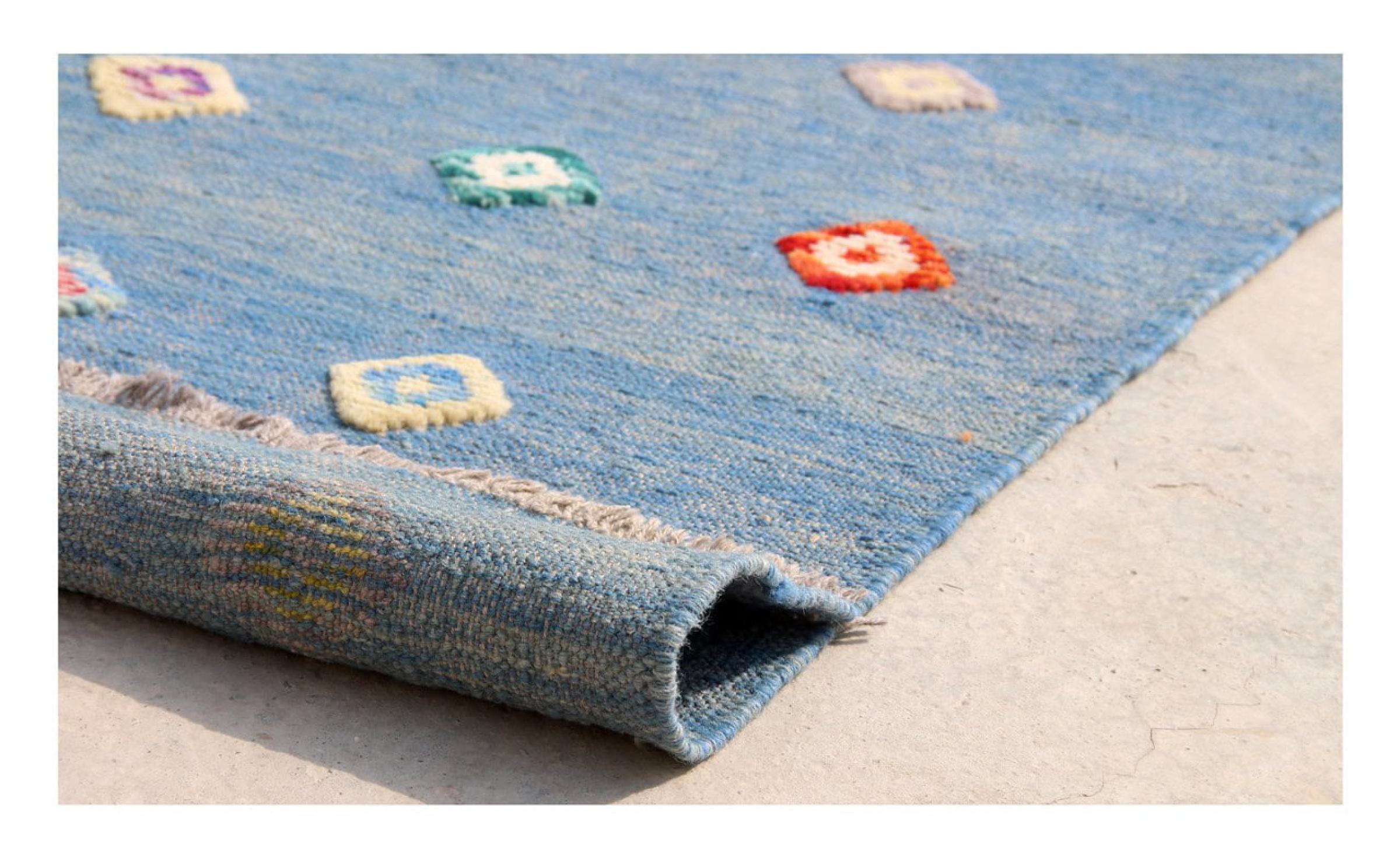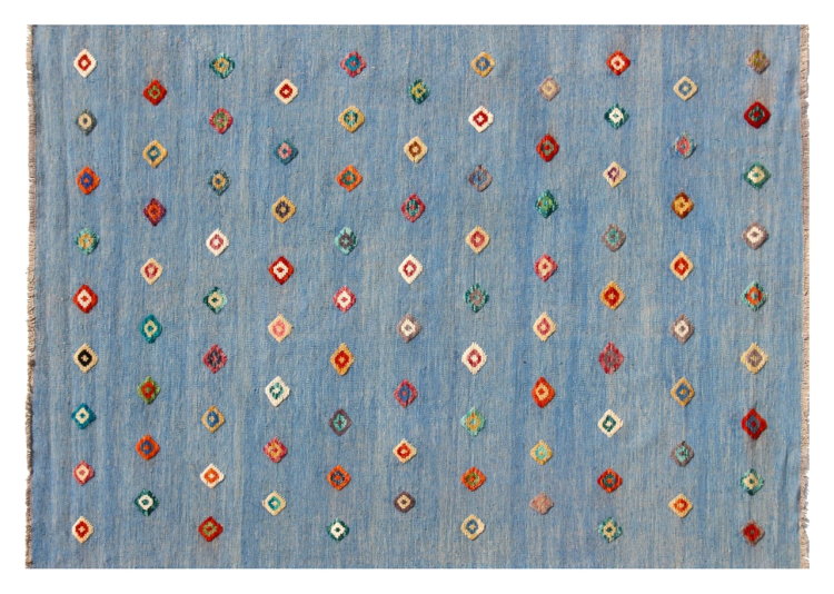 Esta alfombra fue hecha a mano en un telar como un tejido plano. Tejido plano es el término utilizado para describir las alfombras que no tienen pelo. Como el nombre promete, estas alfombras están tejidas y no anudadas. Esto resulta en una alfombra plana con una superficie estructurada. Los tejidos planos no son tan suaves y normalmente más delgados que las alfombras anudadas. Al mismo tiempo, su fabricación es mucho menos compleja y por lo general se pueden disponer por ambos lados (frontal y posterior). Sus patrones suelen ser geométricos, lo cual está determinado por el tejido.