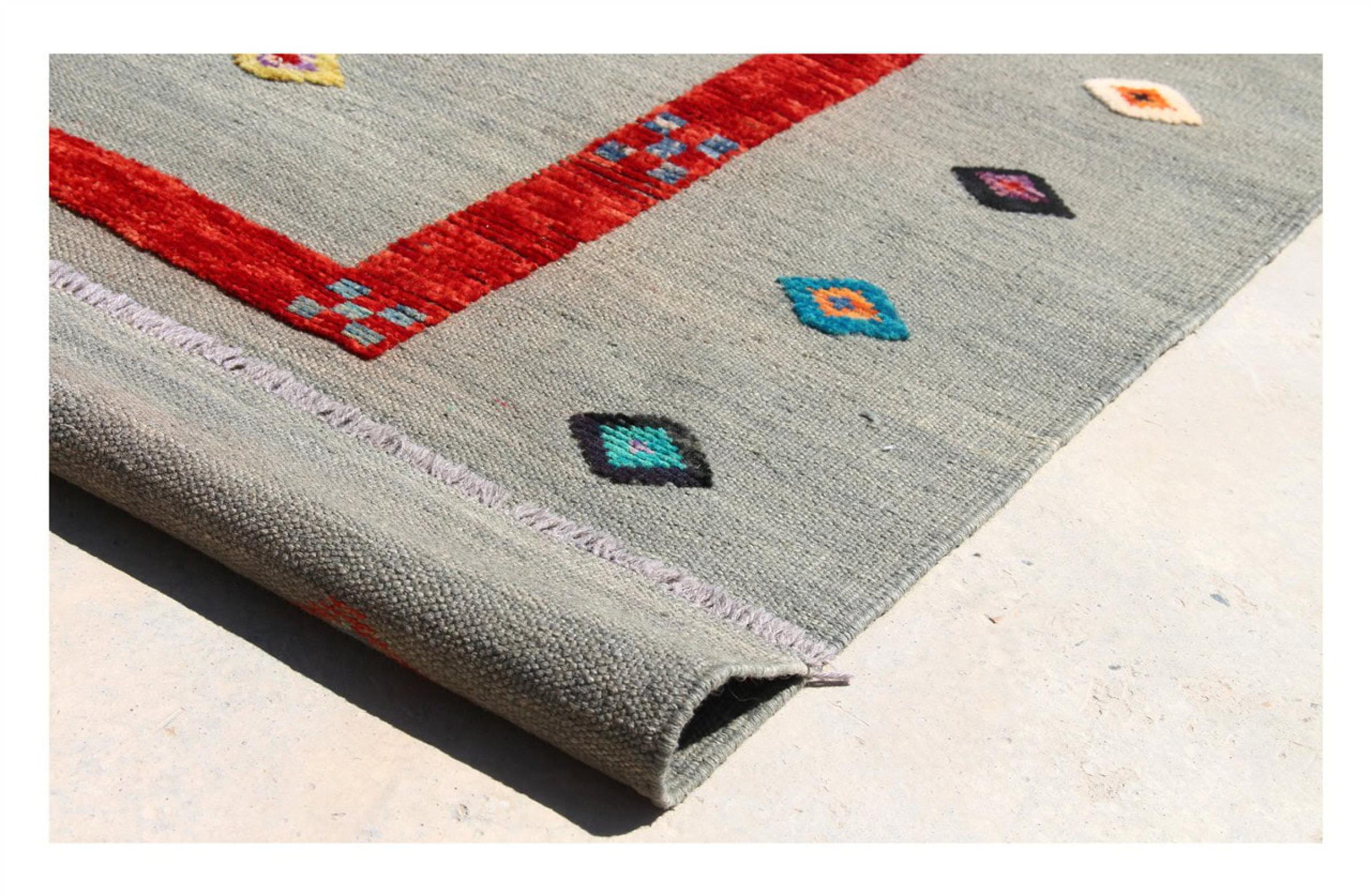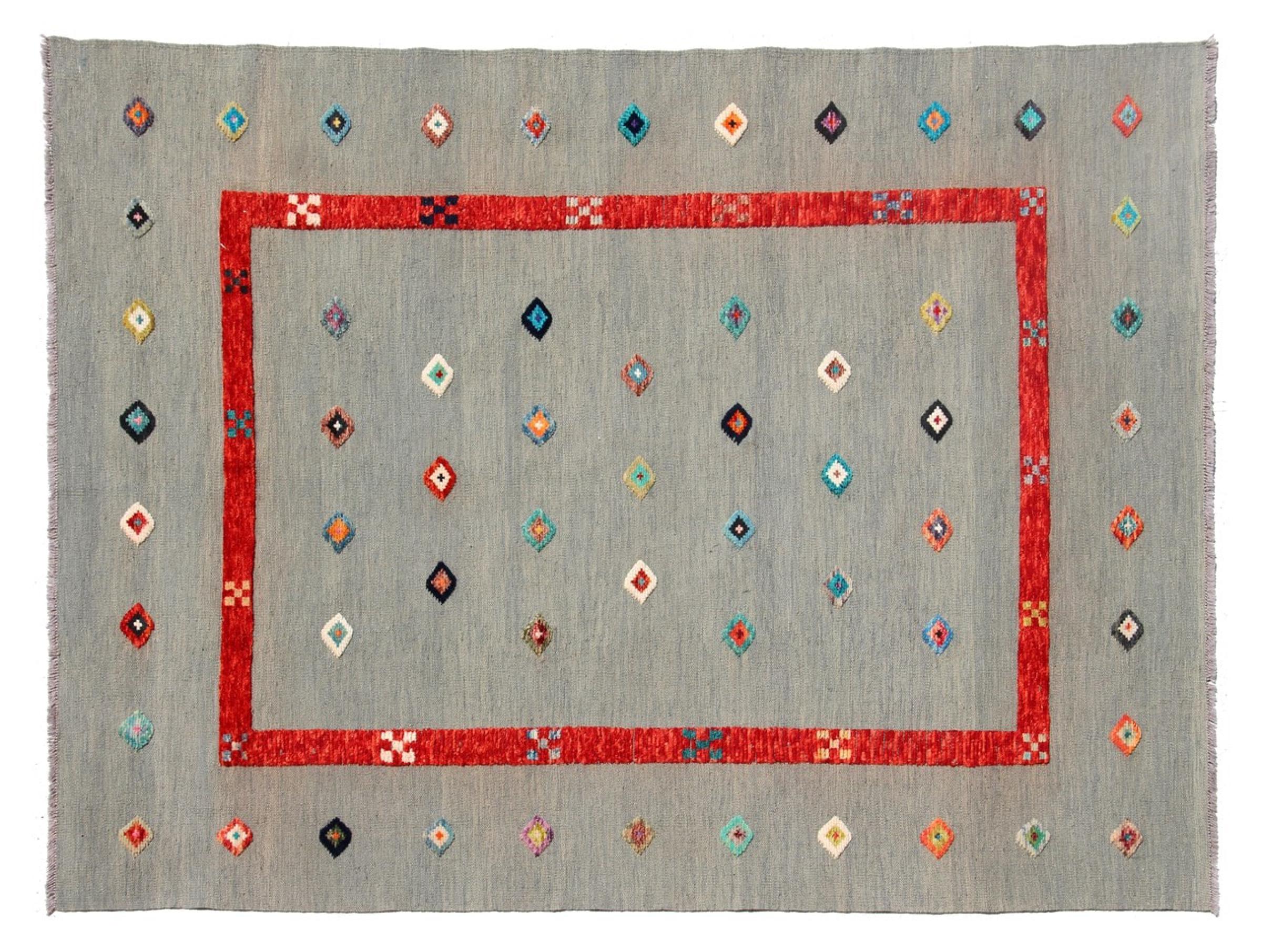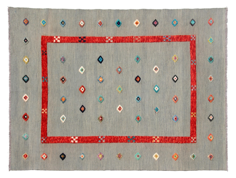 Esta alfombra fue hecha a mano en un telar como un tejido plano. Tejido plano es el término utilizado para describir las alfombras que no tienen pelo. Como el nombre promete, estas alfombras están tejidas y no anudadas. Esto resulta en una alfombra plana con una superficie estructurada. Los tejidos planos no son tan suaves y normalmente más delgados que las alfombras anudadas. Al mismo tiempo, su fabricación es mucho menos compleja y por lo general se pueden disponer por ambos lados (frontal y posterior). Sus patrones suelen ser geométricos, lo cual está determinado por el tejido.