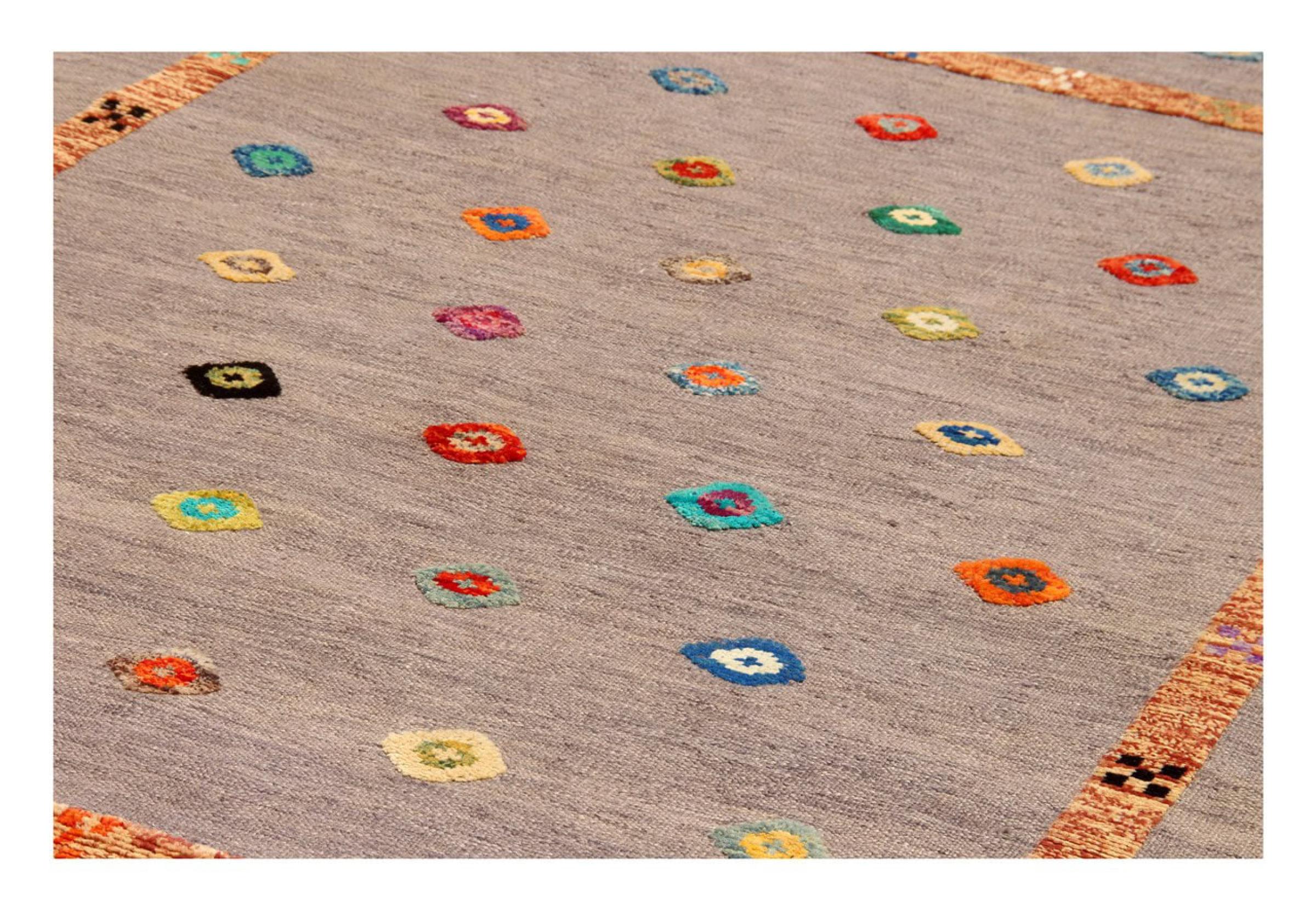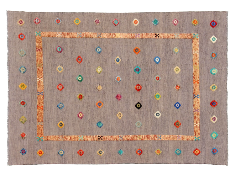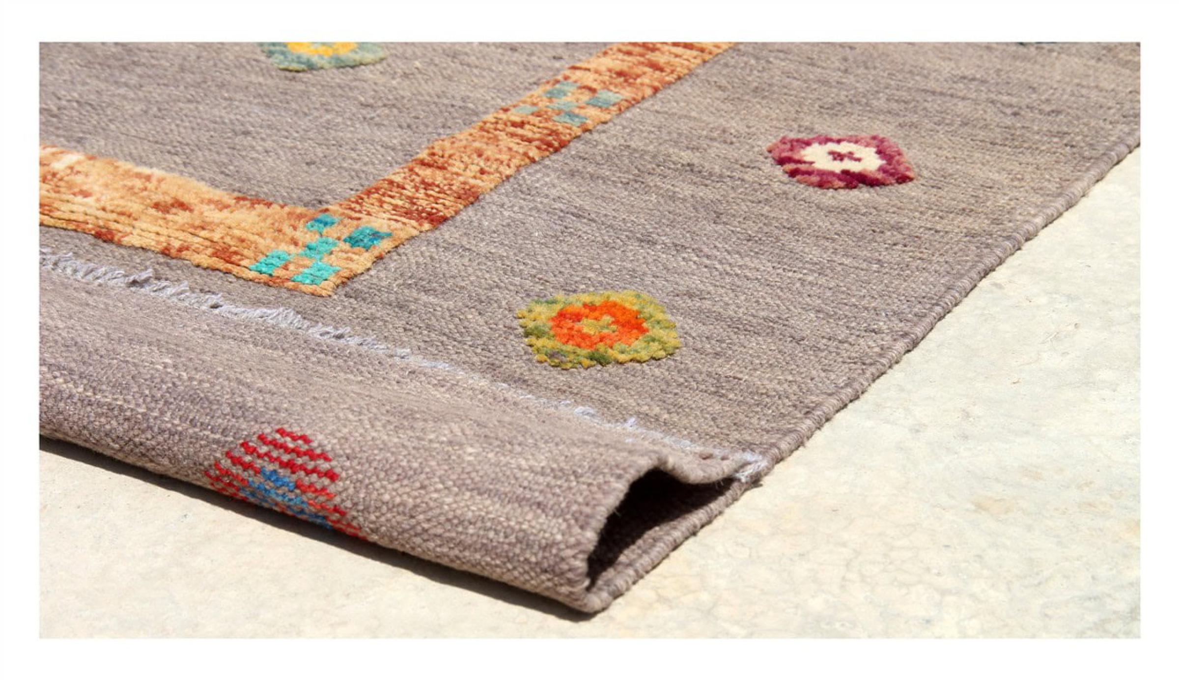 Esta alfombra fue hecha a mano en un telar como un tejido plano. Tejido plano es el término utilizado para describir las alfombras que no tienen pelo. Como el nombre promete, estas alfombras están tejidas y no anudadas. Esto resulta en una alfombra plana con una superficie estructurada. Los tejidos planos no son tan suaves y normalmente más delgados que las alfombras anudadas. Al mismo tiempo, su fabricación es mucho menos compleja y por lo general se pueden disponer por ambos lados (frontal y posterior). Sus patrones suelen ser geométricos, lo cual está determinado por el tejido.