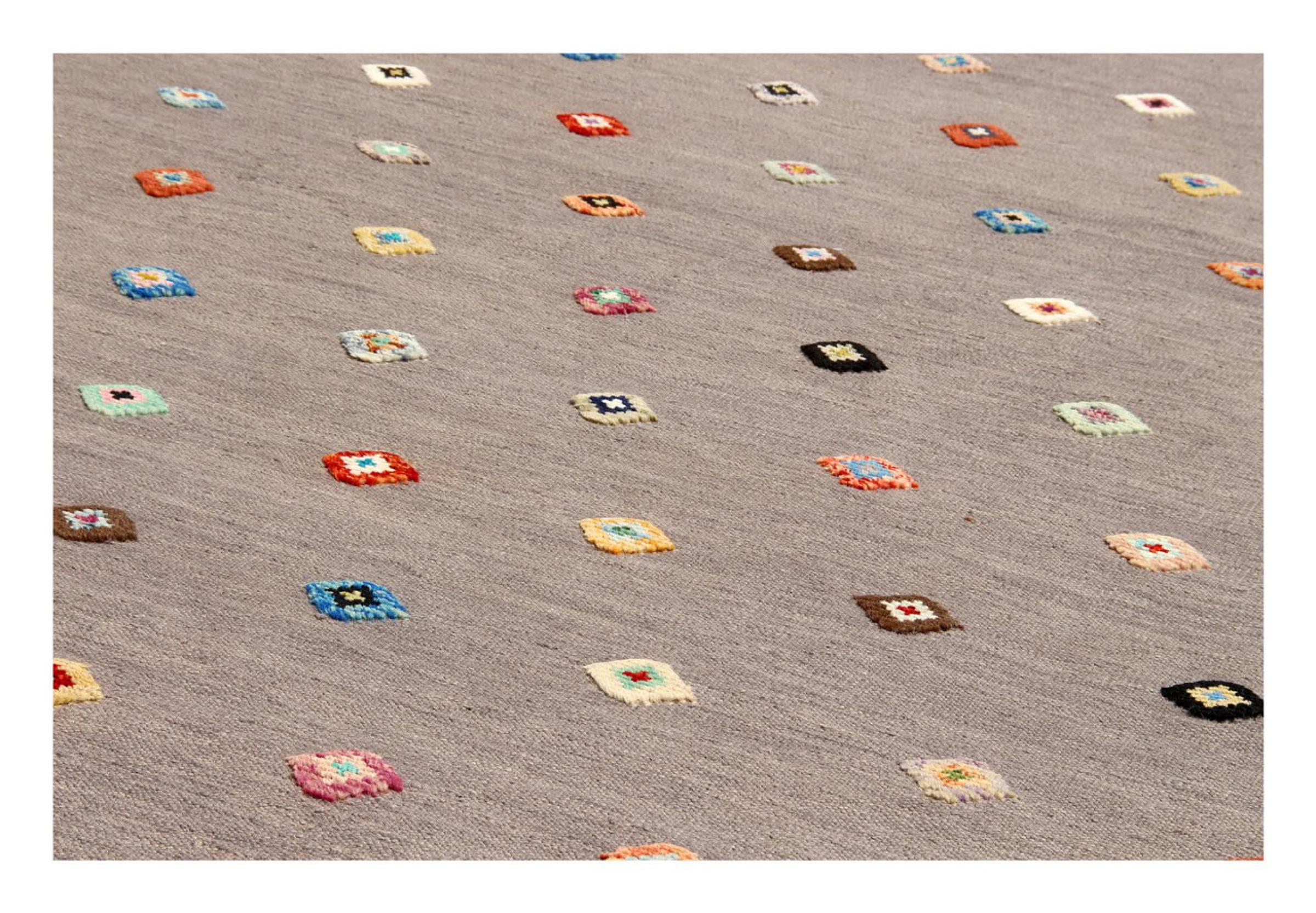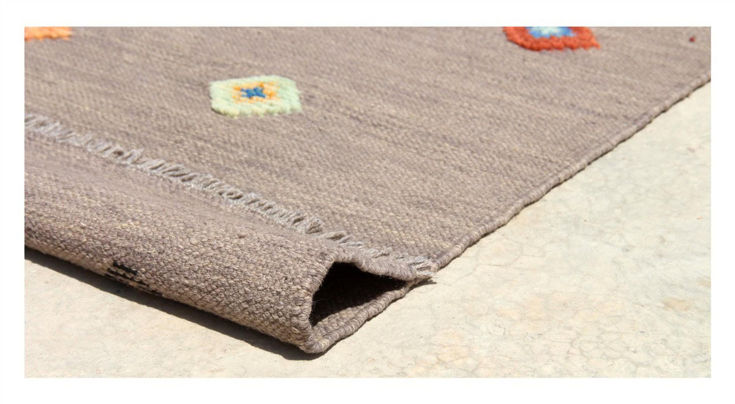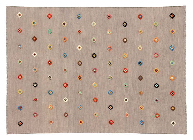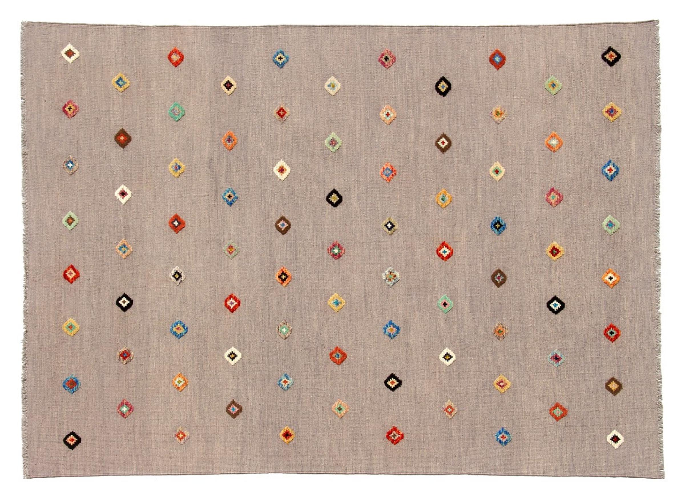 Esta alfombra fue hecha a mano en un telar como un tejido plano. Tejido plano es el término utilizado para describir las alfombras que no tienen pelo. Como el nombre promete, estas alfombras están tejidas y no anudadas. Esto resulta en una alfombra plana con una superficie estructurada. Los tejidos planos no son tan suaves y normalmente más delgados que las alfombras anudadas. Al mismo tiempo, su fabricación es mucho menos compleja y por lo general se pueden disponer por ambos lados (frontal y posterior). Sus patrones suelen ser geométricos, lo cual está determinado por el tejido.
