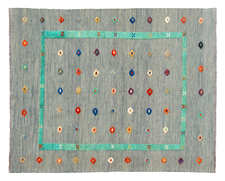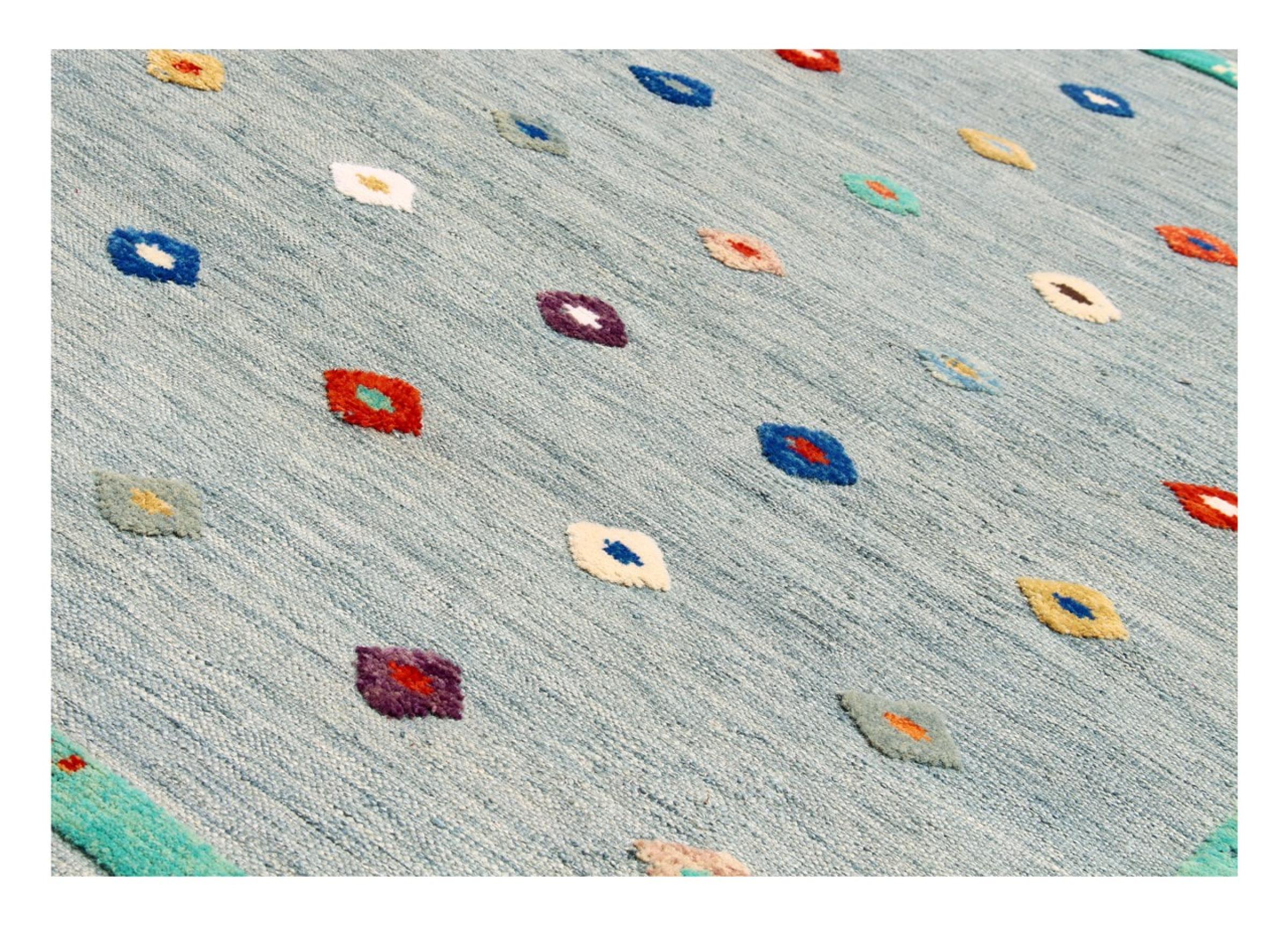 Esta alfombra fue hecha a mano en un telar como un tejido plano. Tejido plano es el término utilizado para describir las alfombras que no tienen pelo. Como el nombre promete, estas alfombras están tejidas y no anudadas. Esto resulta en una alfombra plana con una superficie estructurada. Los tejidos planos no son tan suaves y normalmente más delgados que las alfombras anudadas. Al mismo tiempo, su fabricación es mucho menos compleja y por lo general se pueden disponer por ambos lados (frontal y posterior). Sus patrones suelen ser geométricos, lo cual está determinado por el tejido.