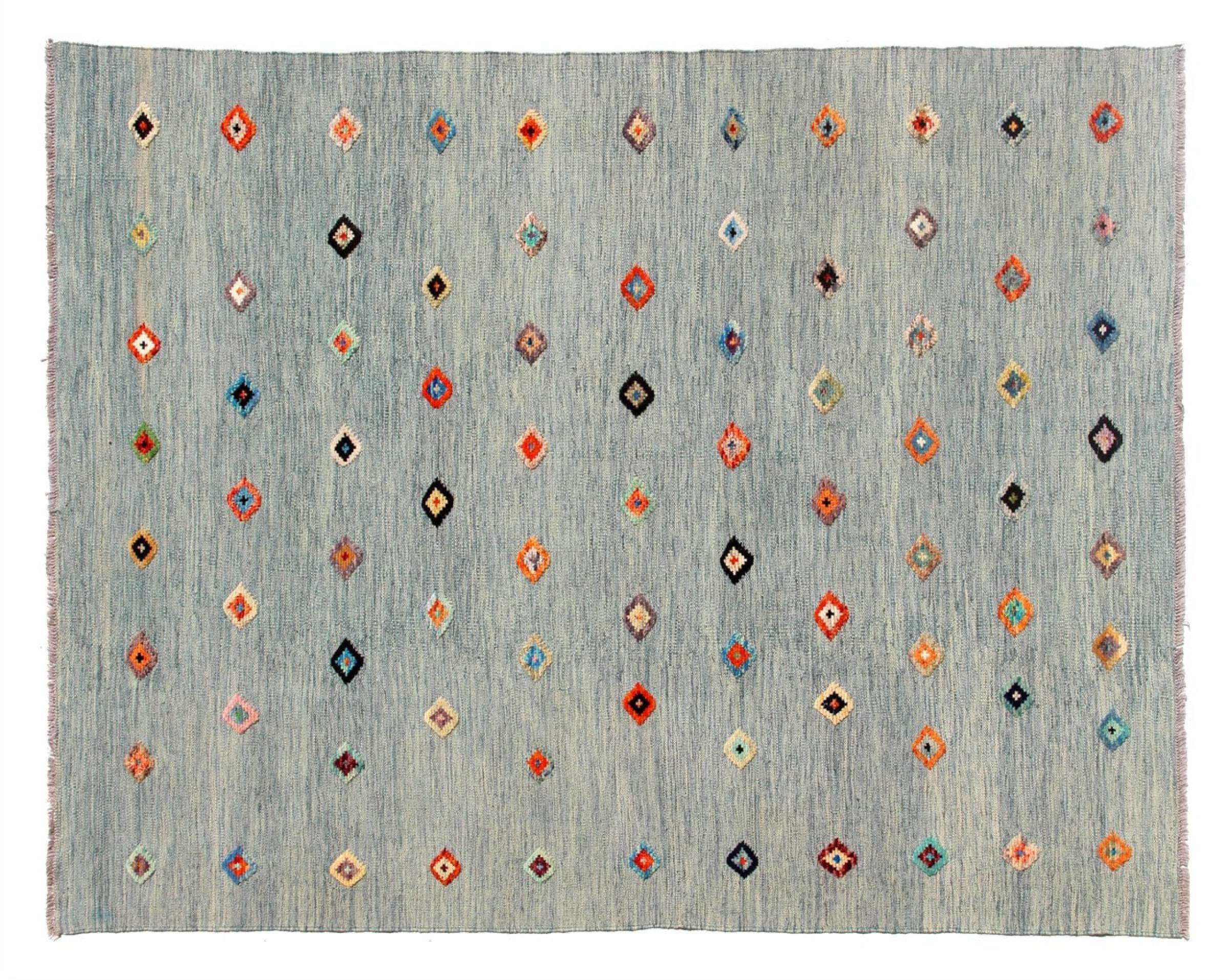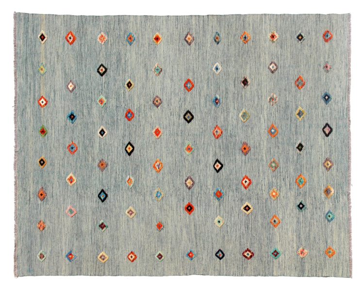 Esta alfombra fue hecha a mano en un telar como un tejido plano. Tejido plano es el término utilizado para describir las alfombras que no tienen pelo. Como el nombre promete, estas alfombras están tejidas y no anudadas. Esto resulta en una alfombra plana con una superficie estructurada. Los tejidos planos no son tan suaves y normalmente más delgados que las alfombras anudadas. Al mismo tiempo, su fabricación es mucho menos compleja y por lo general se pueden disponer por ambos lados (frontal y posterior). Sus patrones suelen ser geométricos, lo cual está determinado por el tejido.