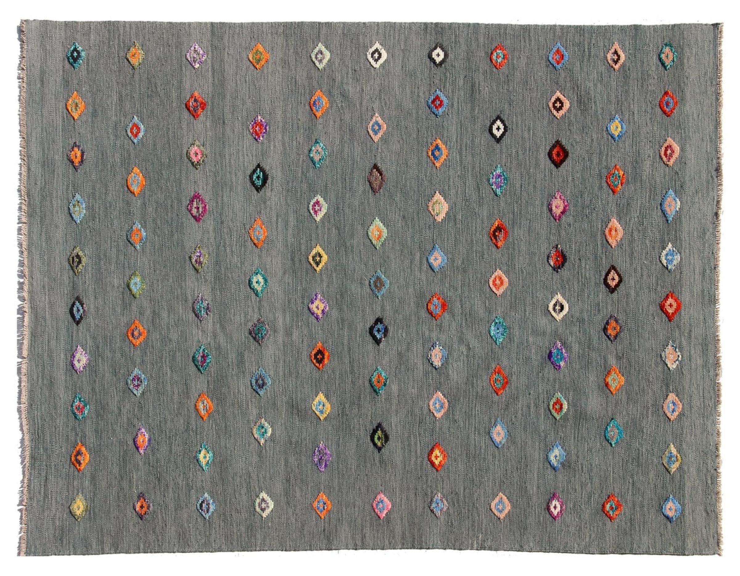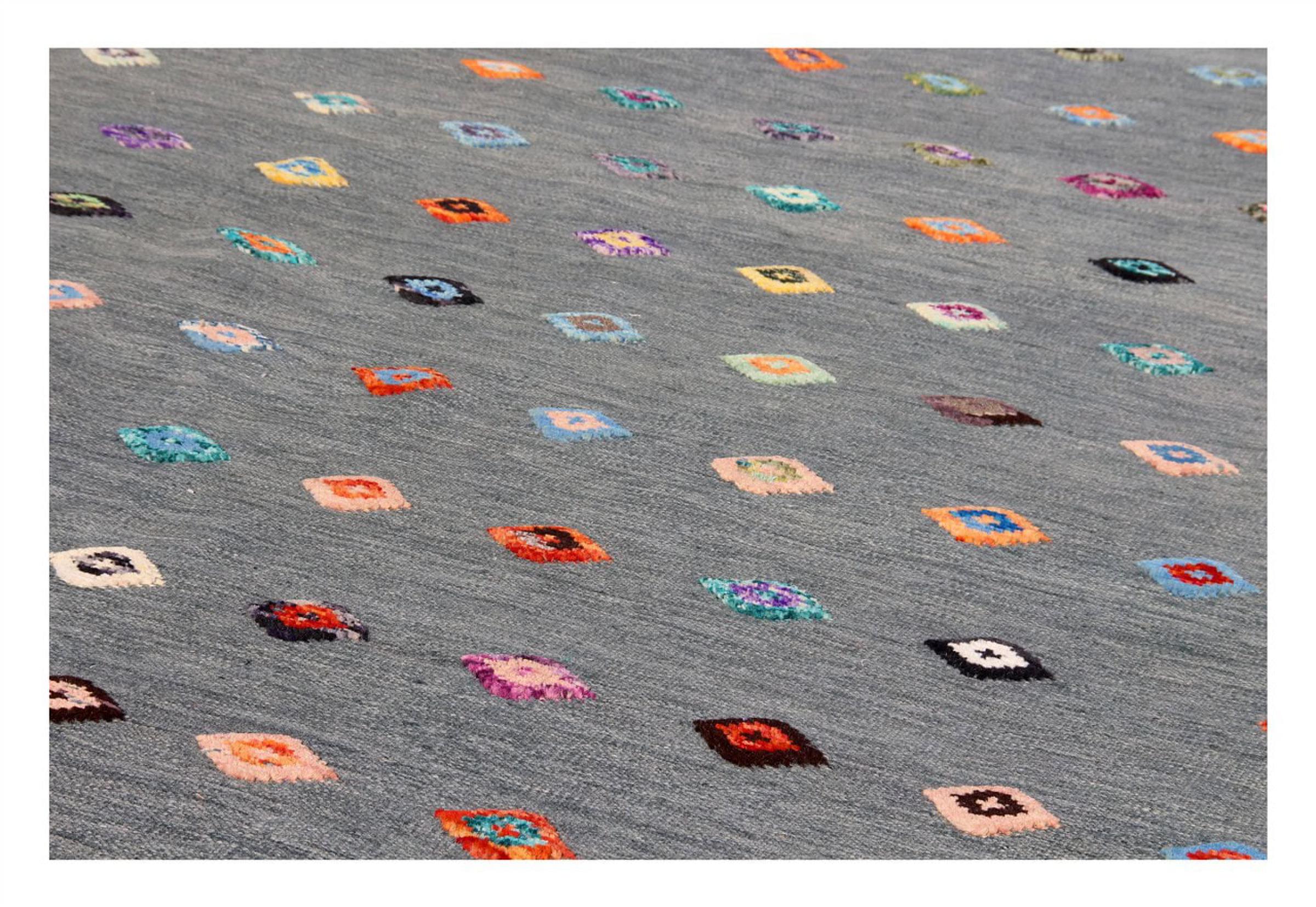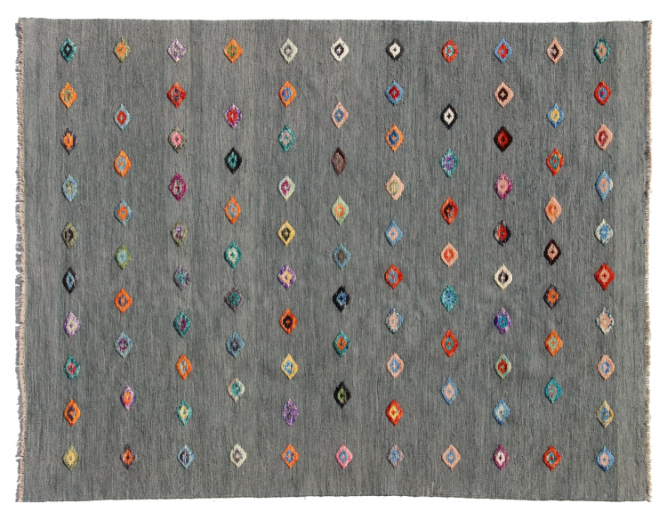 Esta alfombra fue hecha a mano en un telar como un tejido plano. Tejido plano es el término utilizado para describir las alfombras que no tienen pelo. Como el nombre promete, estas alfombras están tejidas y no anudadas. Esto resulta en una alfombra plana con una superficie estructurada. Los tejidos planos no son tan suaves y normalmente más delgados que las alfombras anudadas. Al mismo tiempo, su fabricación es mucho menos compleja y por lo general se pueden disponer por ambos lados (frontal y posterior). Sus patrones suelen ser geométricos, lo cual está determinado por el tejido.