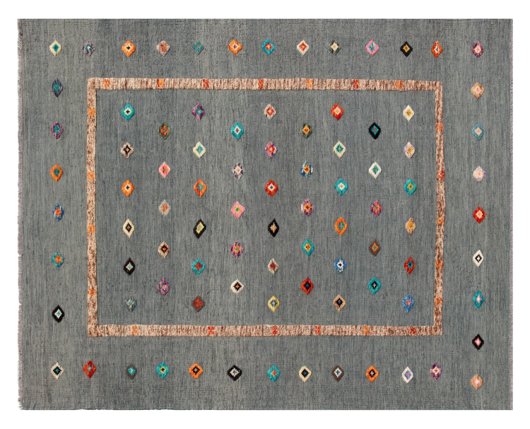 Esta alfombra fue hecha a mano en un telar como un tejido plano. Tejido plano es el término utilizado para describir las alfombras que no tienen pelo. Como el nombre promete, estas alfombras están tejidas y no anudadas. Esto resulta en una alfombra plana con una superficie estructurada. Los tejidos planos no son tan suaves y normalmente más delgados que las alfombras anudadas. Al mismo tiempo, su fabricación es mucho menos compleja y por lo general se pueden disponer por ambos lados (frontal y posterior). Sus patrones suelen ser geométricos, lo cual está determinado por el tejido.