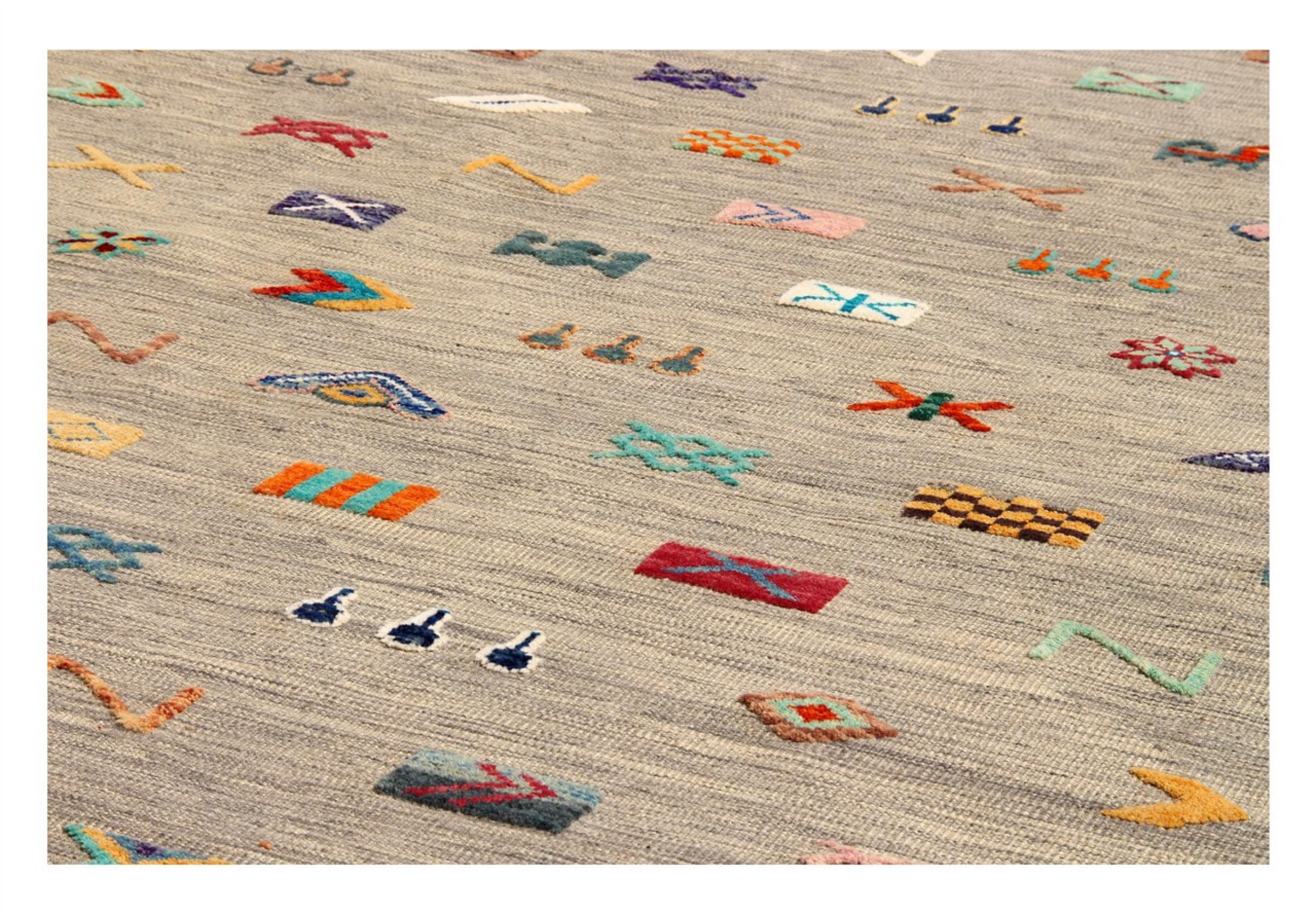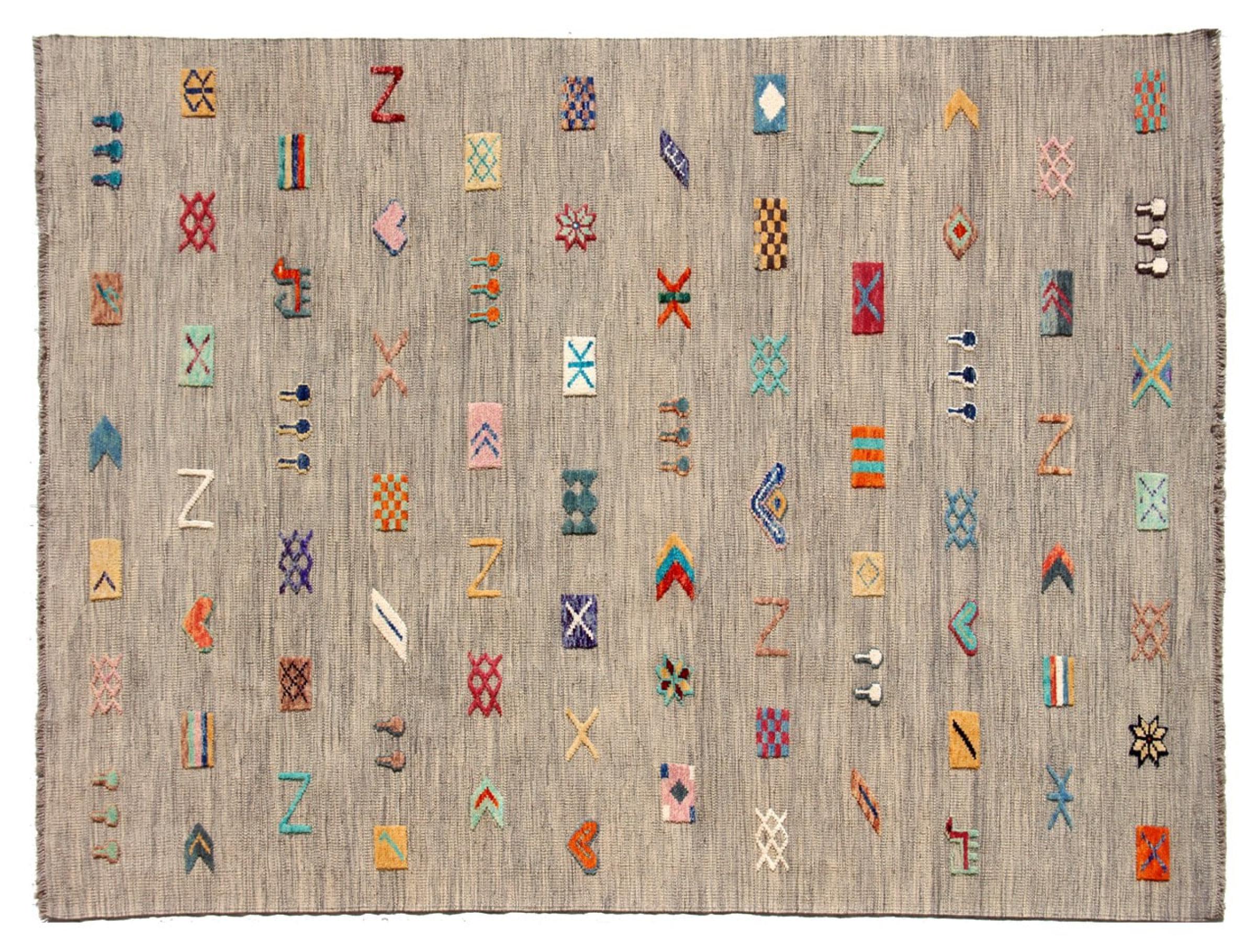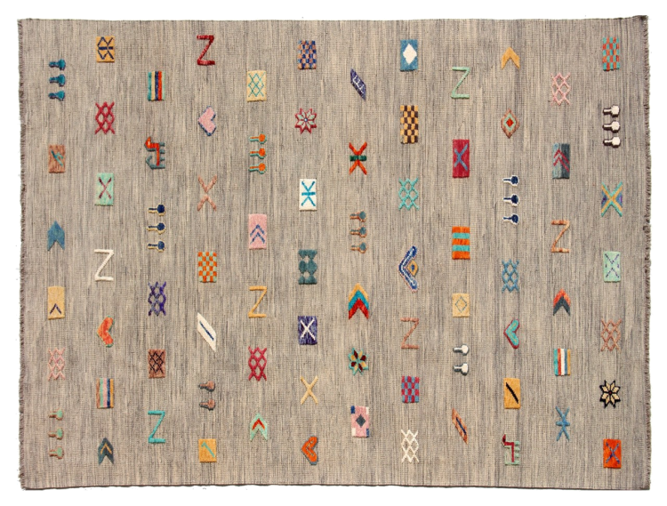 Esta alfombra fue hecha a mano en un telar como un tejido plano. Tejido plano es el término utilizado para describir las alfombras que no tienen pelo. Como el nombre promete, estas alfombras están tejidas y no anudadas. Esto resulta en una alfombra plana con una superficie estructurada. Los tejidos planos no son tan suaves y normalmente más delgados que las alfombras anudadas. Al mismo tiempo, su fabricación es mucho menos compleja y por lo general se pueden disponer por ambos lados (frontal y posterior). Sus patrones suelen ser geométricos, lo cual está determinado por el tejido.