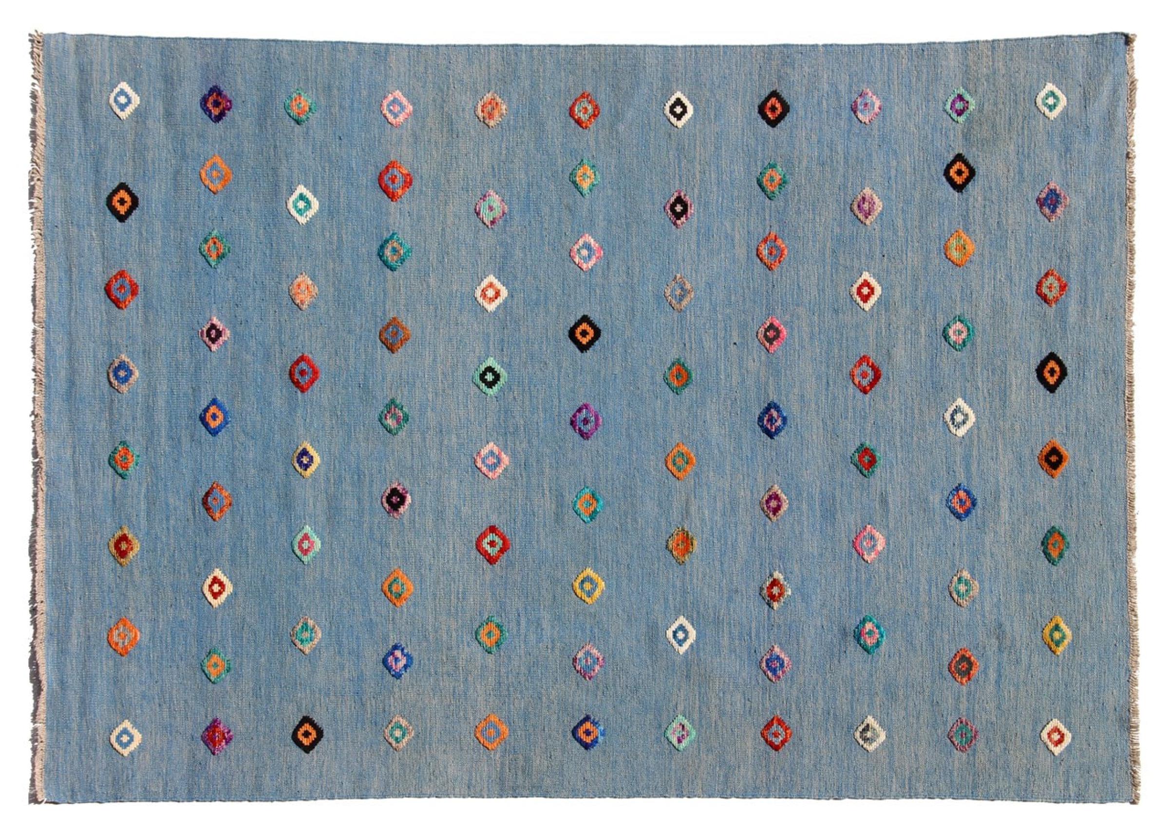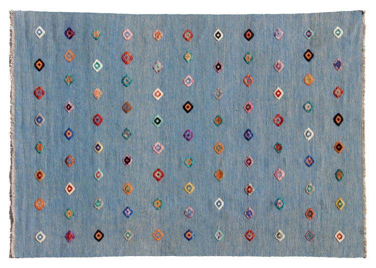 Esta alfombra fue hecha a mano en un telar como un tejido plano. Tejido plano es el término utilizado para describir las alfombras que no tienen pelo. Como el nombre promete, estas alfombras están tejidas y no anudadas. Esto resulta en una alfombra plana con una superficie estructurada. Los tejidos planos no son tan suaves y normalmente más delgados que las alfombras anudadas. Al mismo tiempo, su fabricación es mucho menos compleja y por lo general se pueden disponer por ambos lados (frontal y posterior). Sus patrones suelen ser geométricos, lo cual está determinado por el tejido.