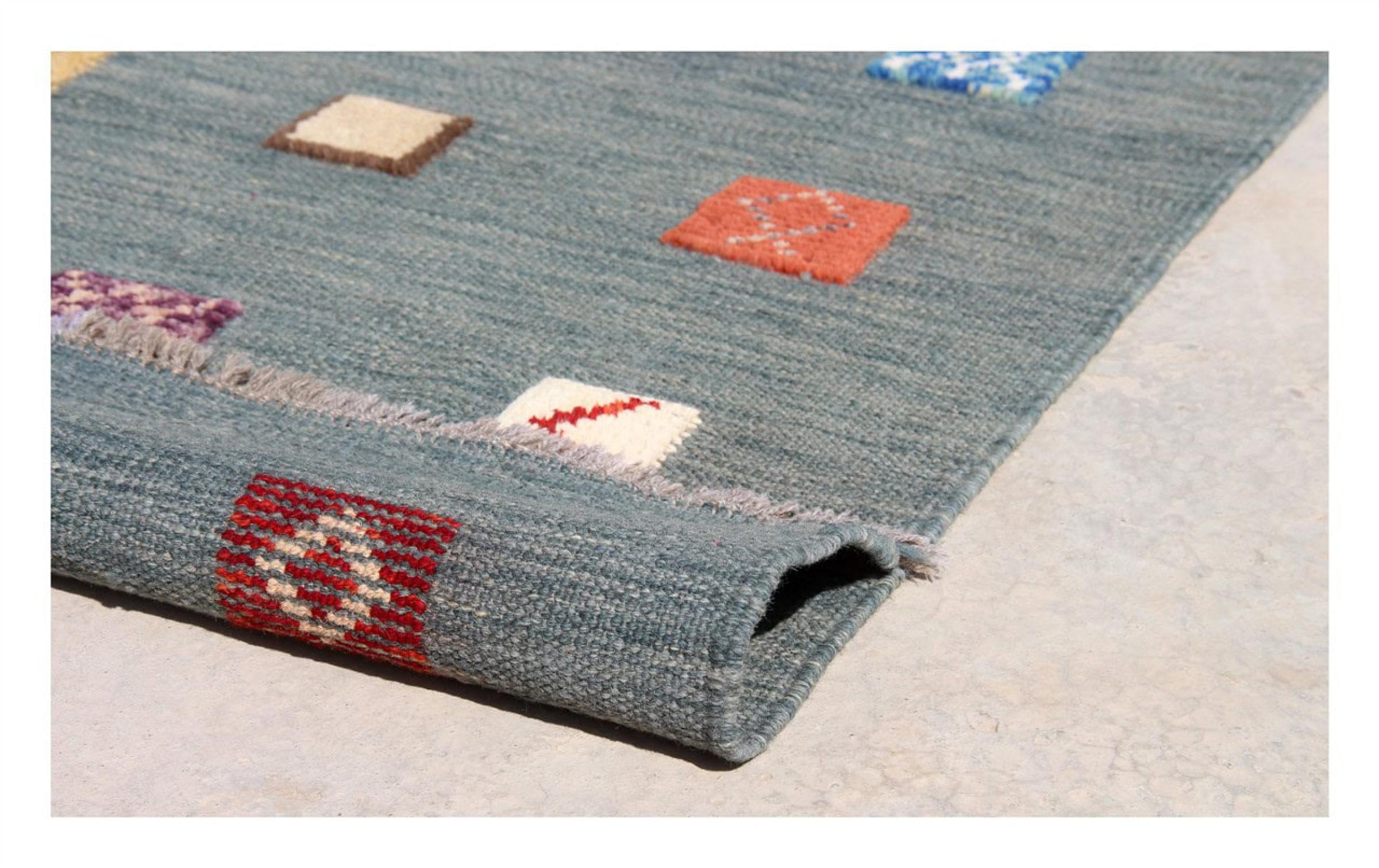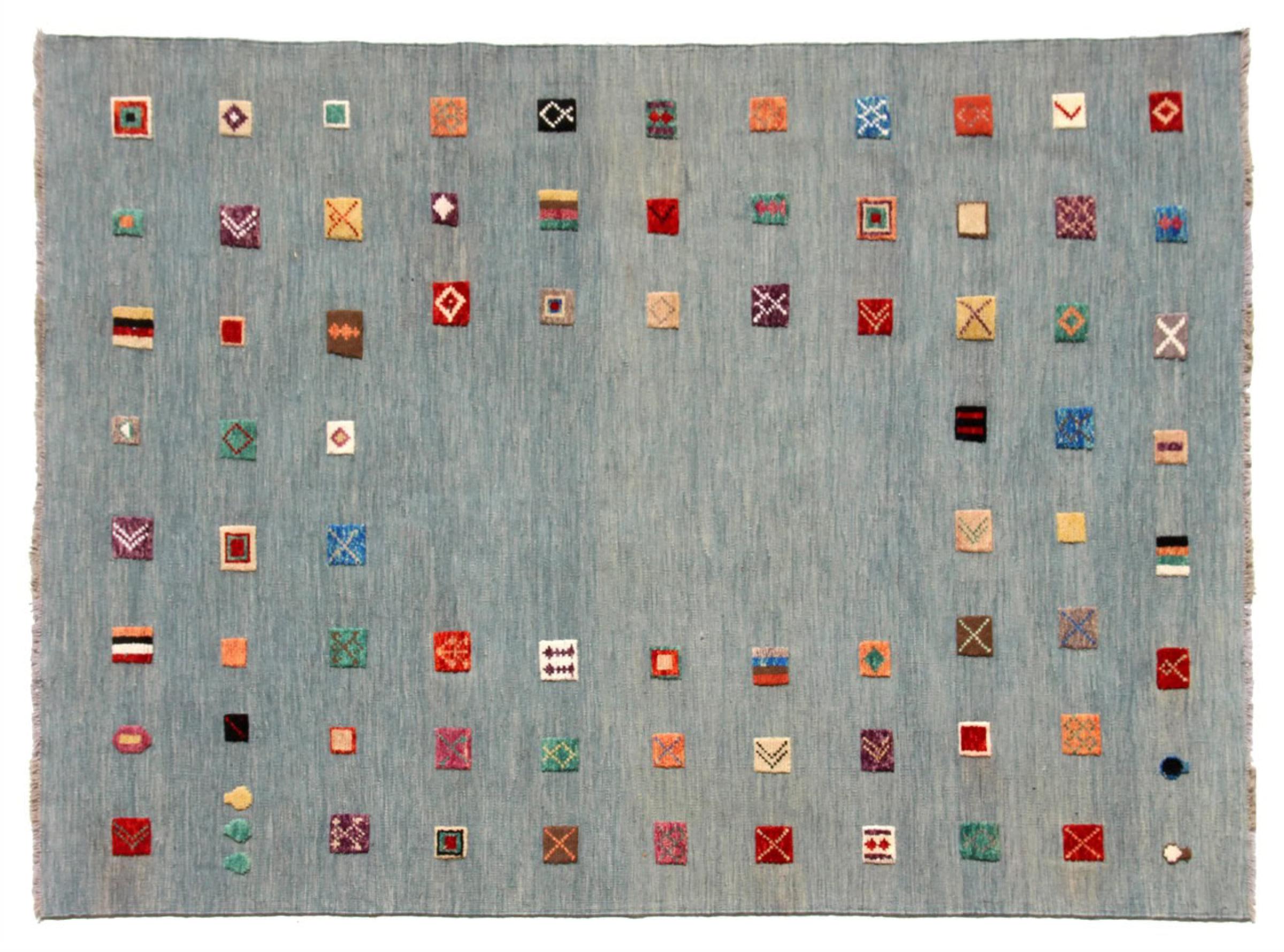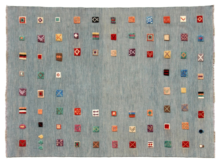 Esta alfombra fue hecha a mano en un telar como un tejido plano. Tejido plano es el término utilizado para describir las alfombras que no tienen pelo. Como el nombre promete, estas alfombras están tejidas y no anudadas. Esto resulta en una alfombra plana con una superficie estructurada. Los tejidos planos no son tan suaves y normalmente más delgados que las alfombras anudadas. Al mismo tiempo, su fabricación es mucho menos compleja y por lo general se pueden disponer por ambos lados (frontal y posterior). Sus patrones suelen ser geométricos, lo cual está determinado por el tejido.