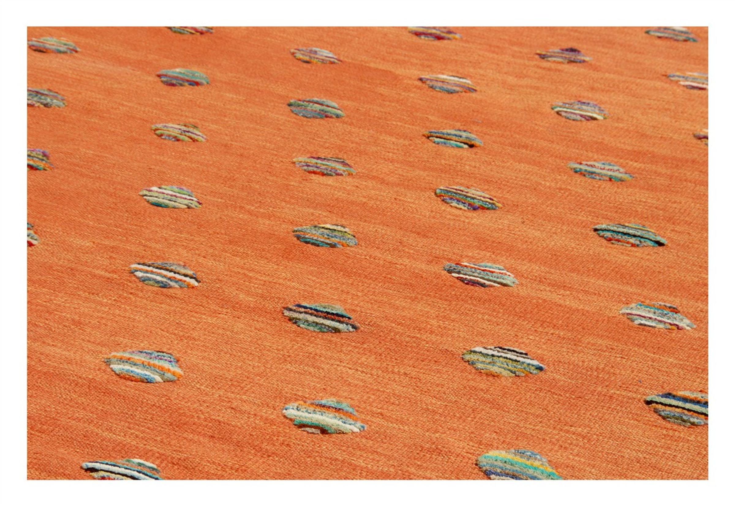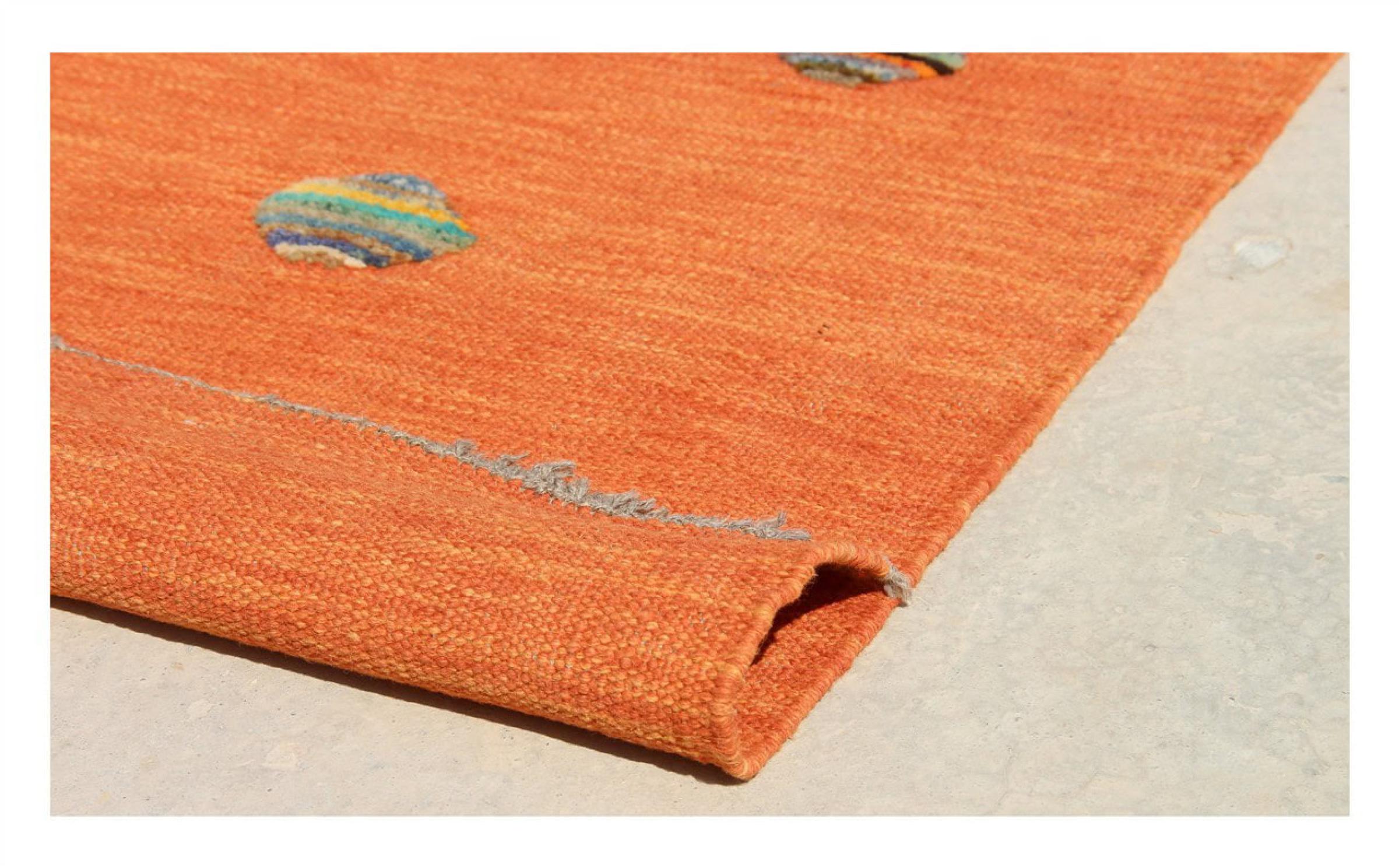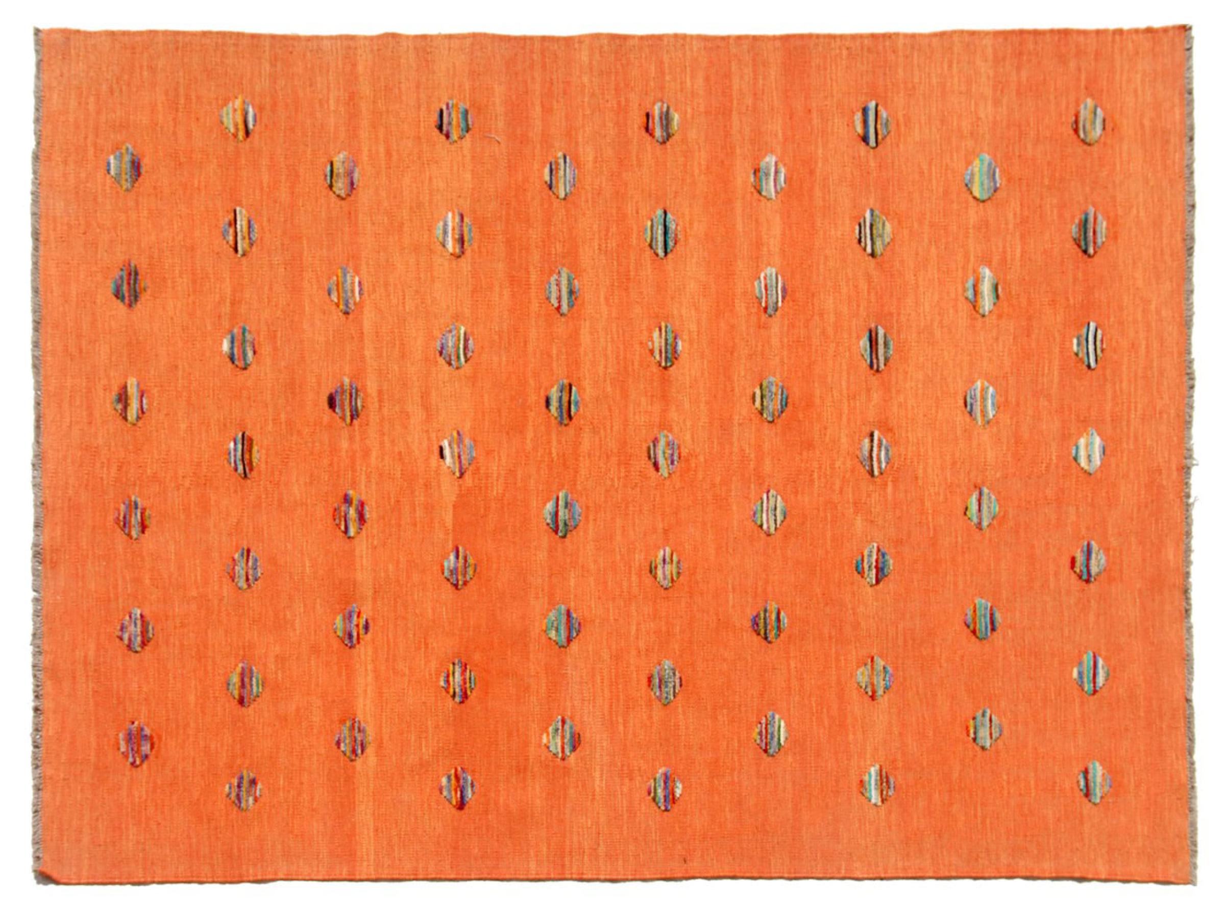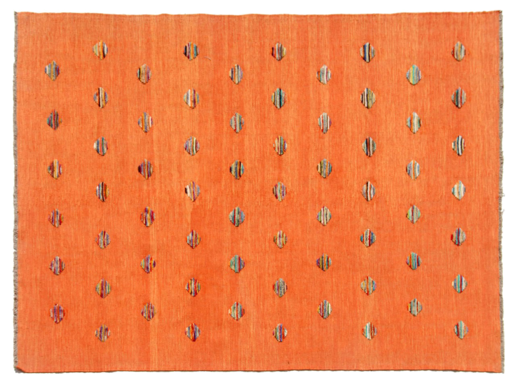 Esta alfombra fue hecha a mano en un telar como un tejido plano. Tejido plano es el término utilizado para describir las alfombras que no tienen pelo. Como el nombre promete, estas alfombras están tejidas y no anudadas. Esto resulta en una alfombra plana con una superficie estructurada. Los tejidos planos no son tan suaves y normalmente más delgados que las alfombras anudadas. Al mismo tiempo, su fabricación es mucho menos compleja y por lo general se pueden disponer por ambos lados (frontal y posterior). Sus patrones suelen ser geométricos, lo cual está determinado por el tejido.