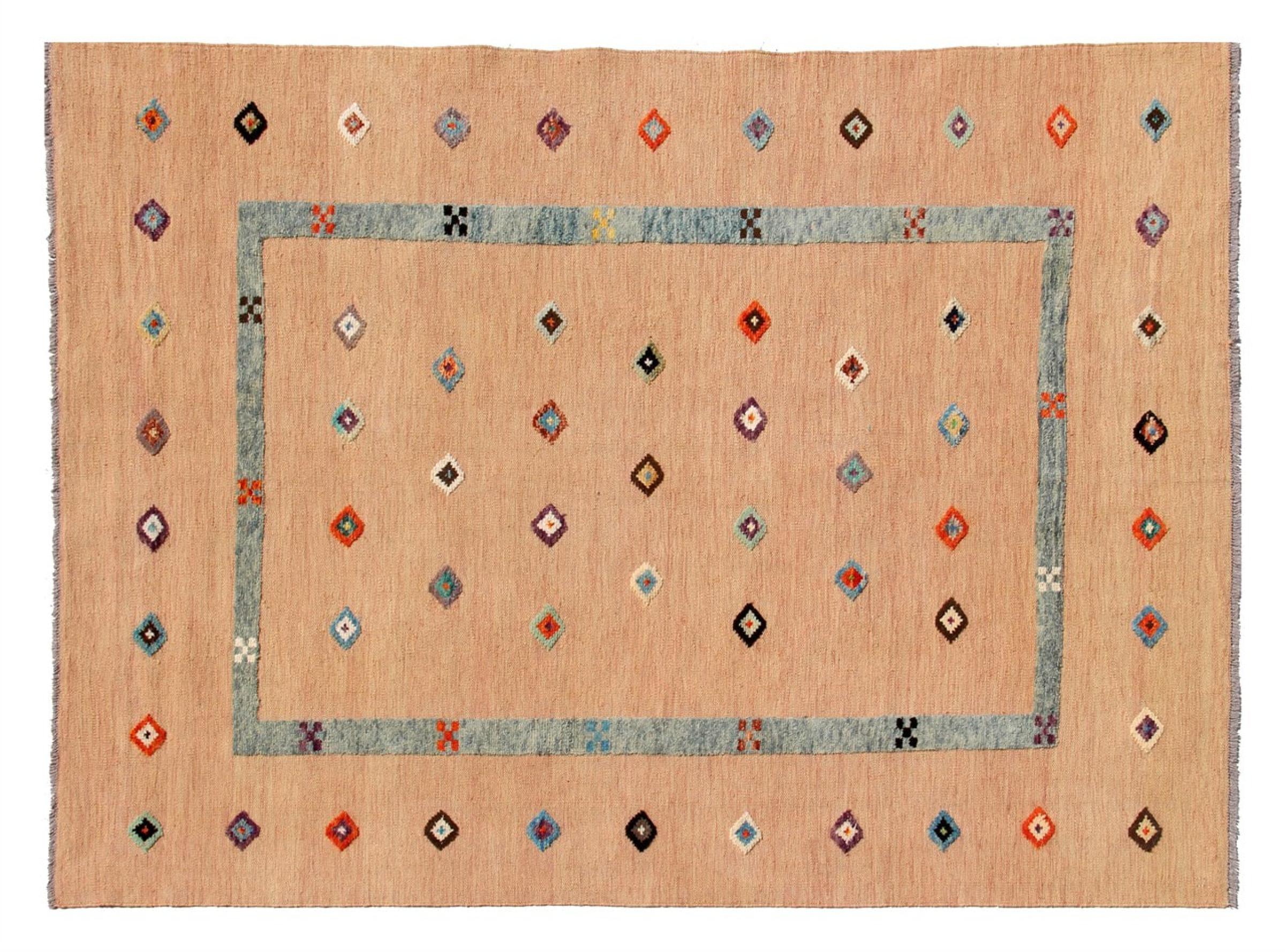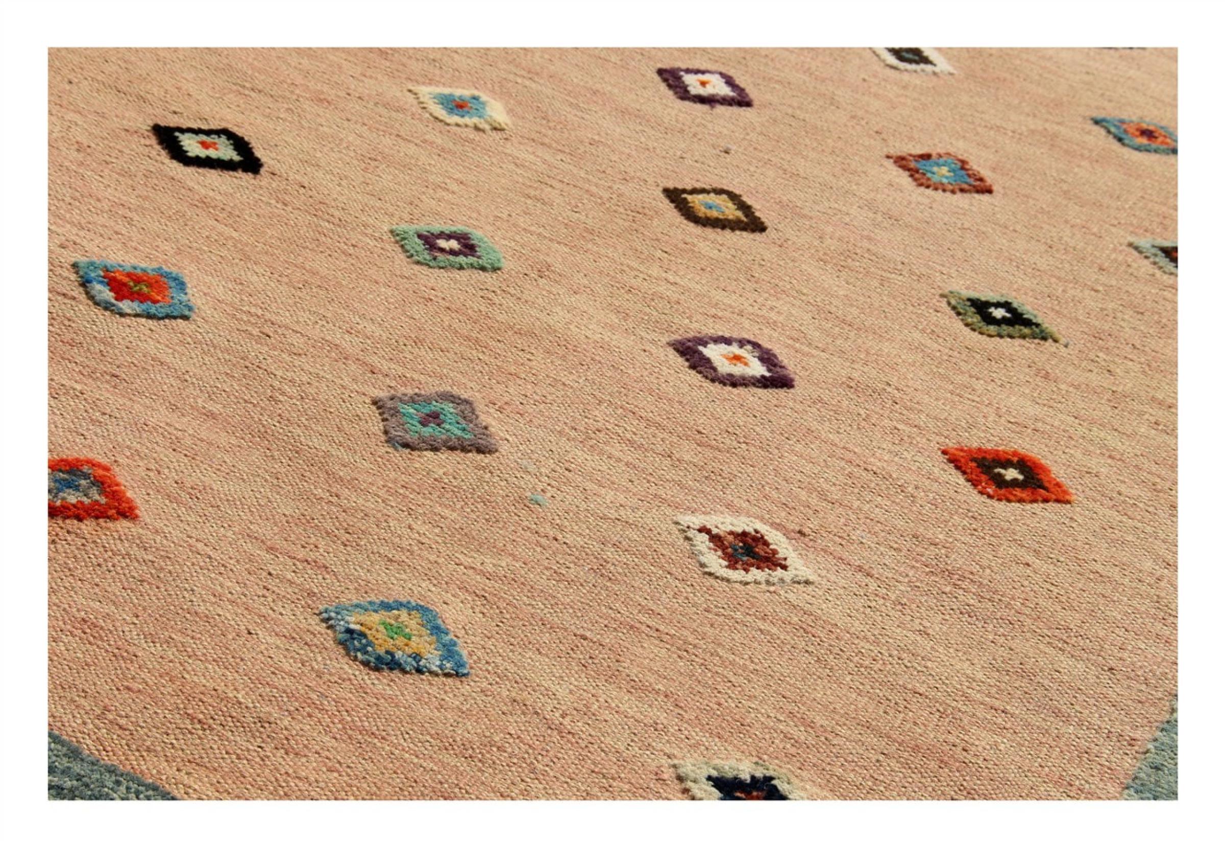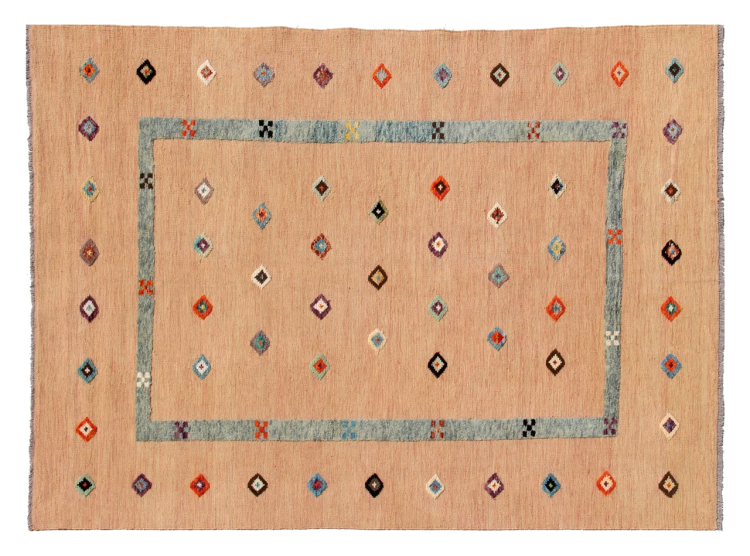 Esta alfombra fue hecha a mano en un telar como un tejido plano. Tejido plano es el término utilizado para describir las alfombras que no tienen pelo. Como el nombre promete, estas alfombras están tejidas y no anudadas. Esto resulta en una alfombra plana con una superficie estructurada. Los tejidos planos no son tan suaves y normalmente más delgados que las alfombras anudadas. Al mismo tiempo, su fabricación es mucho menos compleja y por lo general se pueden disponer por ambos lados (frontal y posterior). Sus patrones suelen ser geométricos, lo cual está determinado por el tejido.