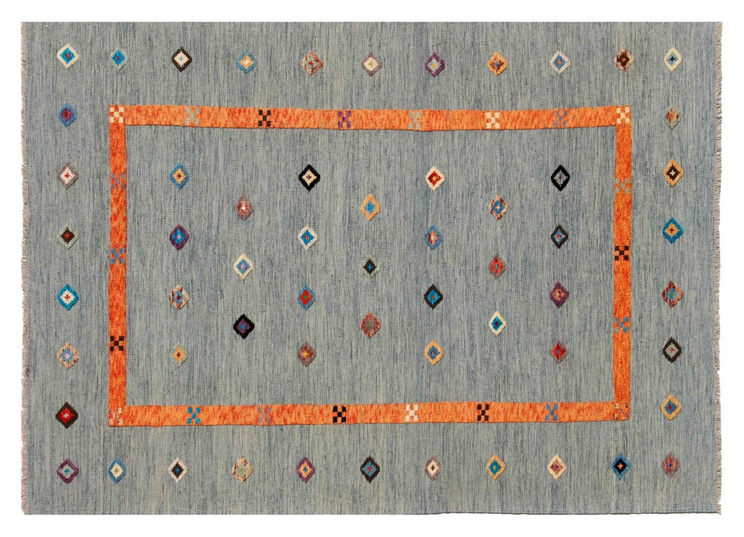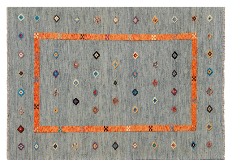 Esta alfombra fue hecha a mano en un telar como un tejido plano. Tejido plano es el término utilizado para describir las alfombras que no tienen pelo. Como el nombre promete, estas alfombras están tejidas y no anudadas. Esto resulta en una alfombra plana con una superficie estructurada. Los tejidos planos no son tan suaves y normalmente más delgados que las alfombras anudadas. Al mismo tiempo, su fabricación es mucho menos compleja y por lo general se pueden disponer por ambos lados (frontal y posterior). Sus patrones suelen ser geométricos, lo cual está determinado por el tejido.