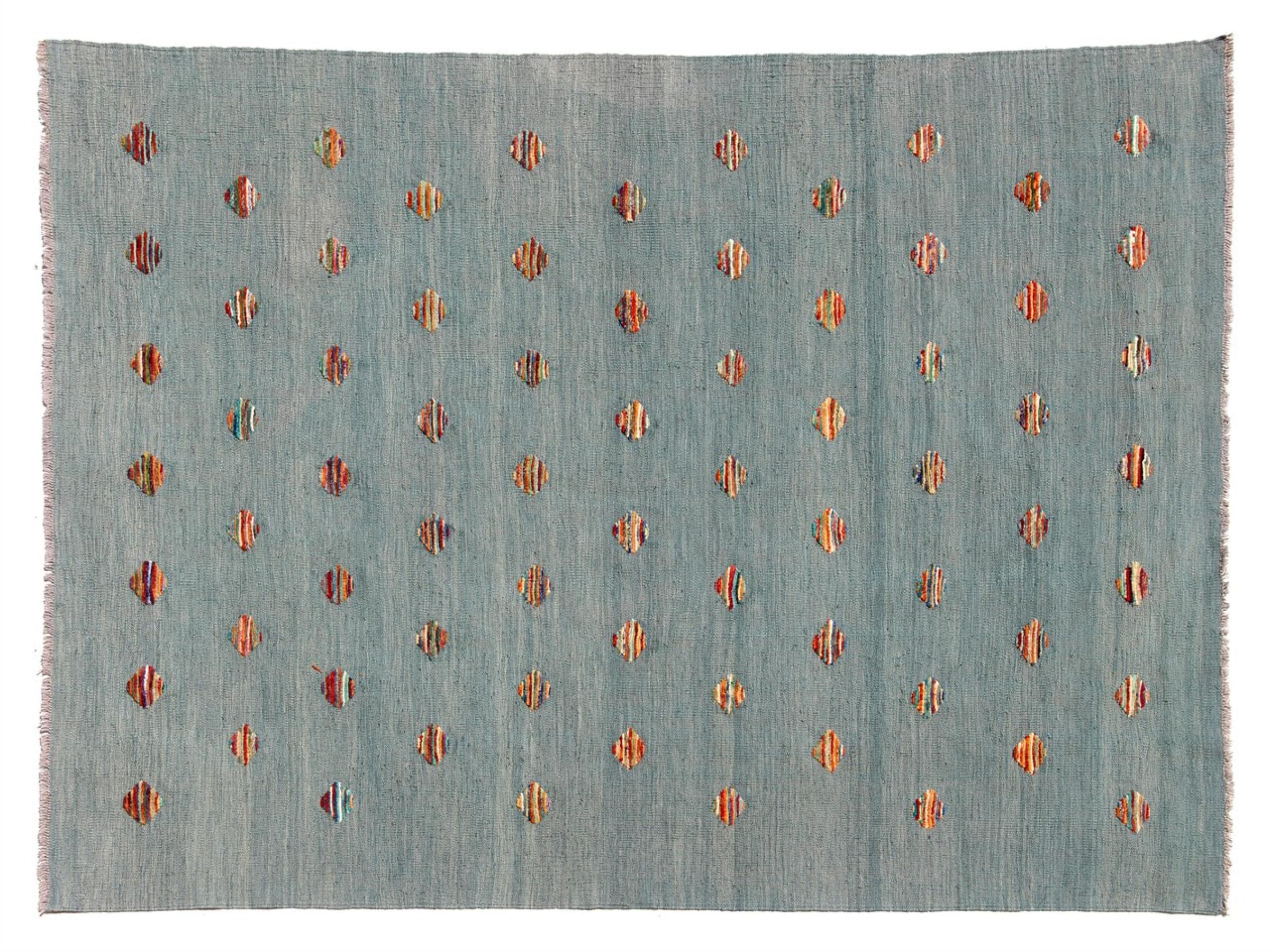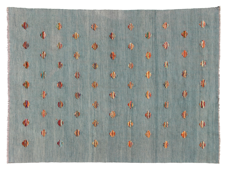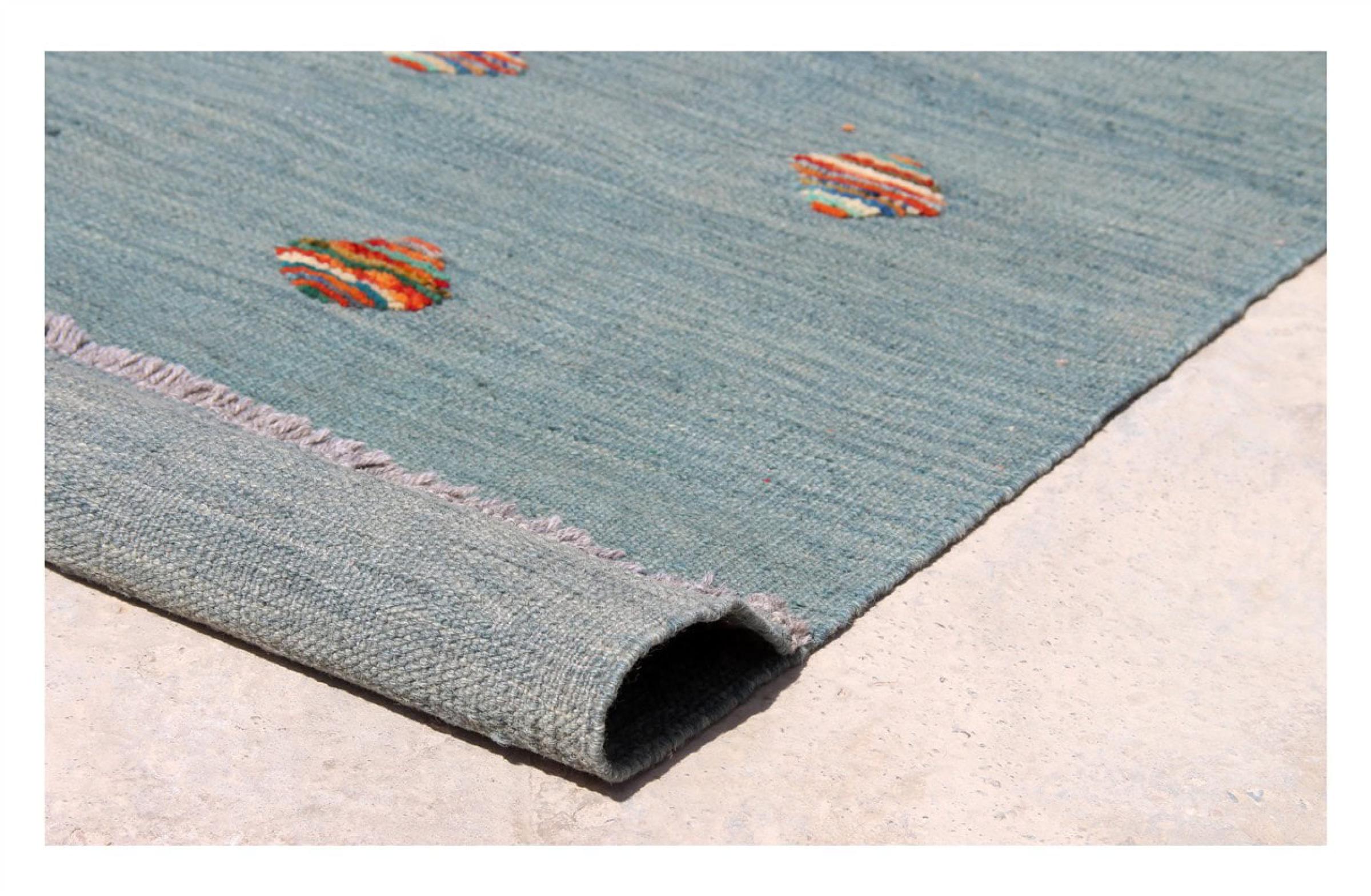 Esta alfombra fue hecha a mano en un telar como un tejido plano. Tejido plano es el término utilizado para describir las alfombras que no tienen pelo. Como el nombre promete, estas alfombras están tejidas y no anudadas. Esto resulta en una alfombra plana con una superficie estructurada. Los tejidos planos no son tan suaves y normalmente más delgados que las alfombras anudadas. Al mismo tiempo, su fabricación es mucho menos compleja y por lo general se pueden disponer por ambos lados (frontal y posterior). Sus patrones suelen ser geométricos, lo cual está determinado por el tejido.