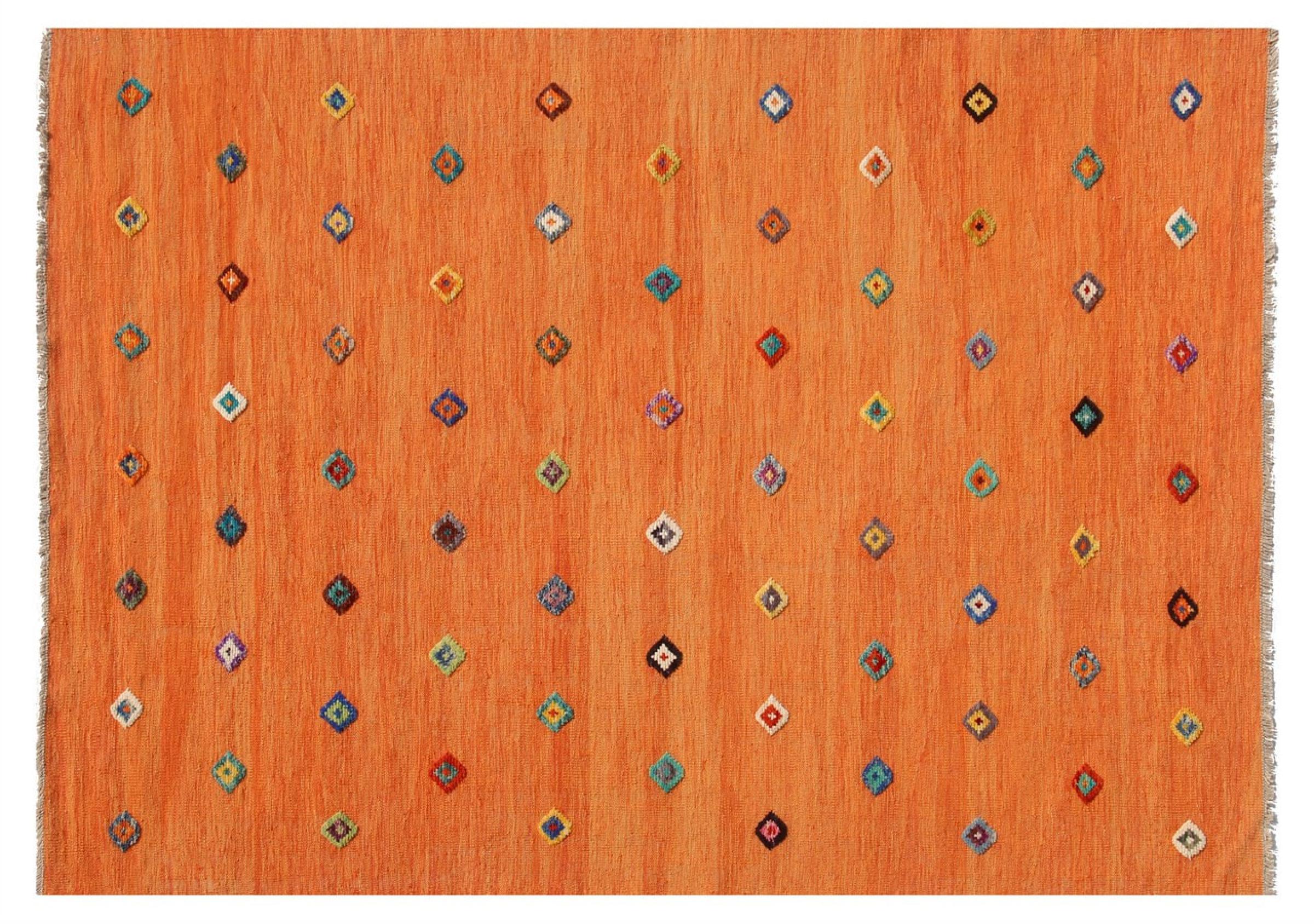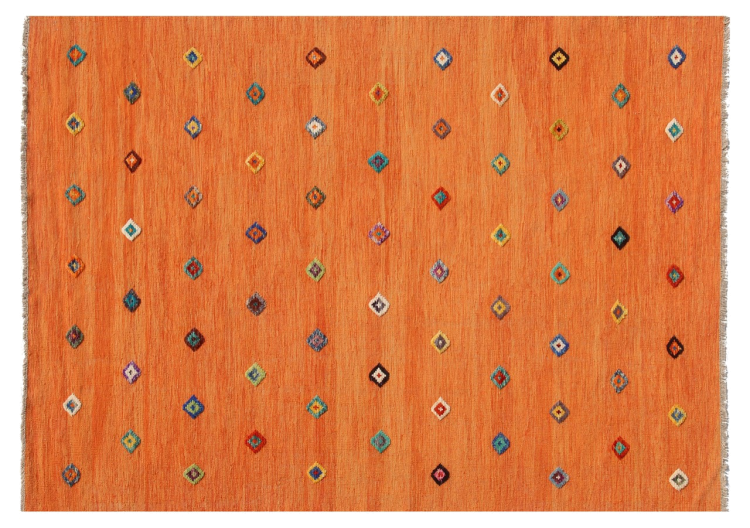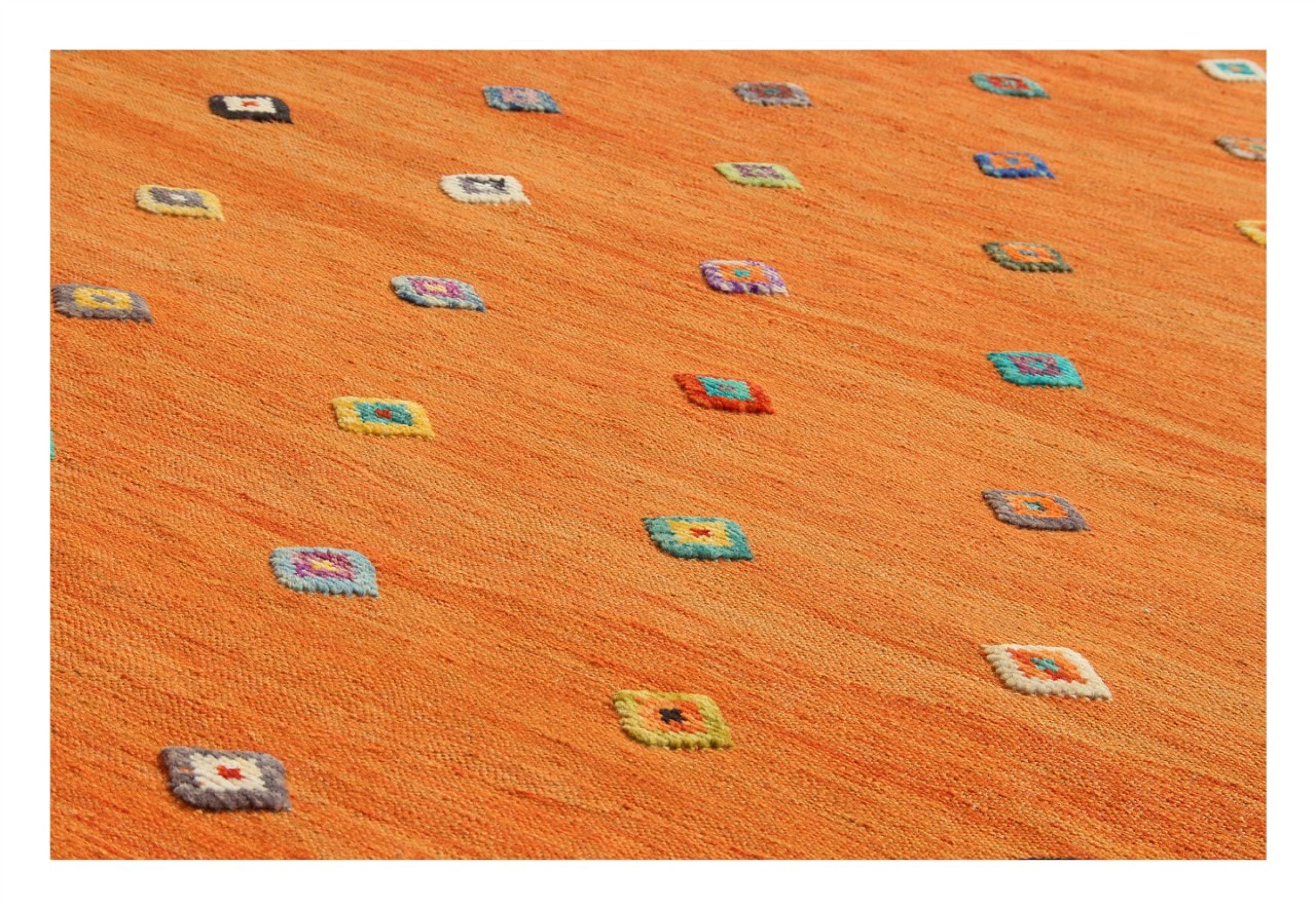 Esta alfombra fue hecha a mano en un telar como un tejido plano. Tejido plano es el término utilizado para describir las alfombras que no tienen pelo. Como el nombre promete, estas alfombras están tejidas y no anudadas. Esto resulta en una alfombra plana con una superficie estructurada. Los tejidos planos no son tan suaves y normalmente más delgados que las alfombras anudadas. Al mismo tiempo, su fabricación es mucho menos compleja y por lo general se pueden disponer por ambos lados (frontal y posterior). Sus patrones suelen ser geométricos, lo cual está determinado por el tejido.