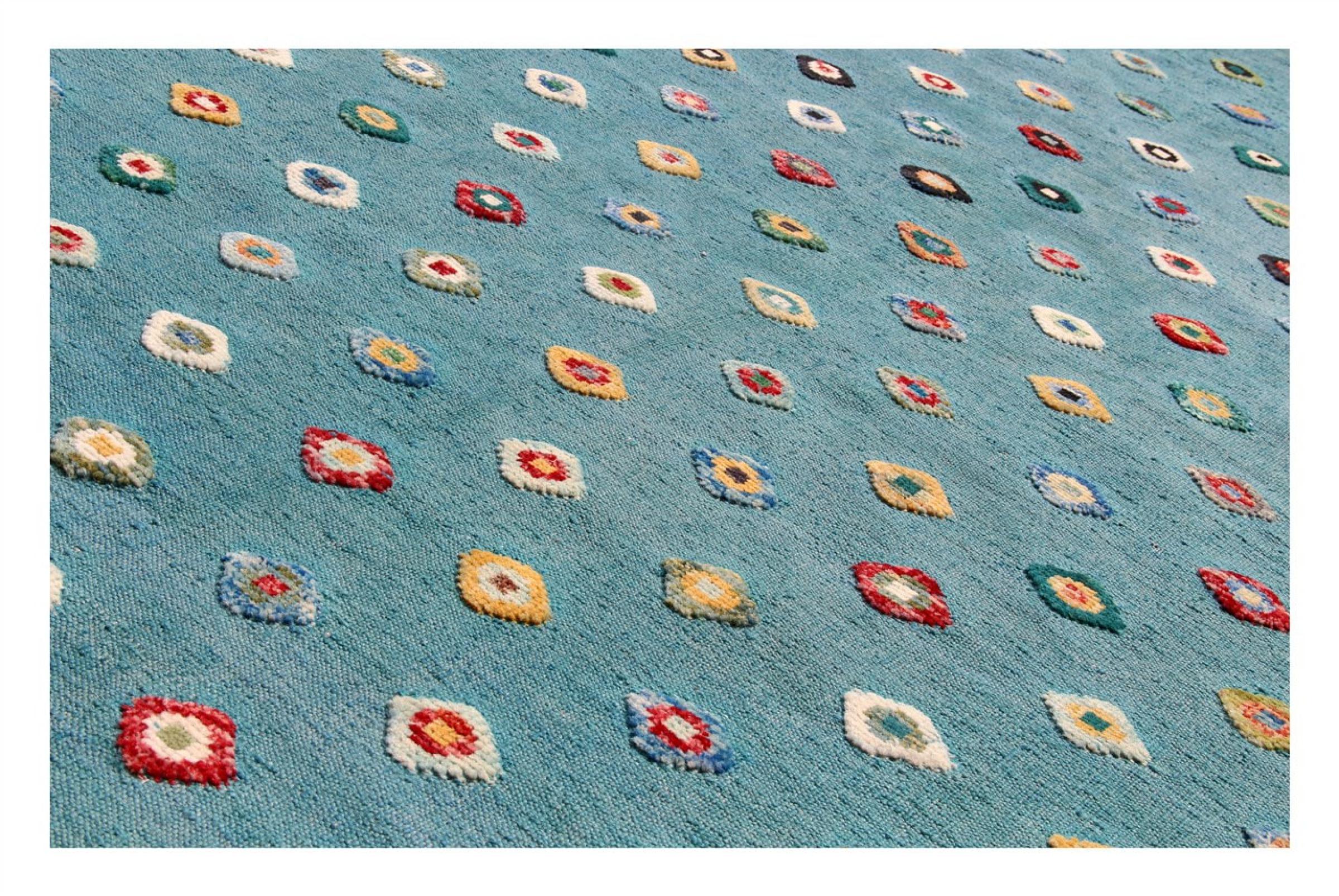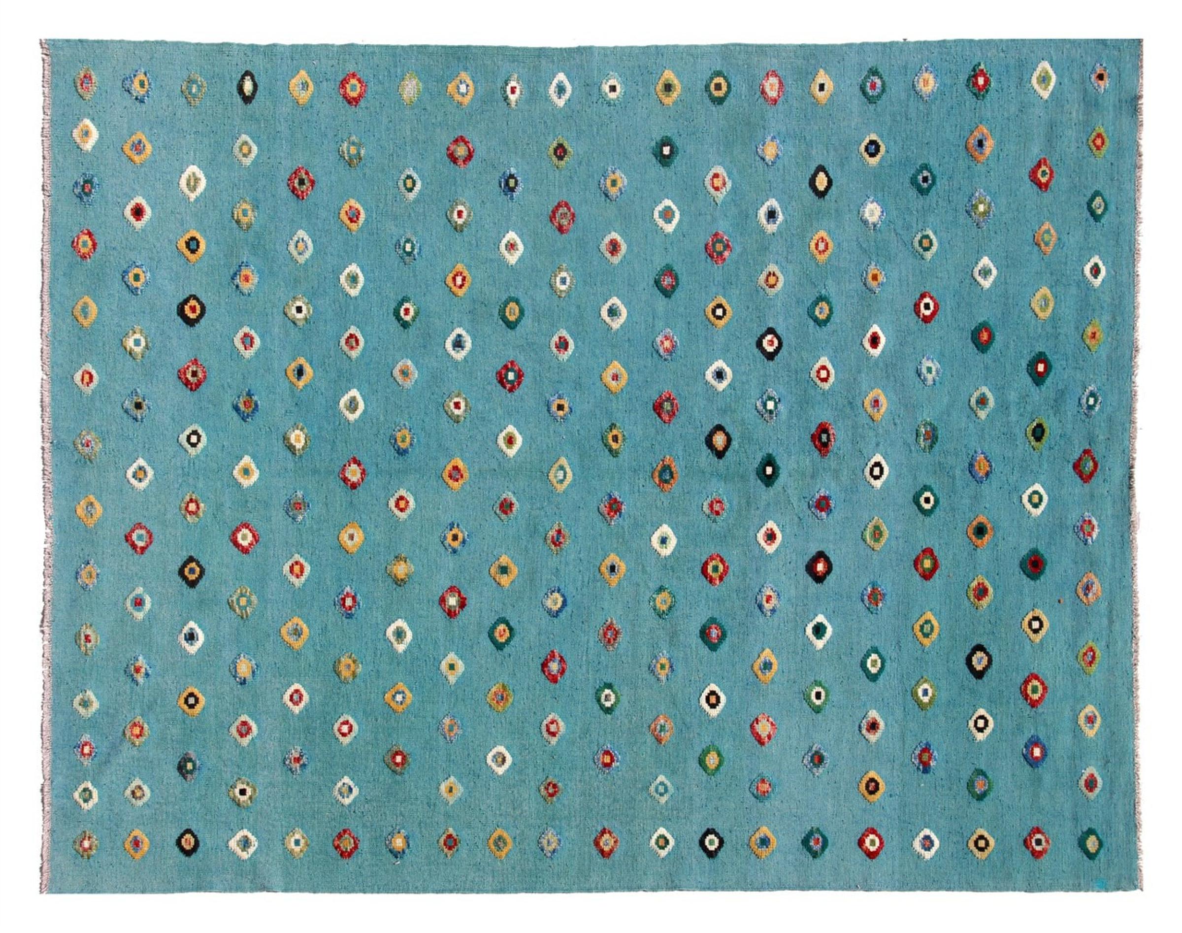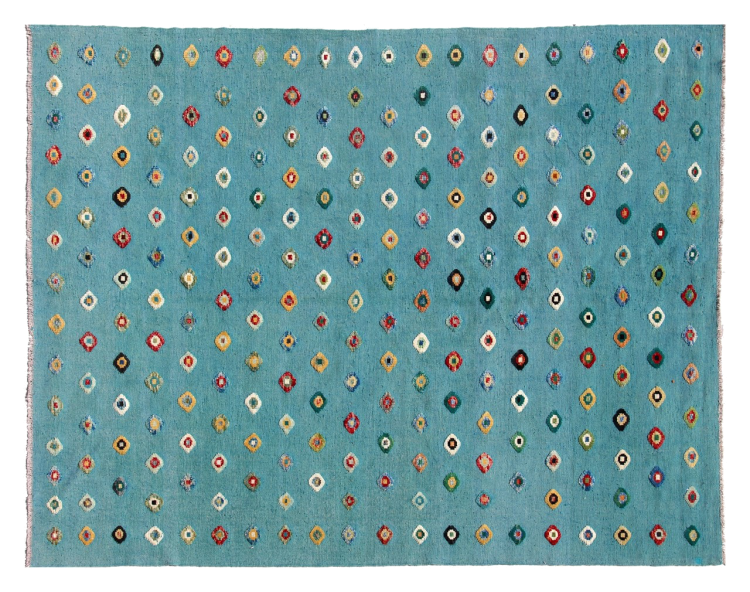 Esta alfombra fue hecha a mano en un telar como un tejido plano. Tejido plano es el término utilizado para describir las alfombras que no tienen pelo. Como el nombre promete, estas alfombras están tejidas y no anudadas. Esto resulta en una alfombra plana con una superficie estructurada. Los tejidos planos no son tan suaves y normalmente más delgados que las alfombras anudadas. Al mismo tiempo, su fabricación es mucho menos compleja y por lo general se pueden disponer por ambos lados (frontal y posterior). Sus patrones suelen ser geométricos, lo cual está determinado por el tejido.