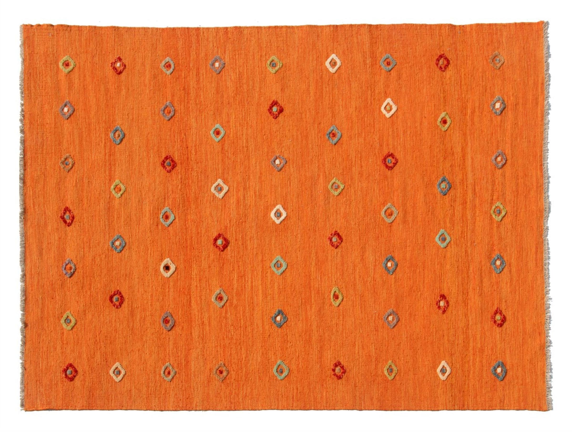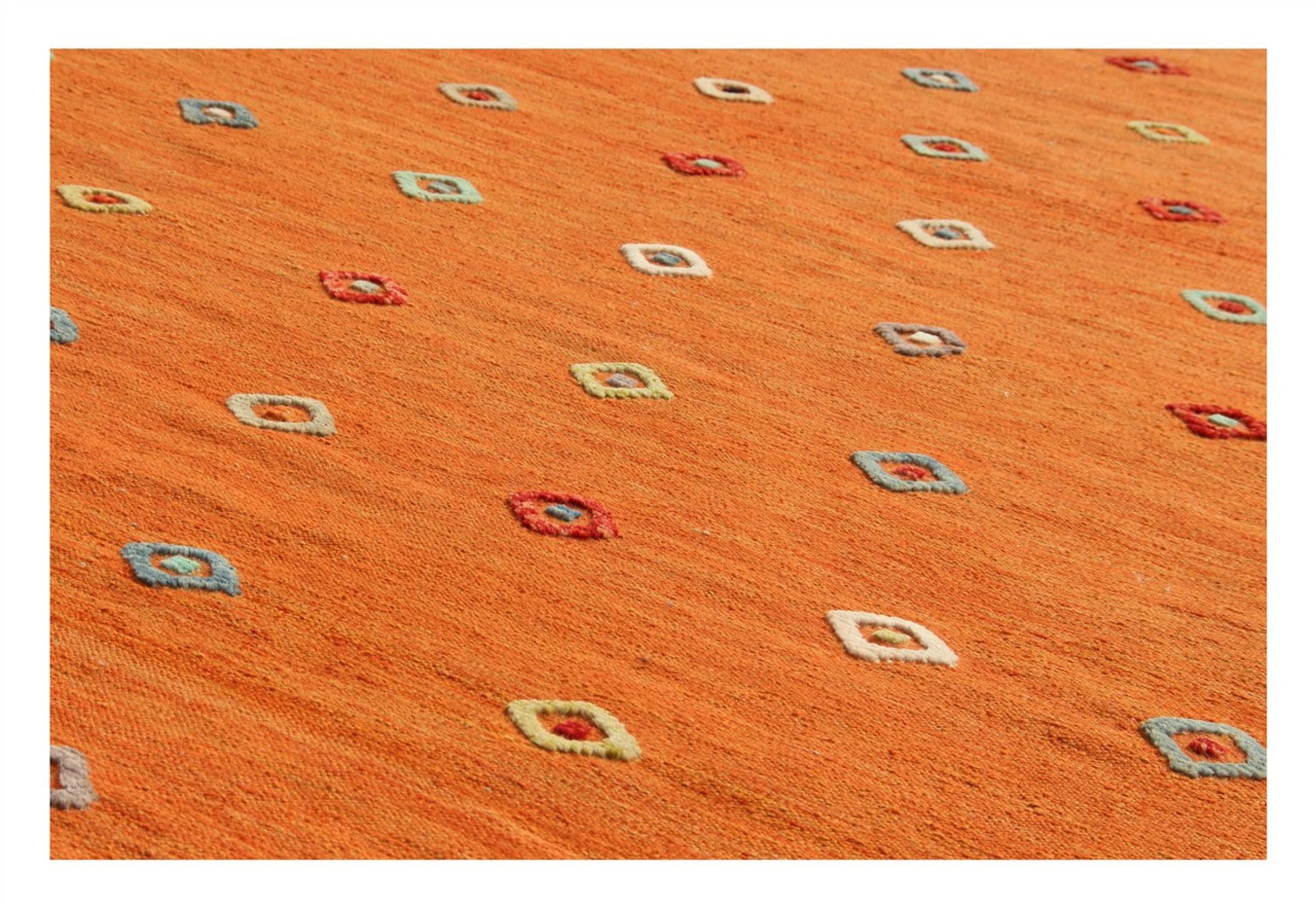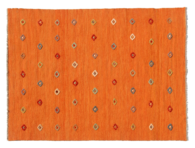 Esta alfombra fue hecha a mano en un telar como un tejido plano. Tejido plano es el término utilizado para describir las alfombras que no tienen pelo. Como el nombre promete, estas alfombras están tejidas y no anudadas. Esto resulta en una alfombra plana con una superficie estructurada. Los tejidos planos no son tan suaves y normalmente más delgados que las alfombras anudadas. Al mismo tiempo, su fabricación es mucho menos compleja y por lo general se pueden disponer por ambos lados (frontal y posterior). Sus patrones suelen ser geométricos, lo cual está determinado por el tejido.