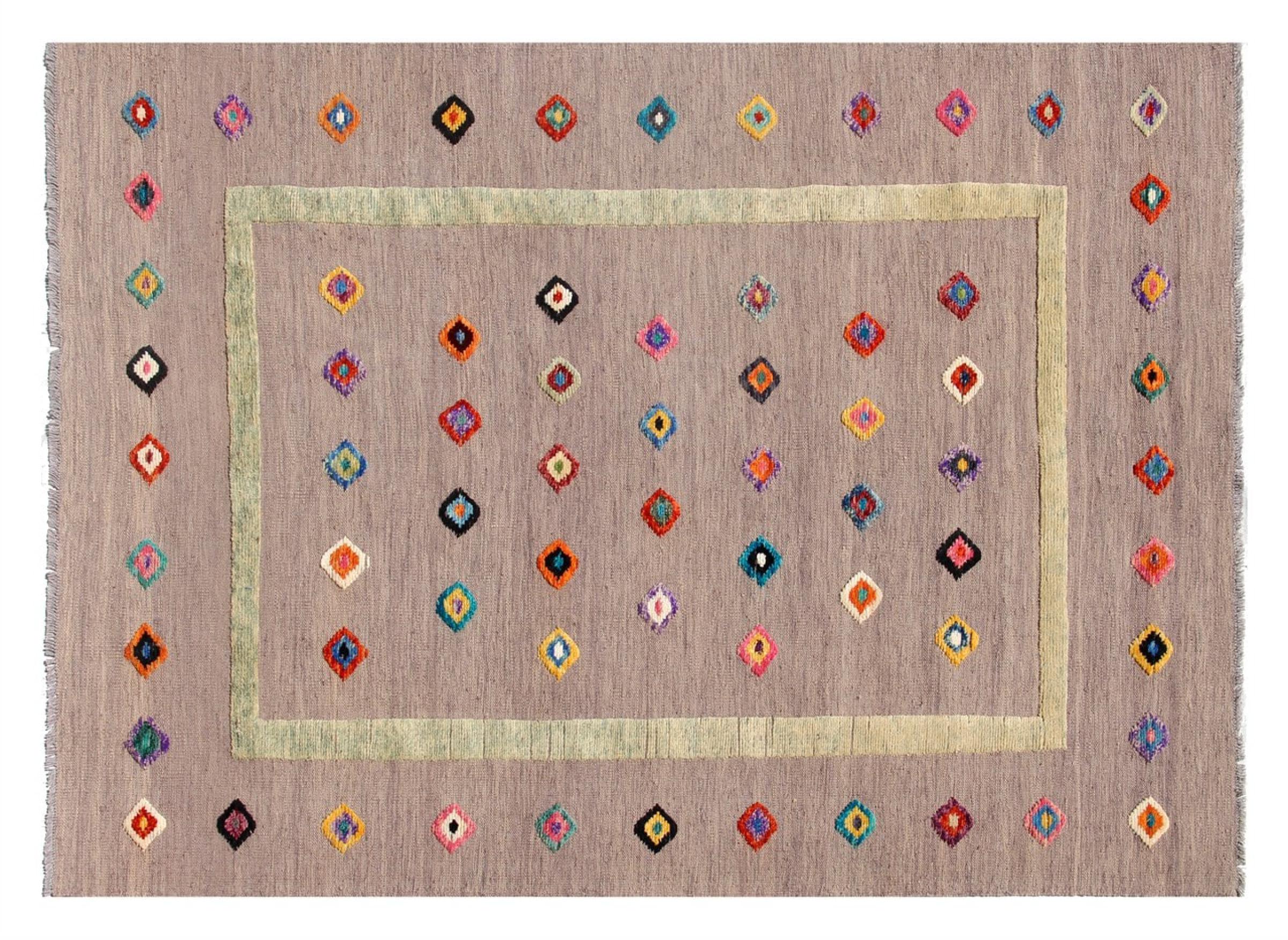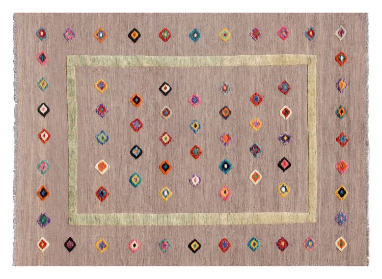 Esta alfombra fue hecha a mano en un telar como un tejido plano. Tejido plano es el término utilizado para describir las alfombras que no tienen pelo. Como el nombre promete, estas alfombras están tejidas y no anudadas. Esto resulta en una alfombra plana con una superficie estructurada. Los tejidos planos no son tan suaves y normalmente más delgados que las alfombras anudadas. Al mismo tiempo, su fabricación es mucho menos compleja y por lo general se pueden disponer por ambos lados (frontal y posterior). Sus patrones suelen ser geométricos, lo cual está determinado por el tejido.