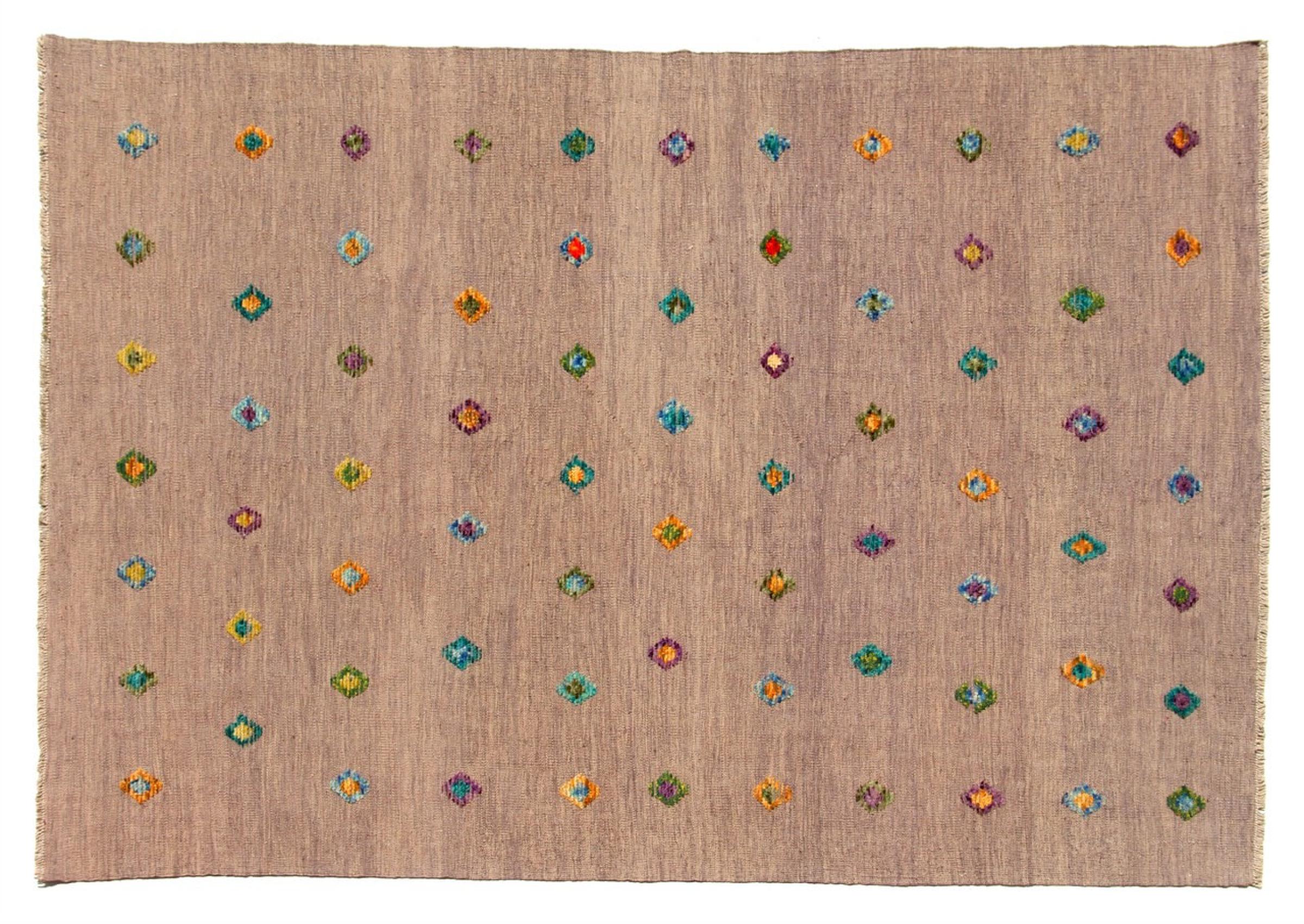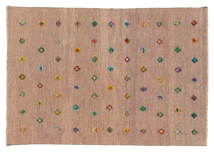 Esta alfombra fue hecha a mano en un telar como un tejido plano. Tejido plano es el término utilizado para describir las alfombras que no tienen pelo. Como el nombre promete, estas alfombras están tejidas y no anudadas. Esto resulta en una alfombra plana con una superficie estructurada. Los tejidos planos no son tan suaves y normalmente más delgados que las alfombras anudadas. Al mismo tiempo, su fabricación es mucho menos compleja y por lo general se pueden disponer por ambos lados (frontal y posterior). Sus patrones suelen ser geométricos, lo cual está determinado por el tejido.