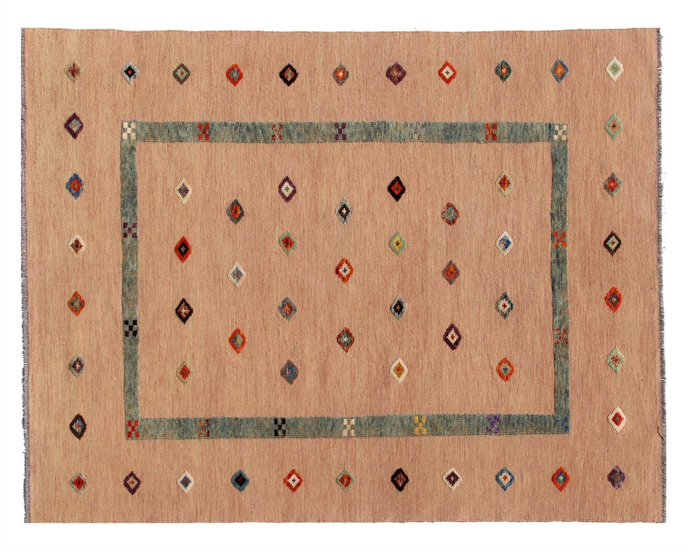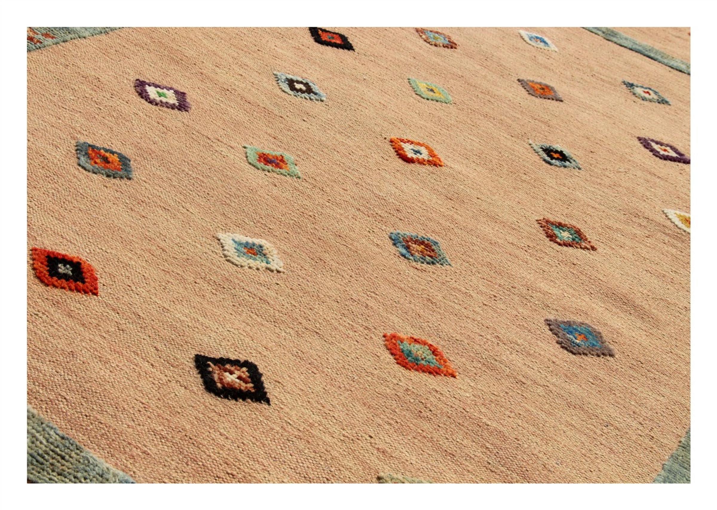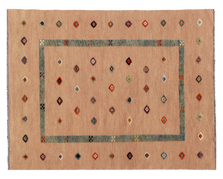 Esta alfombra fue hecha a mano en un telar como un tejido plano. Tejido plano es el término utilizado para describir las alfombras que no tienen pelo. Como el nombre promete, estas alfombras están tejidas y no anudadas. Esto resulta en una alfombra plana con una superficie estructurada. Los tejidos planos no son tan suaves y normalmente más delgados que las alfombras anudadas. Al mismo tiempo, su fabricación es mucho menos compleja y por lo general se pueden disponer por ambos lados (frontal y posterior). Sus patrones suelen ser geométricos, lo cual está determinado por el tejido.