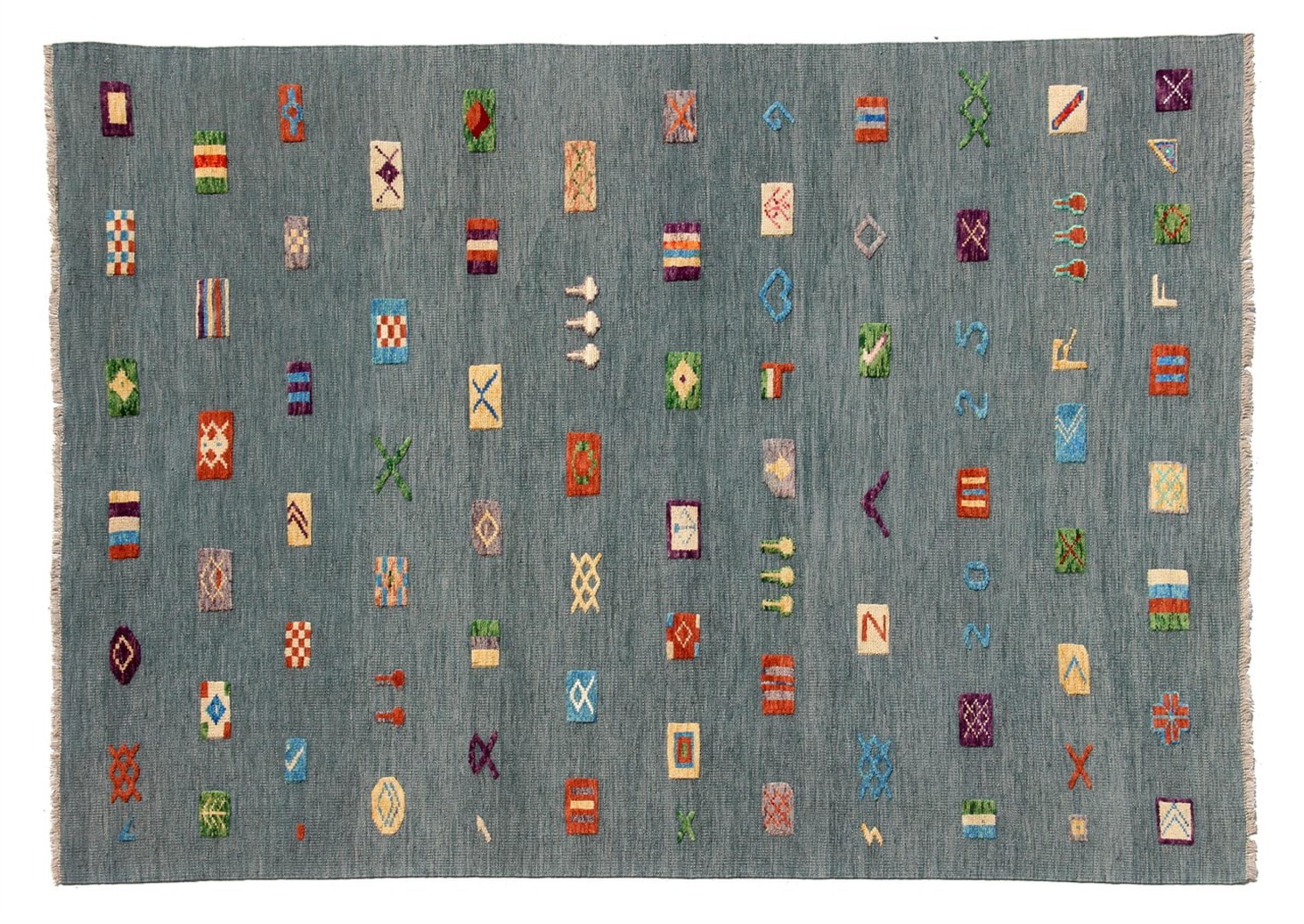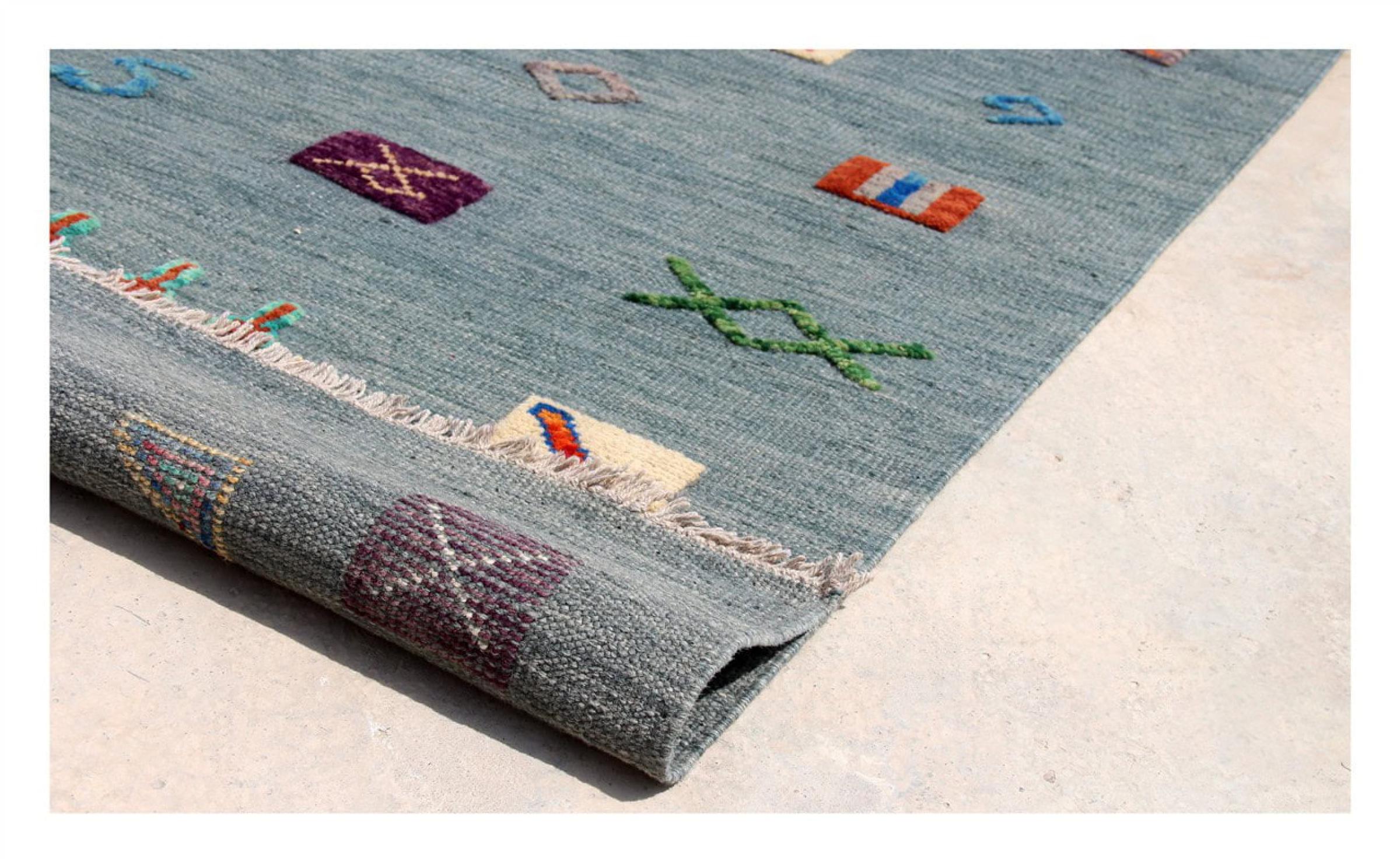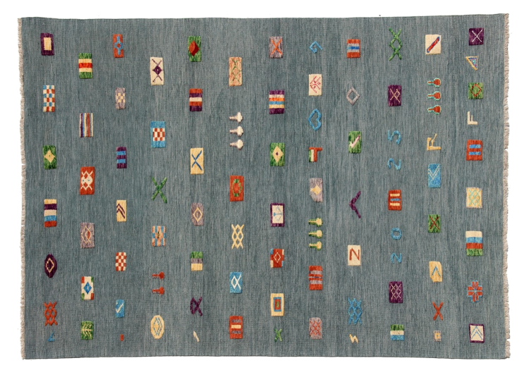 Esta alfombra fue hecha a mano en un telar como un tejido plano. Tejido plano es el término utilizado para describir las alfombras que no tienen pelo. Como el nombre promete, estas alfombras están tejidas y no anudadas. Esto resulta en una alfombra plana con una superficie estructurada. Los tejidos planos no son tan suaves y normalmente más delgados que las alfombras anudadas. Al mismo tiempo, su fabricación es mucho menos compleja y por lo general se pueden disponer por ambos lados (frontal y posterior). Sus patrones suelen ser geométricos, lo cual está determinado por el tejido.