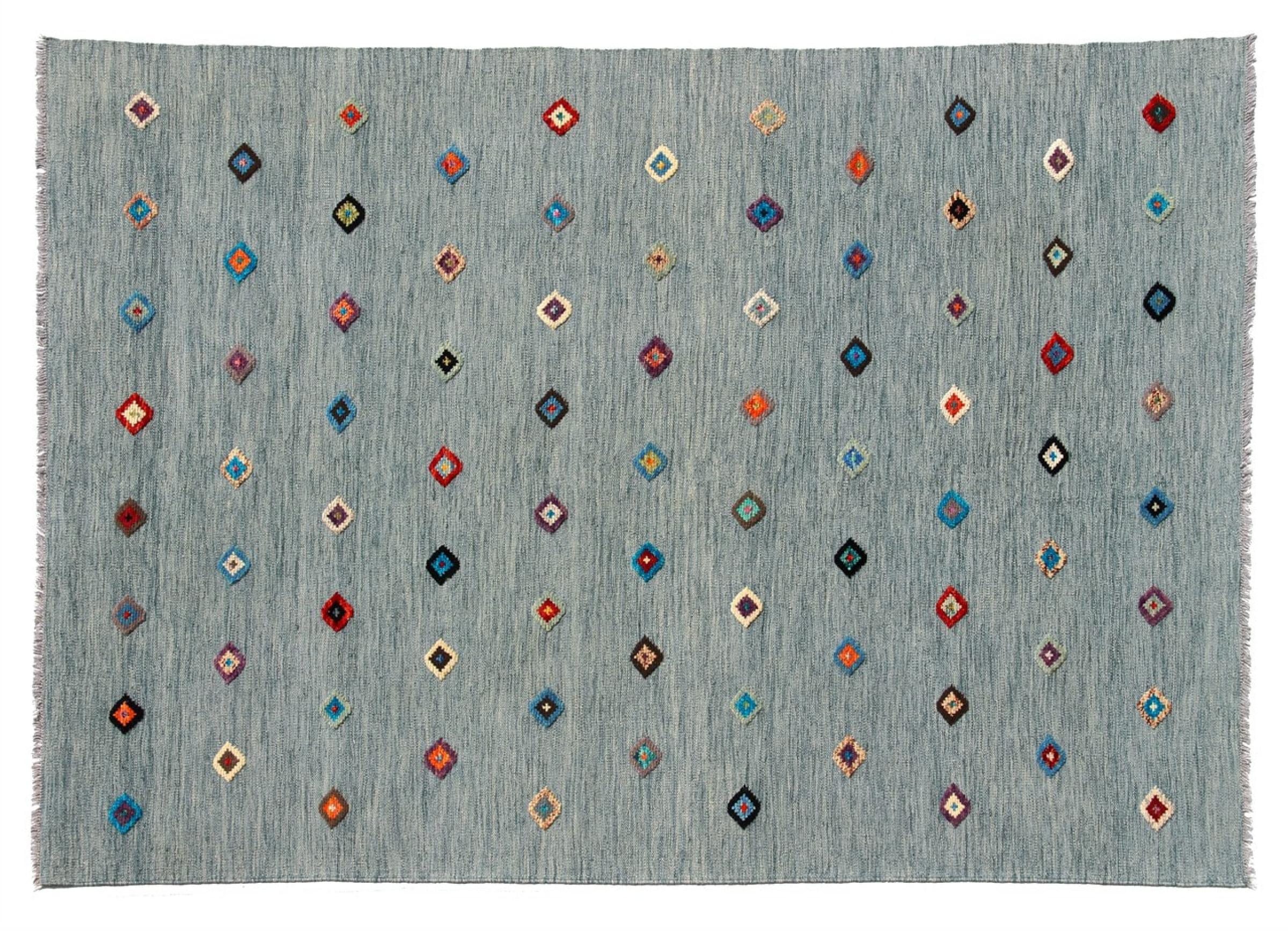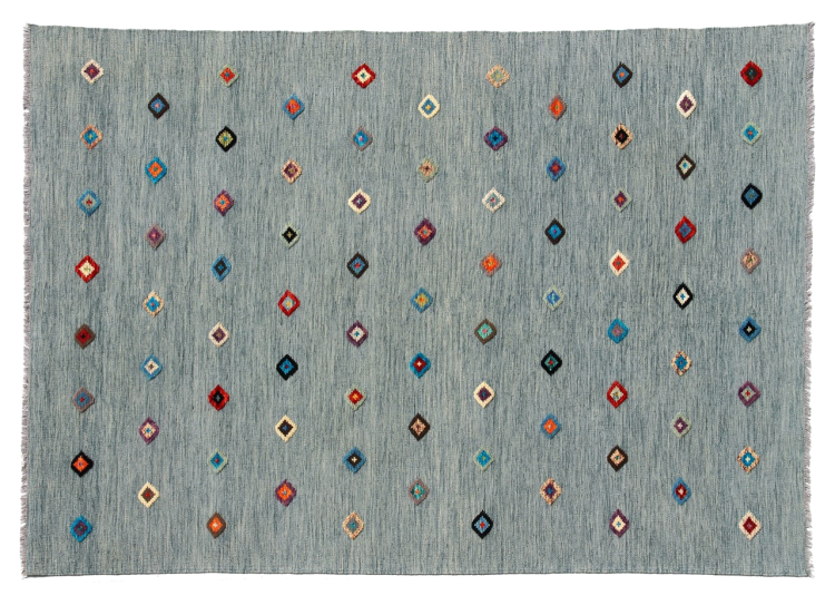 Esta alfombra fue hecha a mano en un telar como un tejido plano. Tejido plano es el término utilizado para describir las alfombras que no tienen pelo. Como el nombre promete, estas alfombras están tejidas y no anudadas. Esto resulta en una alfombra plana con una superficie estructurada. Los tejidos planos no son tan suaves y normalmente más delgados que las alfombras anudadas. Al mismo tiempo, su fabricación es mucho menos compleja y por lo general se pueden disponer por ambos lados (frontal y posterior). Sus patrones suelen ser geométricos, lo cual está determinado por el tejido.