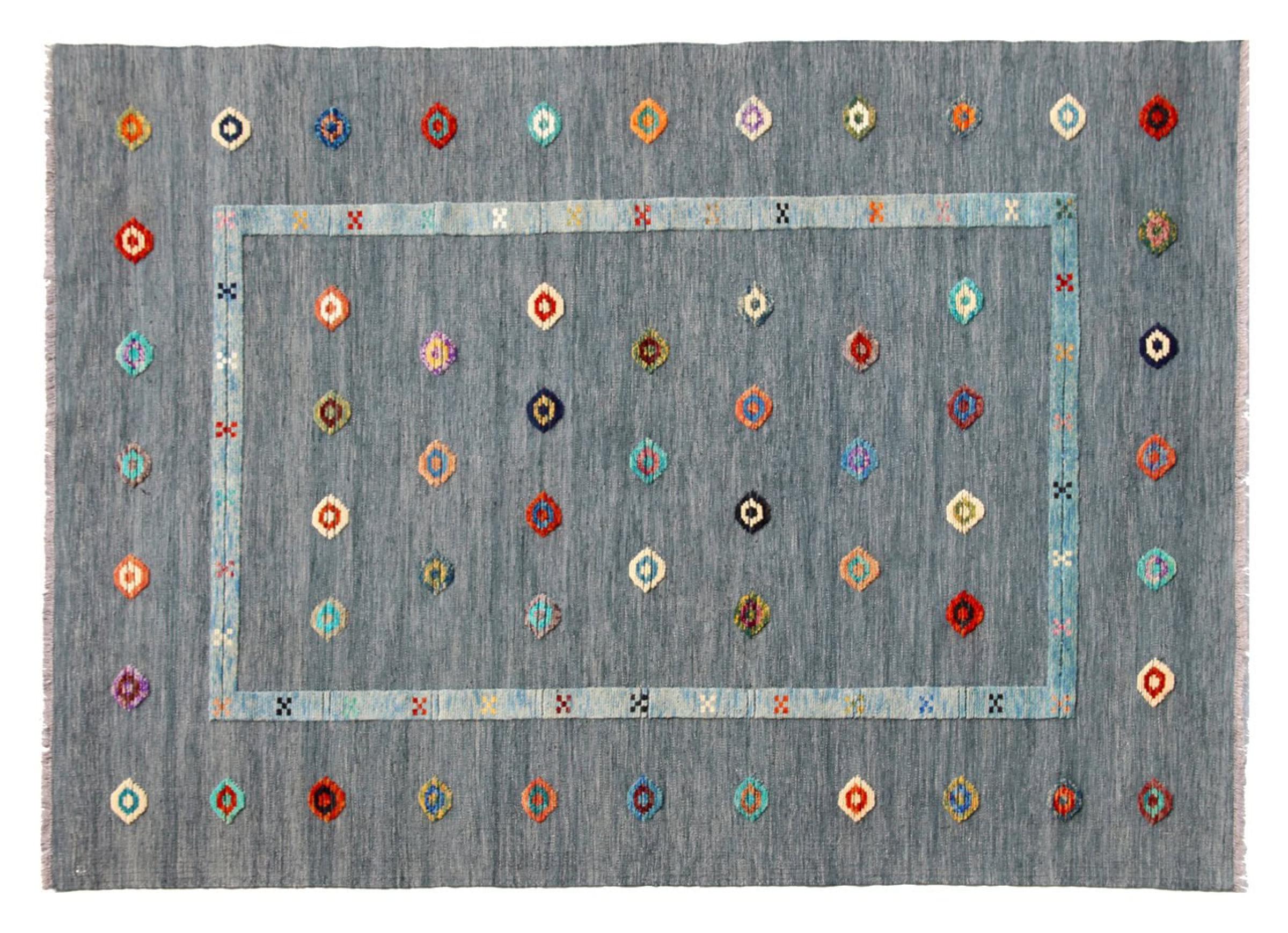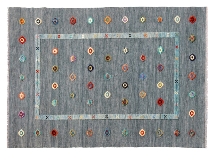 Esta alfombra fue hecha a mano en un telar como un tejido plano. Tejido plano es el término utilizado para describir las alfombras que no tienen pelo. Como el nombre promete, estas alfombras están tejidas y no anudadas. Esto resulta en una alfombra plana con una superficie estructurada. Los tejidos planos no son tan suaves y normalmente más delgados que las alfombras anudadas. Al mismo tiempo, su fabricación es mucho menos compleja y por lo general se pueden disponer por ambos lados (frontal y posterior). Sus patrones suelen ser geométricos, lo cual está determinado por el tejido.