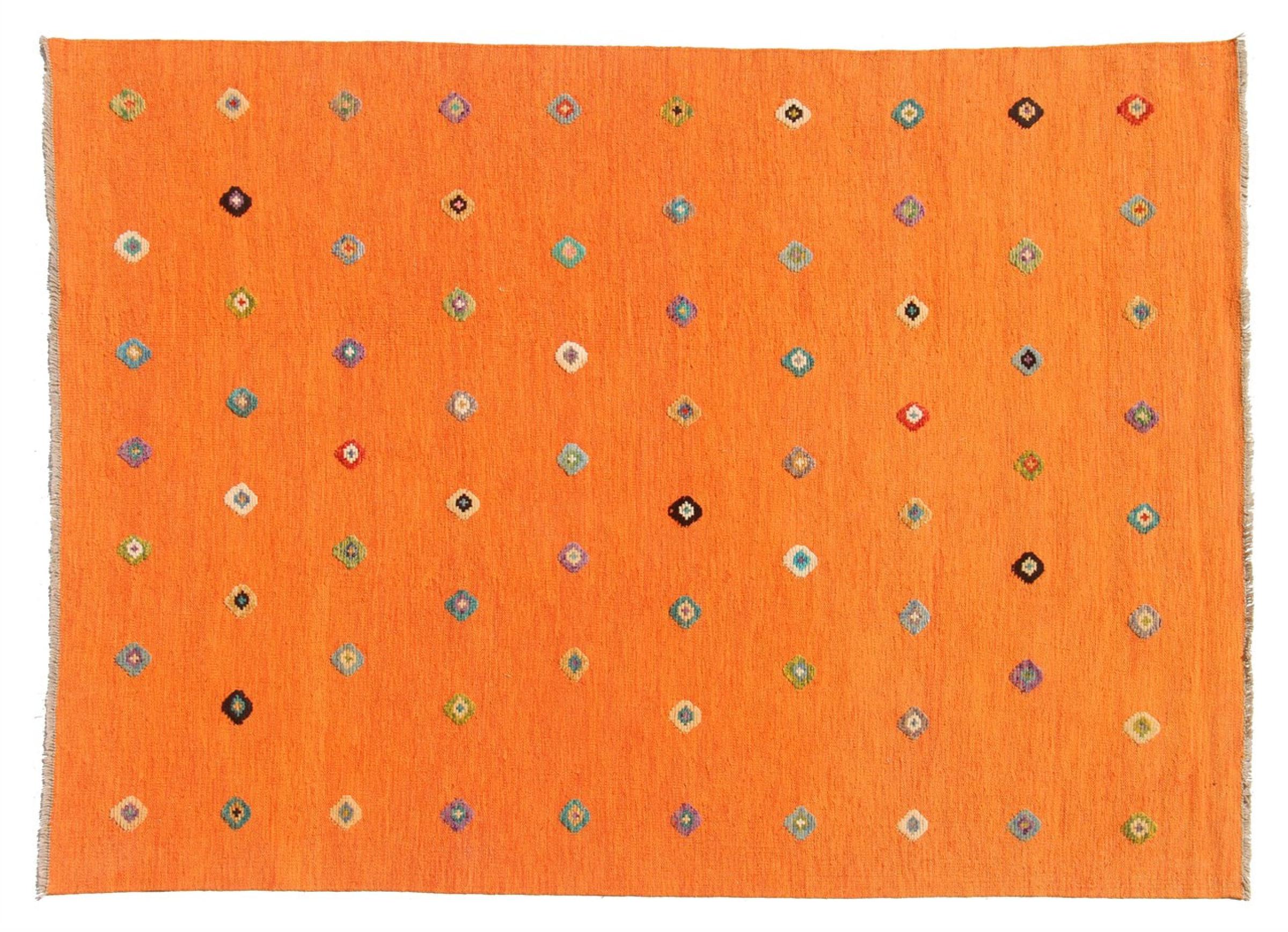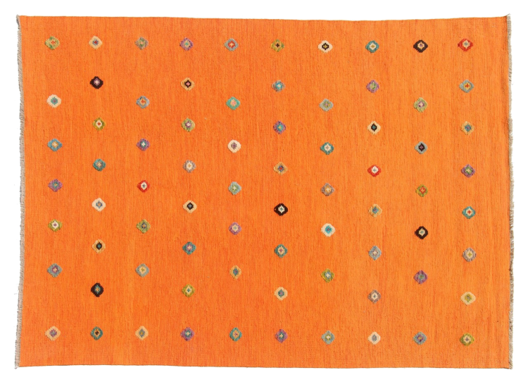 Esta alfombra fue hecha a mano en un telar como un tejido plano. Tejido plano es el término utilizado para describir las alfombras que no tienen pelo. Como el nombre promete, estas alfombras están tejidas y no anudadas. Esto resulta en una alfombra plana con una superficie estructurada. Los tejidos planos no son tan suaves y normalmente más delgados que las alfombras anudadas. Al mismo tiempo, su fabricación es mucho menos compleja y por lo general se pueden disponer por ambos lados (frontal y posterior). Sus patrones suelen ser geométricos, lo cual está determinado por el tejido.