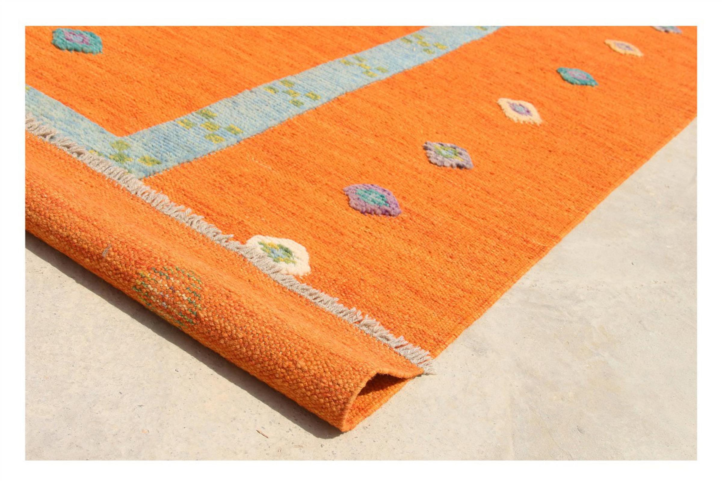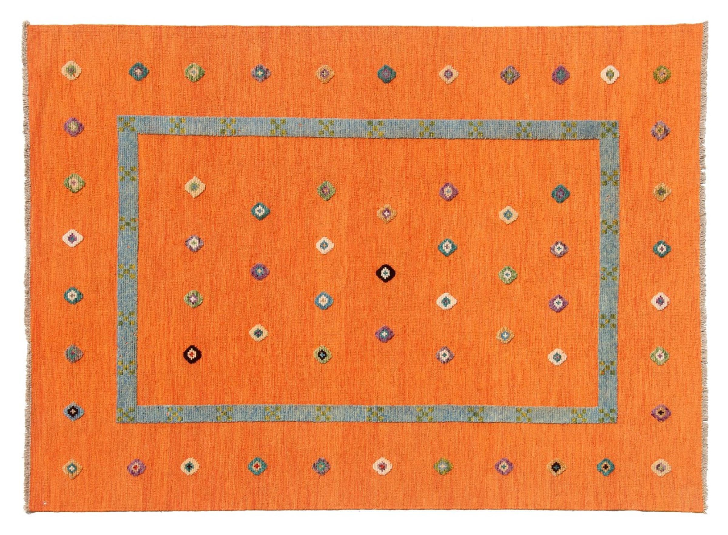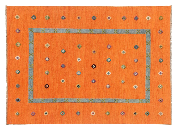 Esta alfombra fue hecha a mano en un telar como un tejido plano. Tejido plano es el término utilizado para describir las alfombras que no tienen pelo. Como el nombre promete, estas alfombras están tejidas y no anudadas. Esto resulta en una alfombra plana con una superficie estructurada. Los tejidos planos no son tan suaves y normalmente más delgados que las alfombras anudadas. Al mismo tiempo, su fabricación es mucho menos compleja y por lo general se pueden disponer por ambos lados (frontal y posterior). Sus patrones suelen ser geométricos, lo cual está determinado por el tejido.