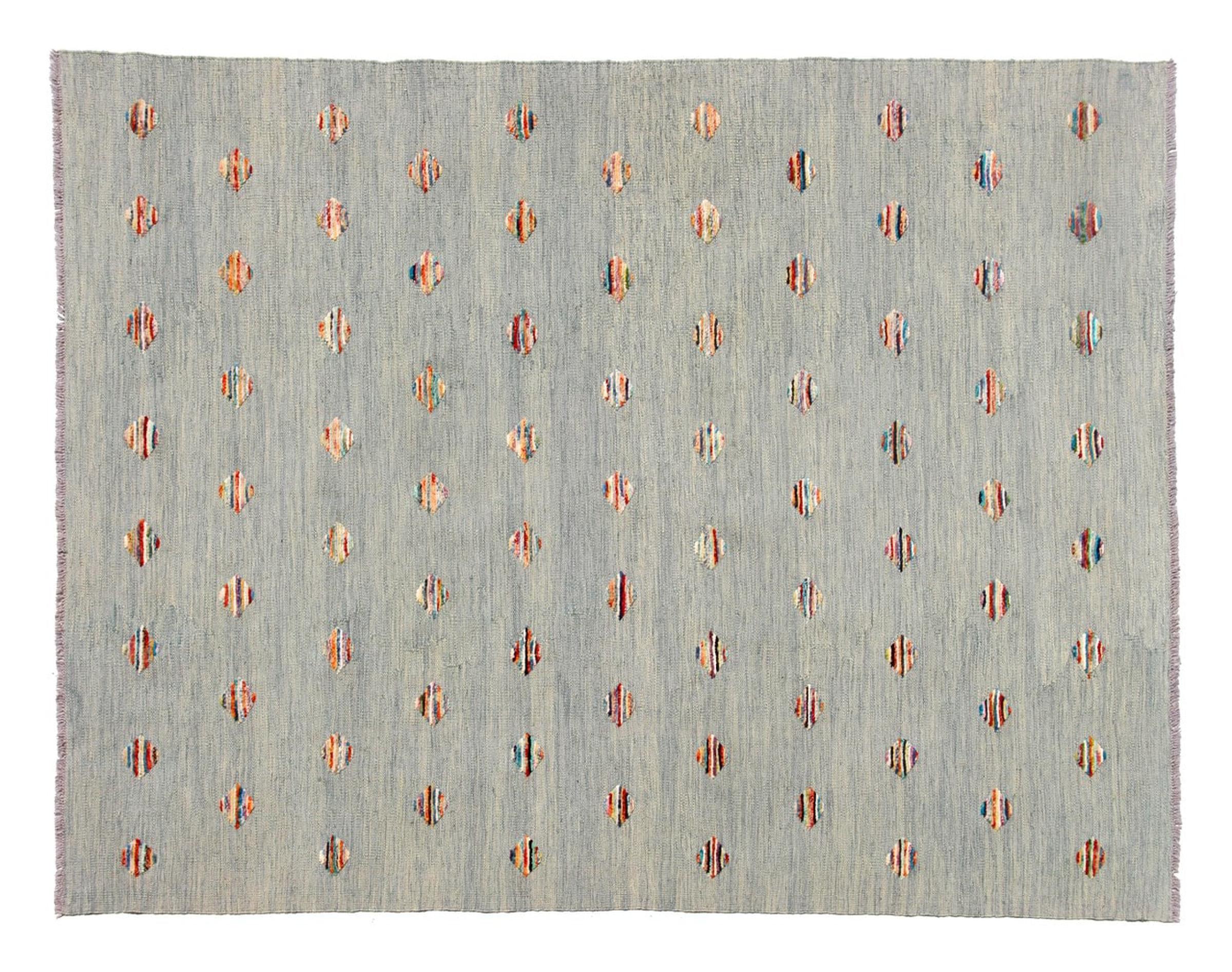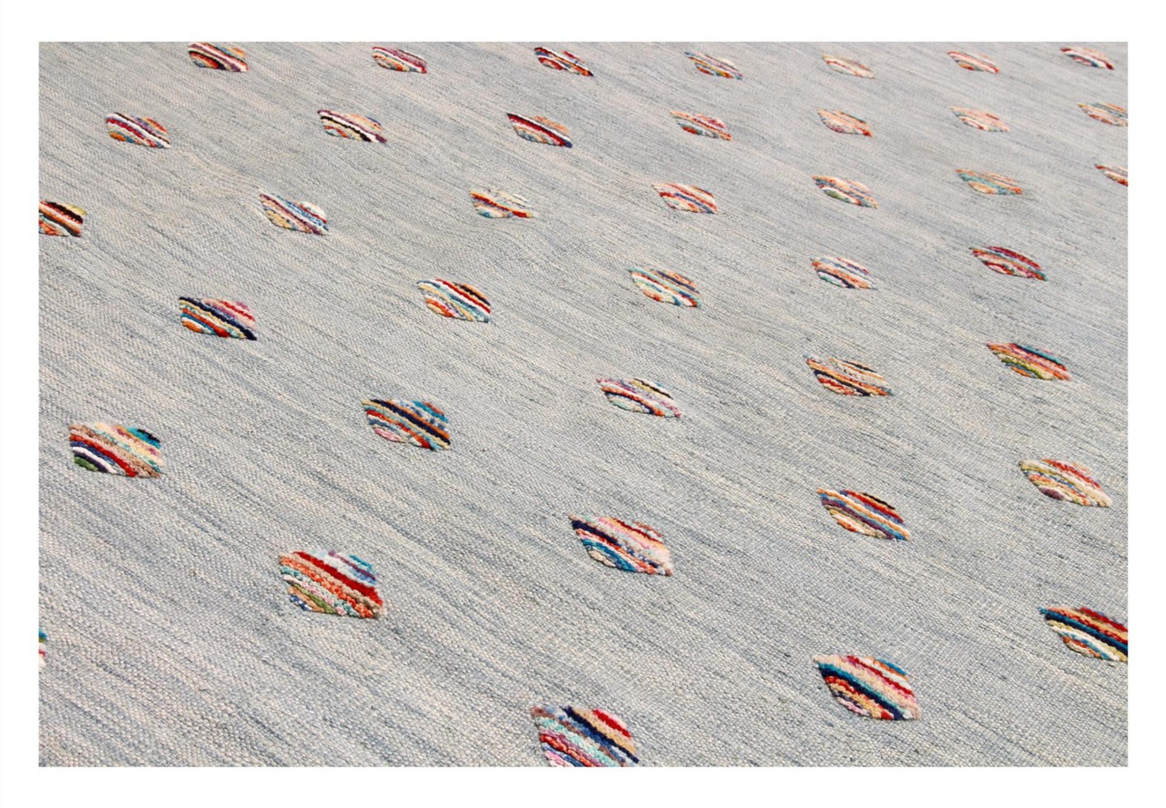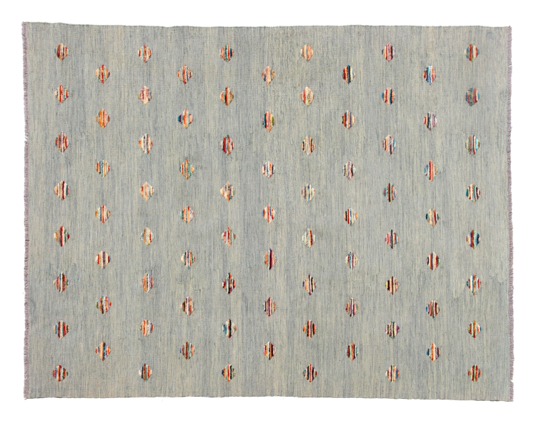 Esta alfombra fue hecha a mano en un telar como un tejido plano. Tejido plano es el término utilizado para describir las alfombras que no tienen pelo. Como el nombre promete, estas alfombras están tejidas y no anudadas. Esto resulta en una alfombra plana con una superficie estructurada. Los tejidos planos no son tan suaves y normalmente más delgados que las alfombras anudadas. Al mismo tiempo, su fabricación es mucho menos compleja y por lo general se pueden disponer por ambos lados (frontal y posterior). Sus patrones suelen ser geométricos, lo cual está determinado por el tejido.
