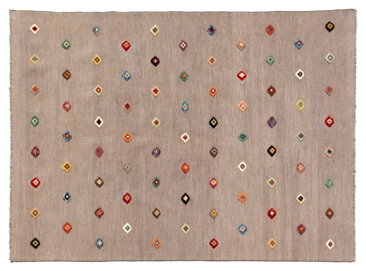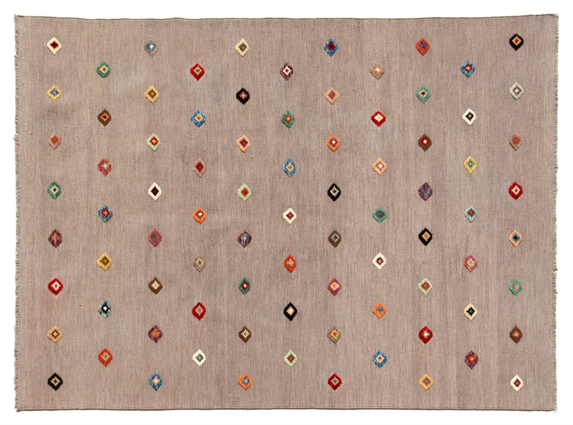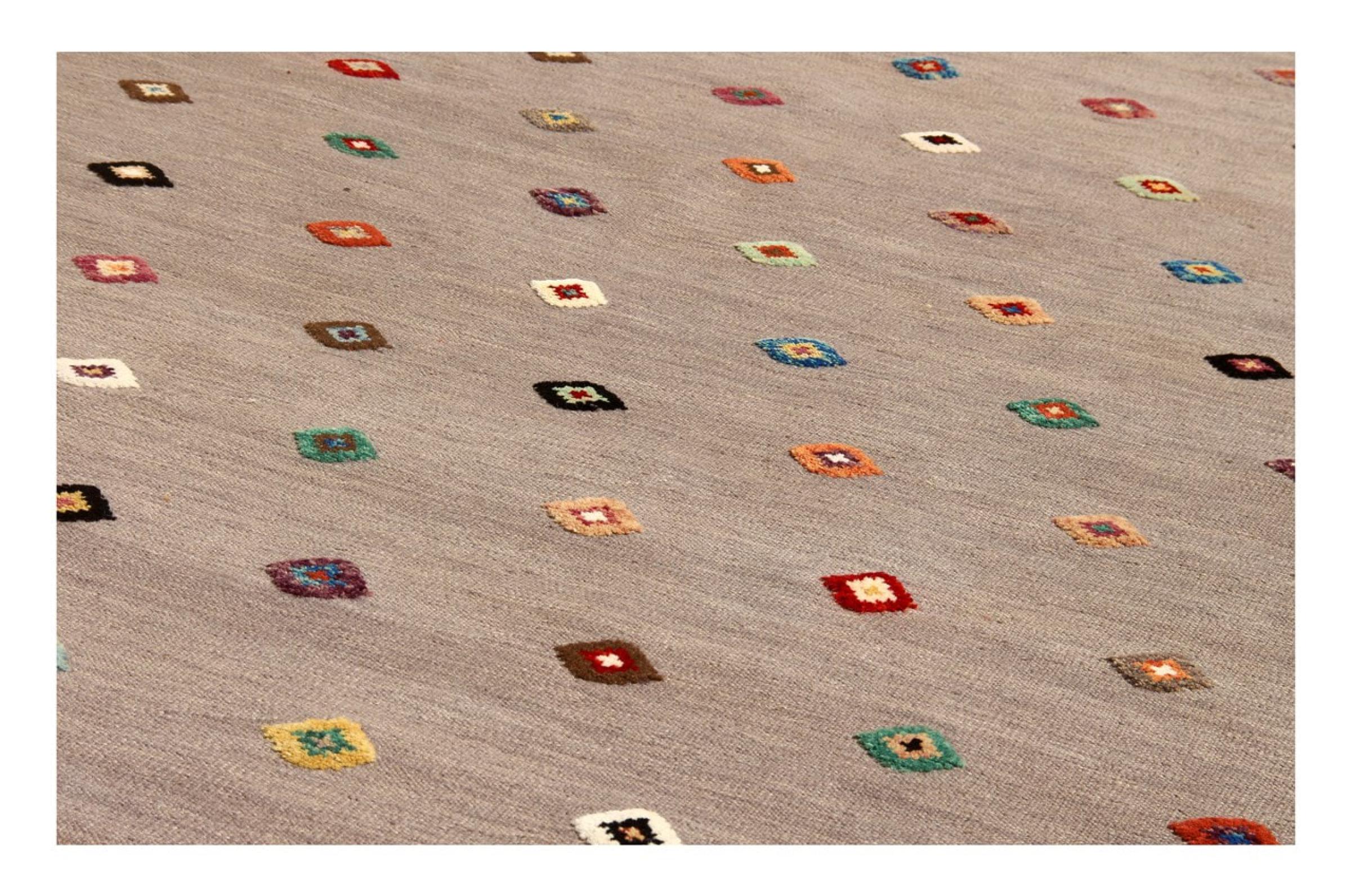 Esta alfombra fue hecha a mano en un telar como un tejido plano. Tejido plano es el término utilizado para describir las alfombras que no tienen pelo. Como el nombre promete, estas alfombras están tejidas y no anudadas. Esto resulta en una alfombra plana con una superficie estructurada. Los tejidos planos no son tan suaves y normalmente más delgados que las alfombras anudadas. Al mismo tiempo, su fabricación es mucho menos compleja y por lo general se pueden disponer por ambos lados (frontal y posterior). Sus patrones suelen ser geométricos, lo cual está determinado por el tejido.